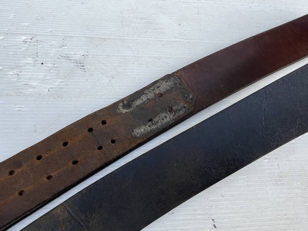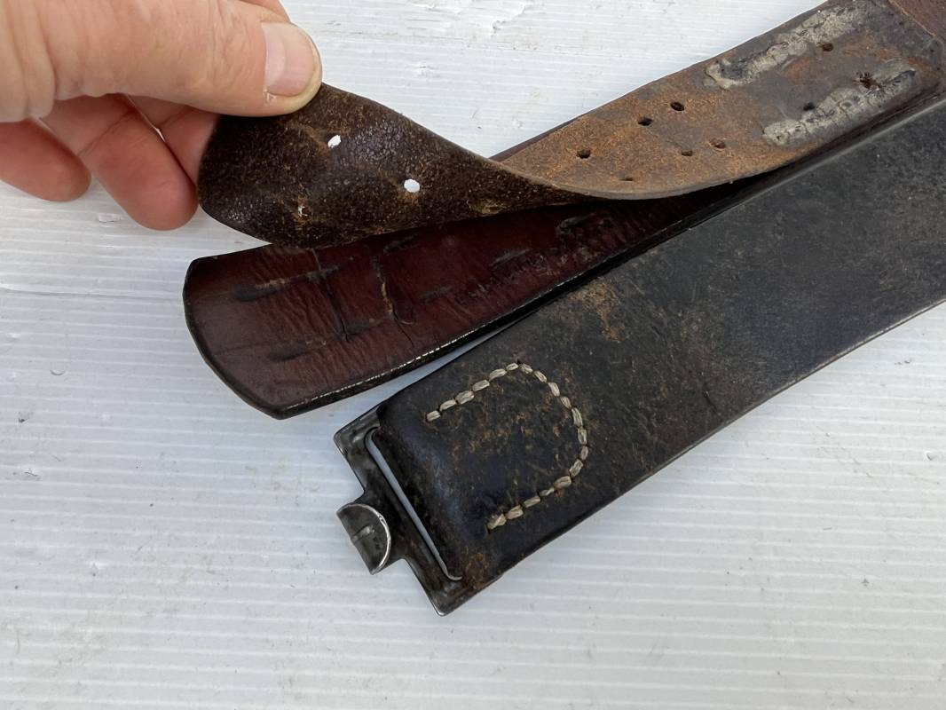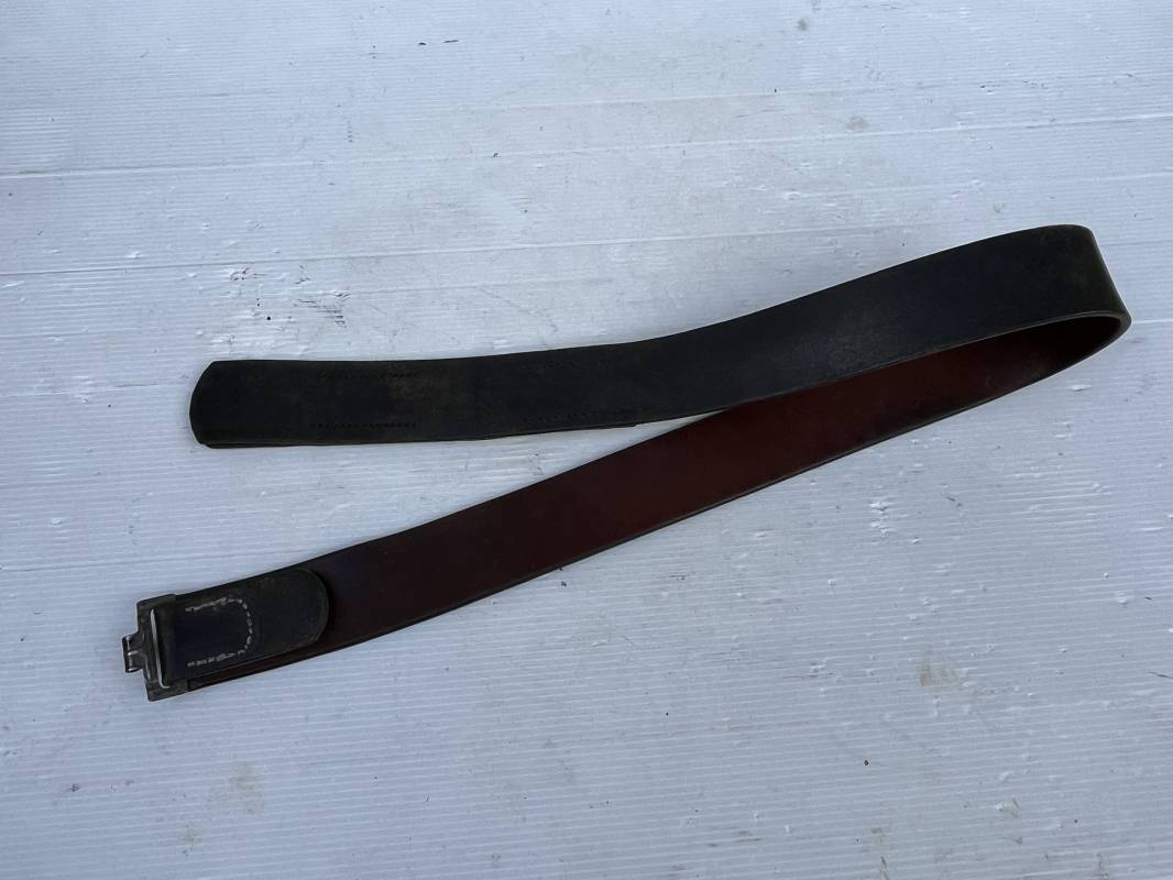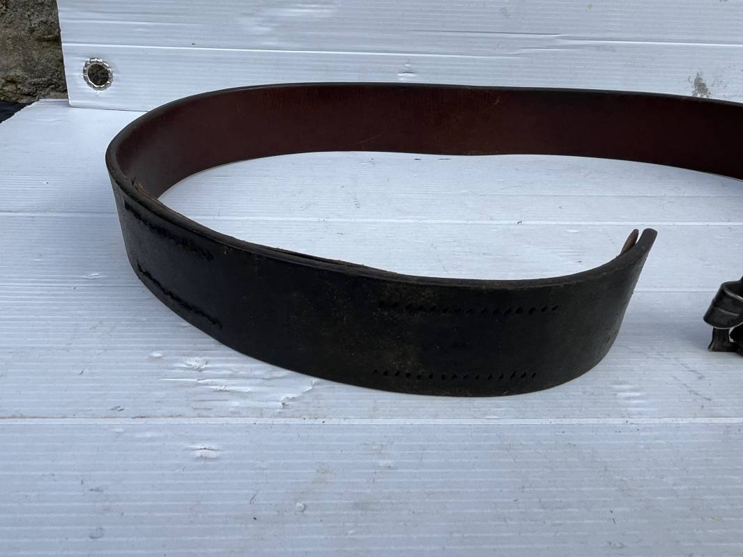 Ceinturon troupe en cuir noir de la Wehrmacht . Crochet fer peint en vert . Languette intererieure en cuir ( recousue ) . Cuir souple , longueur 96 cm . Porté en bon état . Pas de marquage visible . Bon ceinturon terrain 1940/43 Ref 19863