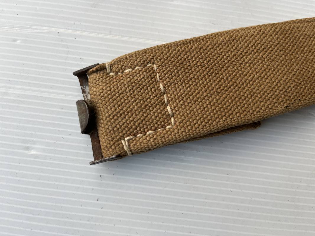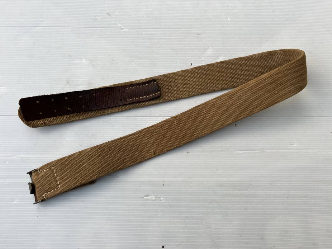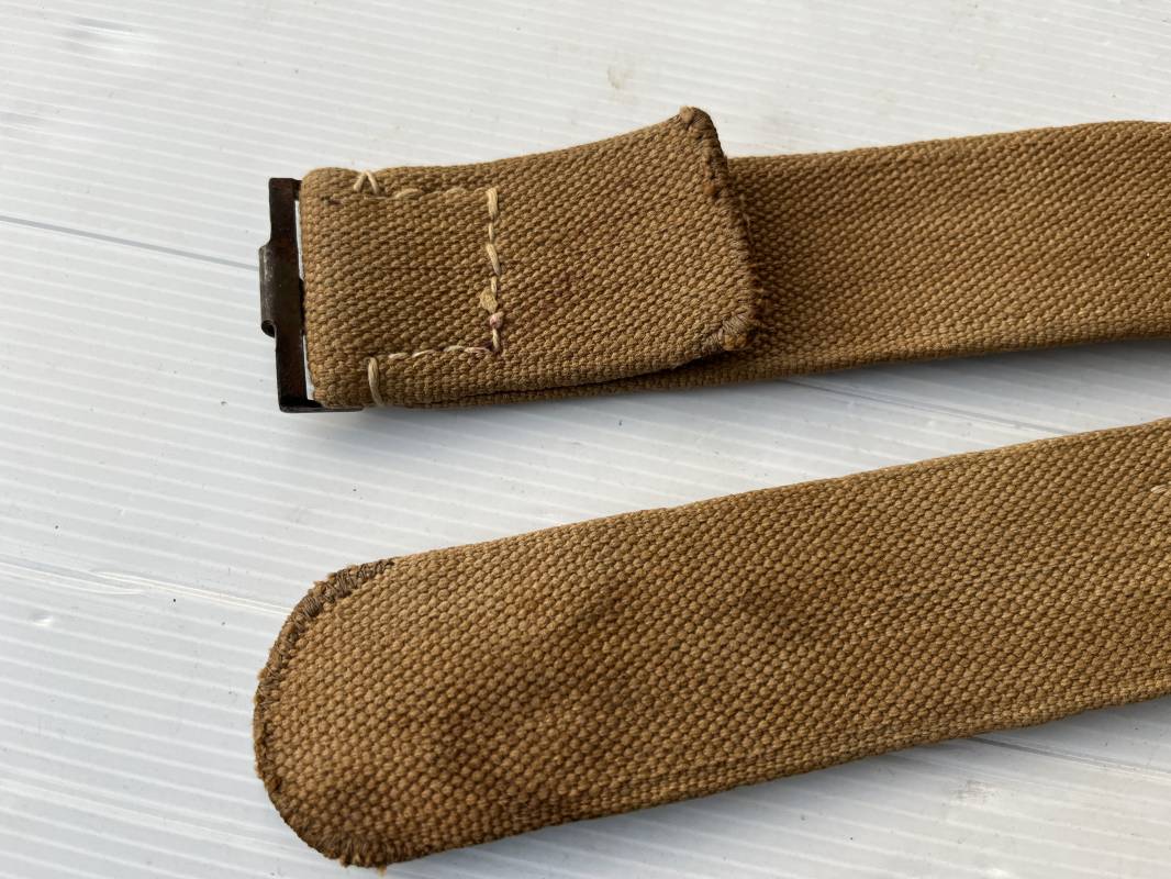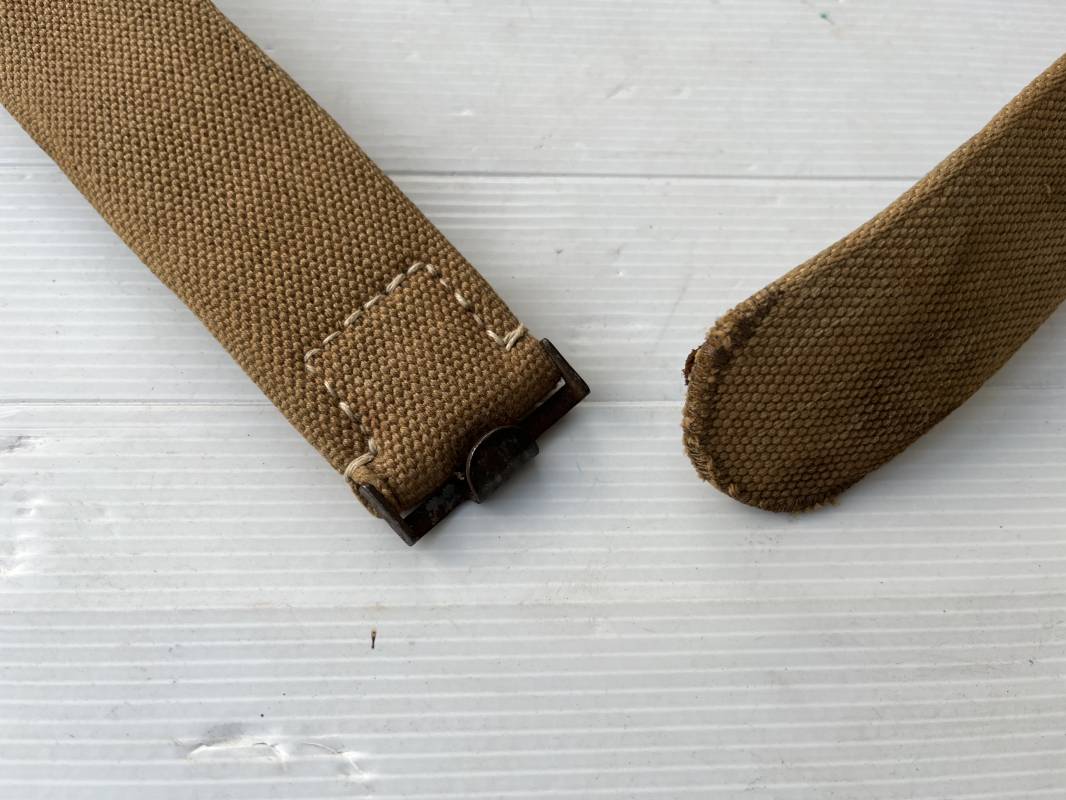 Ceinturon troupe du modéle tropical de la Wehrmacht . Trés beau ceinturon en coton filé jaune sable . Crochet de fixation en fer peint en vert . Languette interne en cuir marron de réglage de taille . Longueur totale 89 cm . Légérement porté en trés bel état 1940/45 Ce ceinturon toile a ete trouvé en brocante dans le secteur de coutances ( 50) Ref 21485