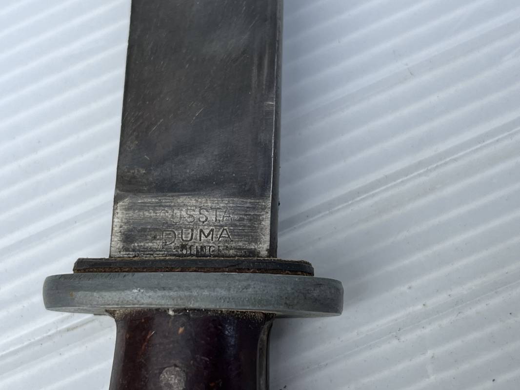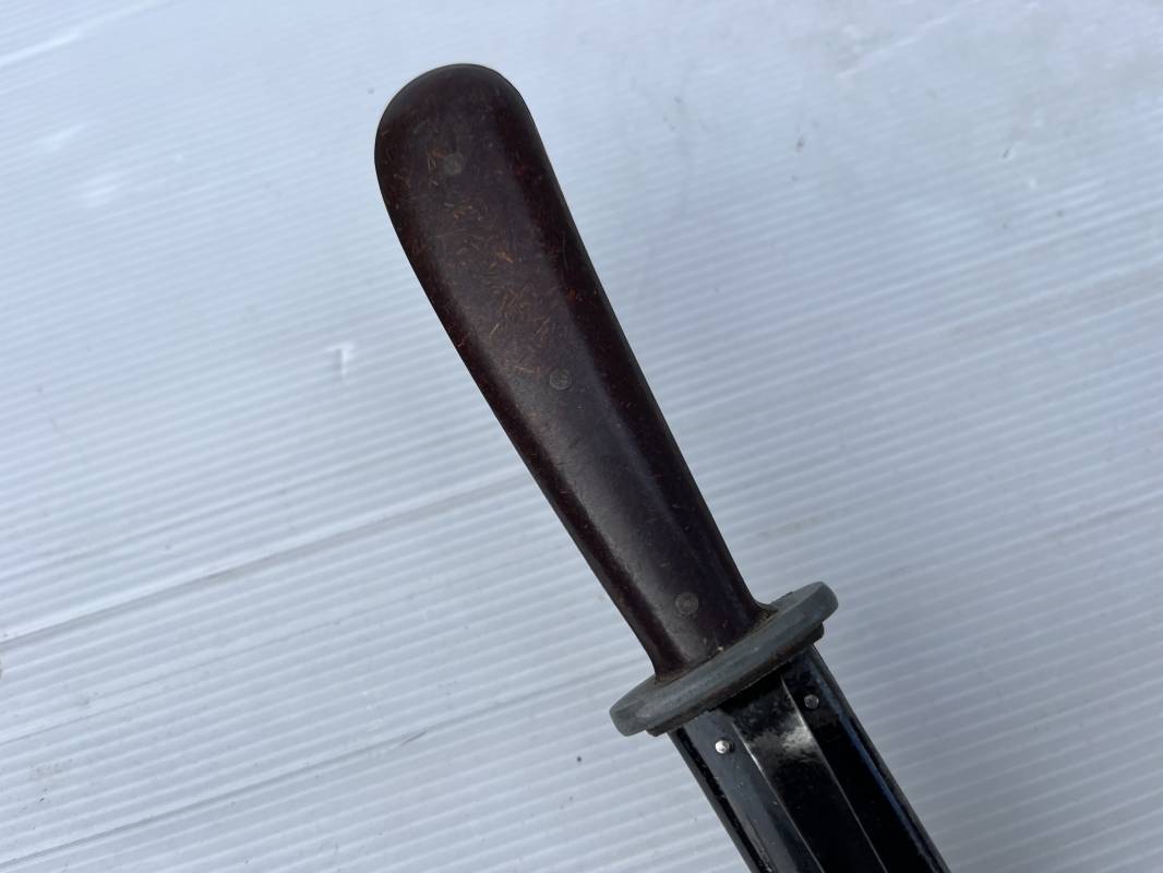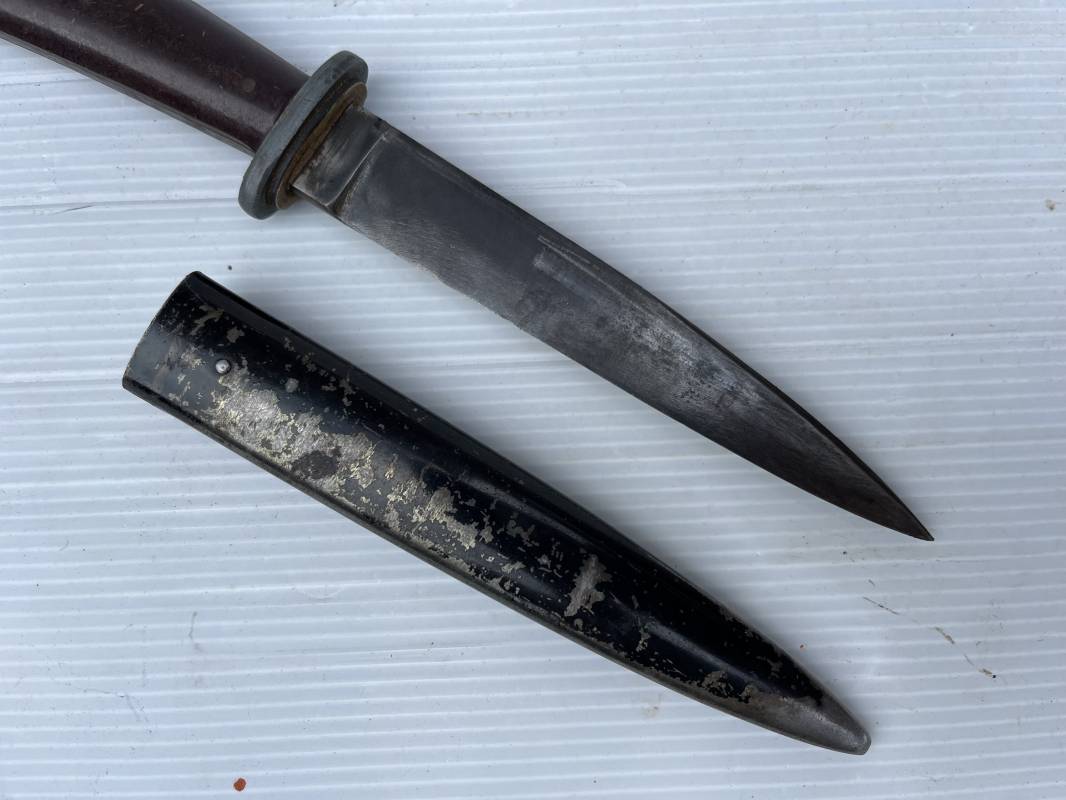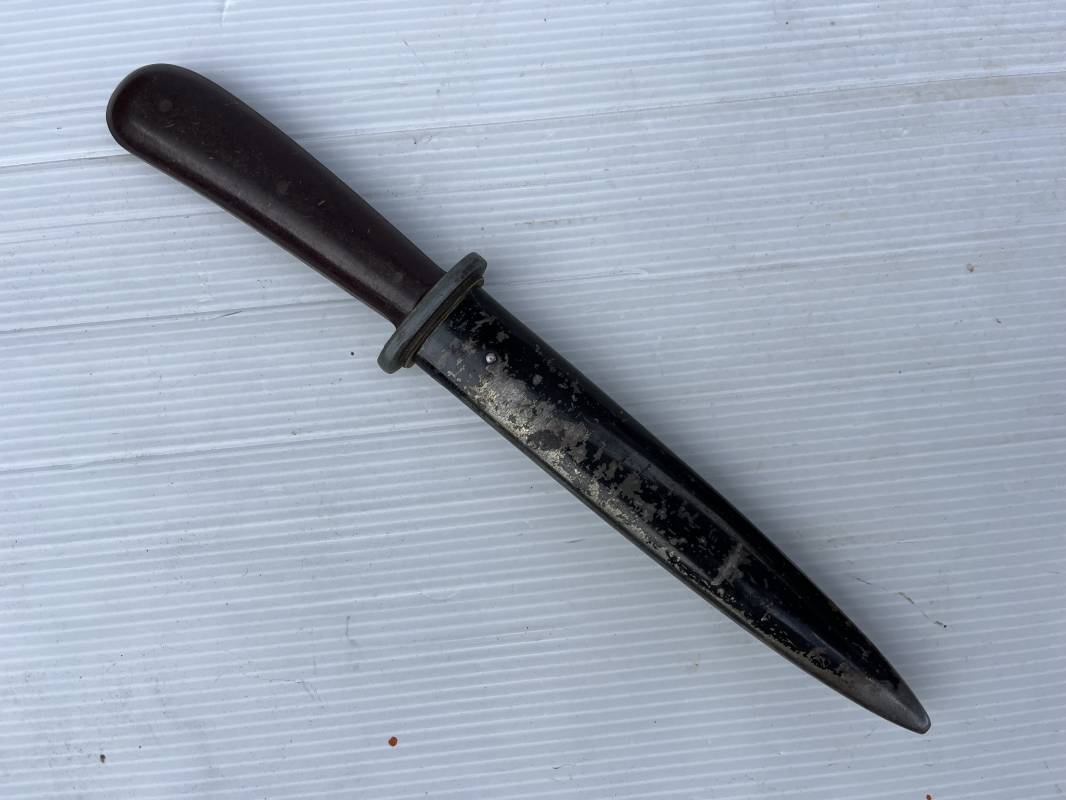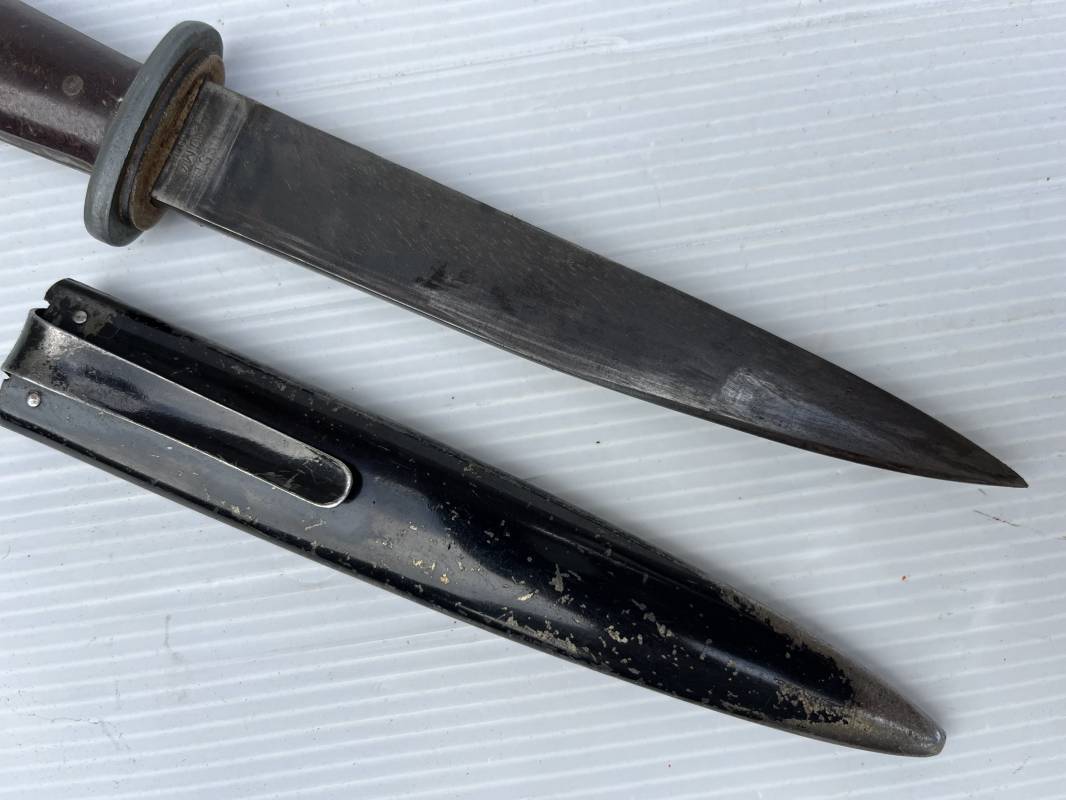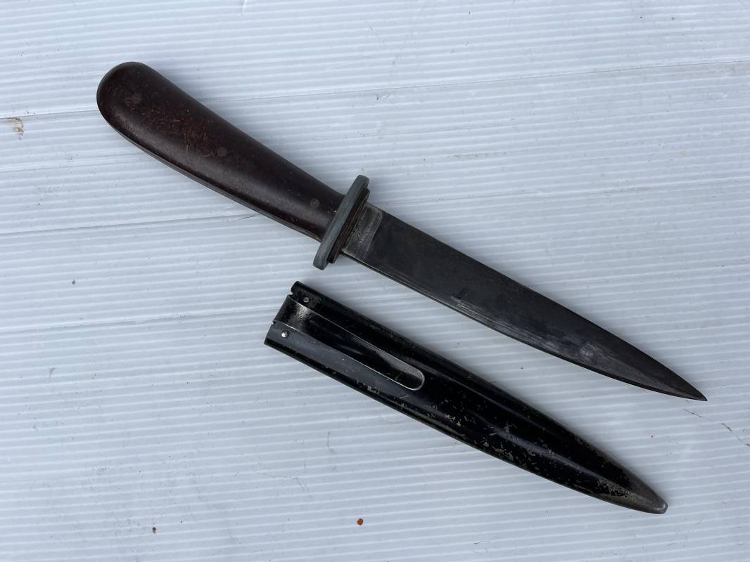 Rare couteau de combat de la Wehrmacht . Couteau PUMA . Poignée en bakélite marron , rivets métal , Lame et montant de poignée avec garde mono bloc acier . Garde ovale . Lame à un tranchat , marquage fabricant GUSSTA PUMA Solingen . Belle lame sans trace de corrosion . Fourreau métallique pent en noir d origine , passant metallique ressort de fixation au ceinturon . Beau couteau , légèrement utilisé en bel état 1940/45 Ref 20917