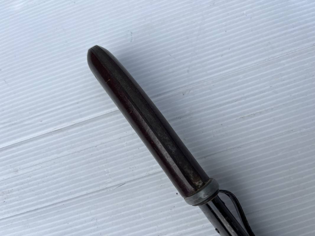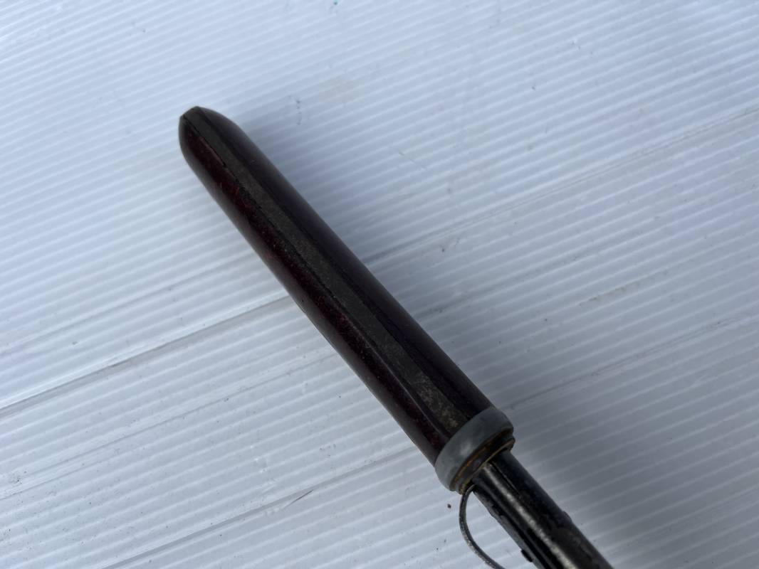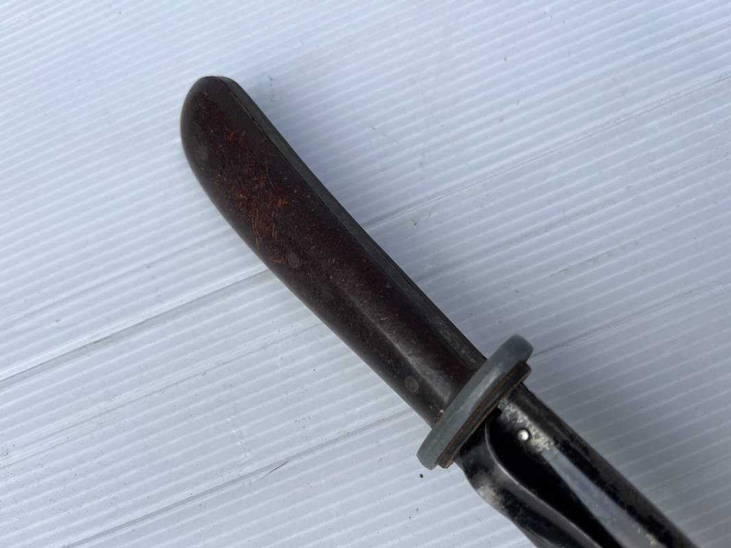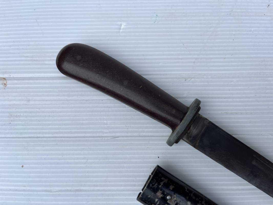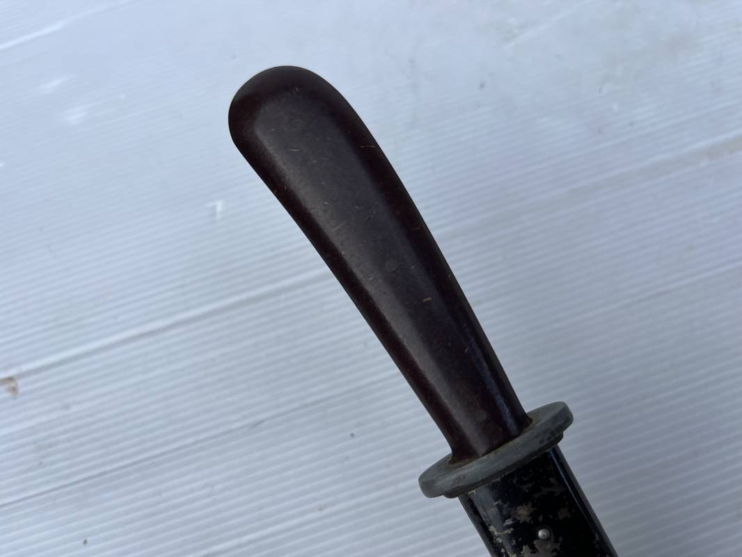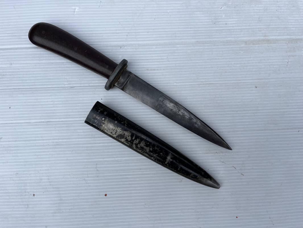 Rare couteau de combat de la Wehrmacht . Couteau PUMA . Poignée en bakélite marron , rivets métal , Lame et montant de poignée avec garde mono bloc acier . Garde ovale . Lame à un tranchat , marquage fabricant GUSSTA PUMA Solingen . Belle lame sans trace de corrosion . Fourreau métallique pent en noir d origine , passant metallique ressort de fixation au ceinturon . Beau couteau , légèrement utilisé en bel état 1940/45 Ref 20917