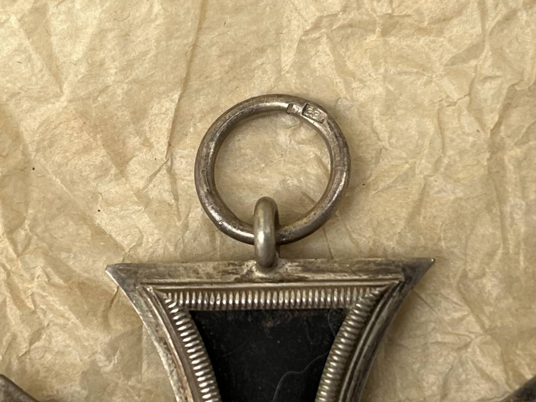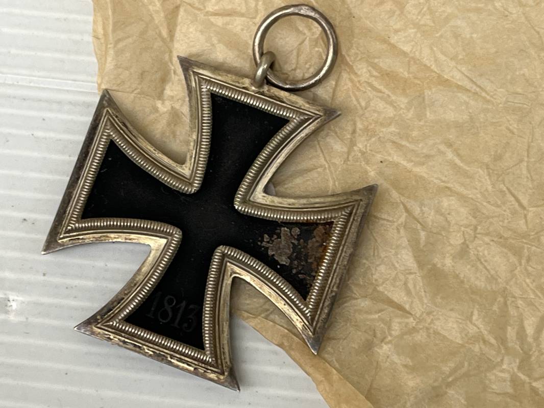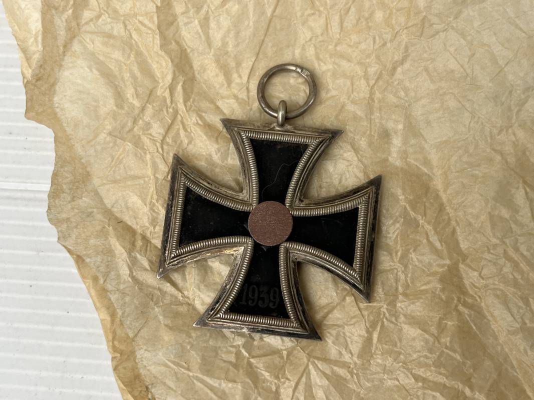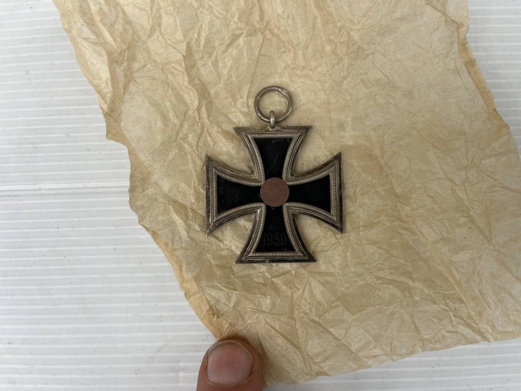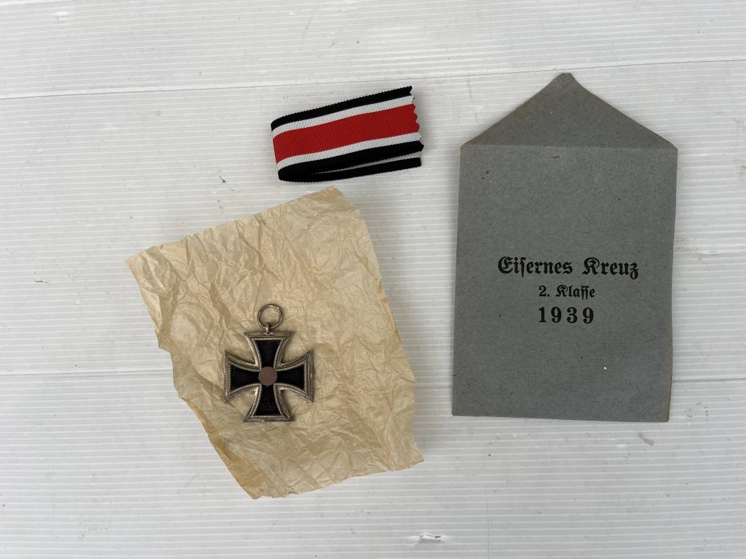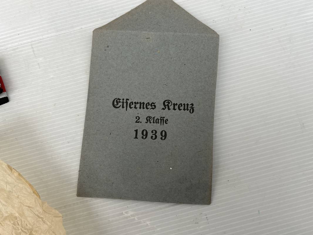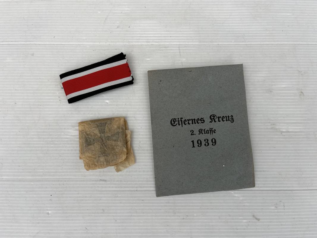 Très belle croix de fer de 2ème classe 1939 avec son sachet papier, son ruban et papier soie. Marquage code fabricant 122 sur anneau de chez j.j Stahl à Strasbourg Très bel ensemble en superbe état. Croix en plusieurs parties. Peinture noire mate d'origine, anneau. Belle argenture, très belle patine. Ruban d'origine pleine longueur 30cm. Papier soie d'origine pour emballage de la croix. Sachet d'origine en papier carton. Superbe ensemble dans un état quasi neuf et sans doute jamais distribué . 1939/45 Ref 21106