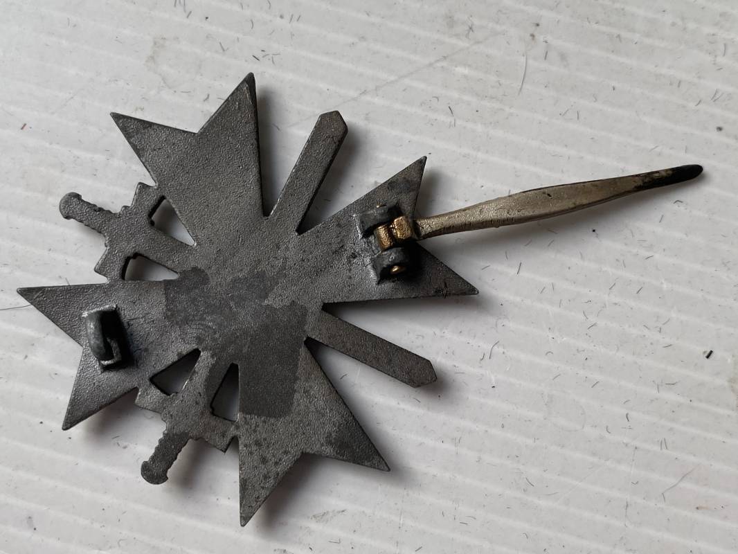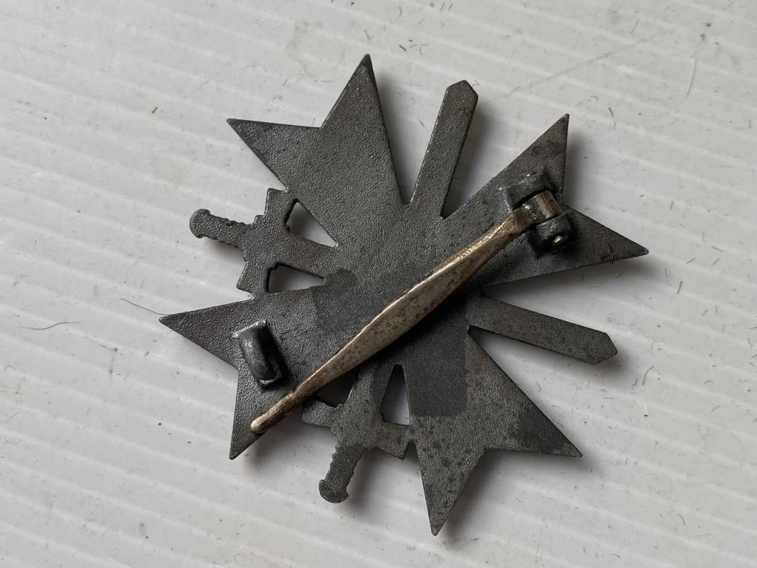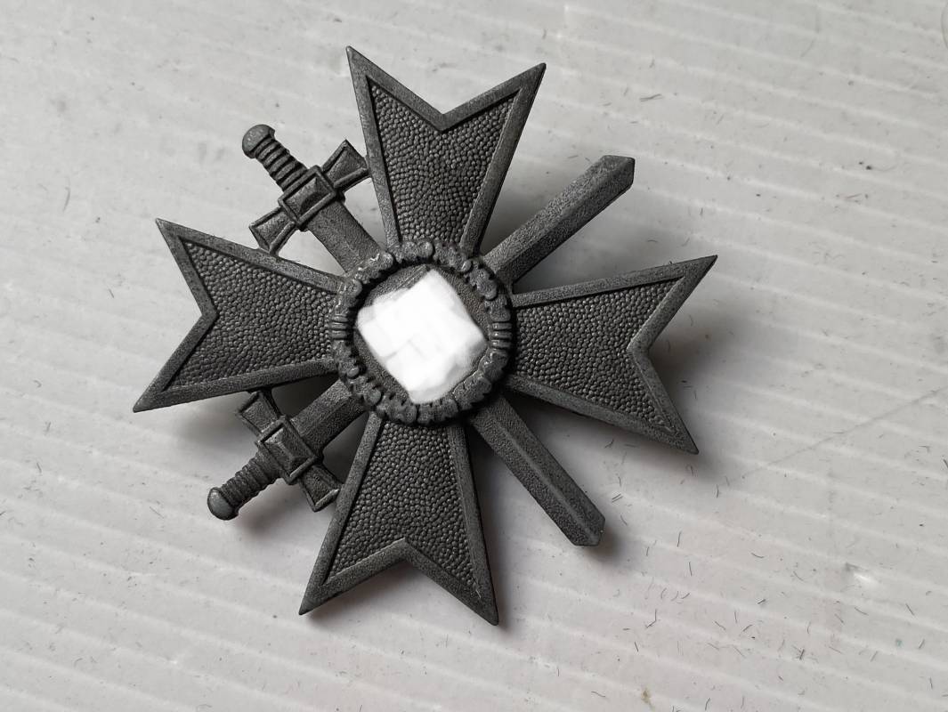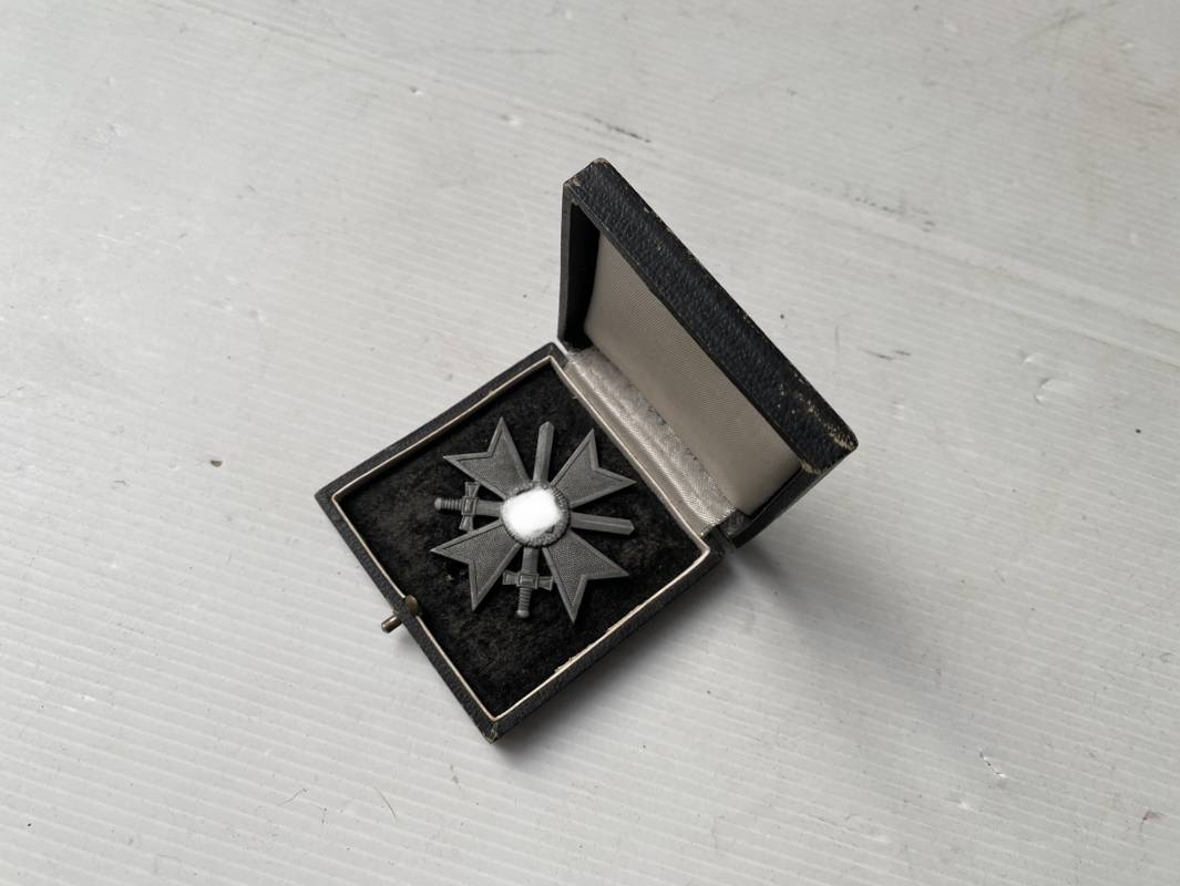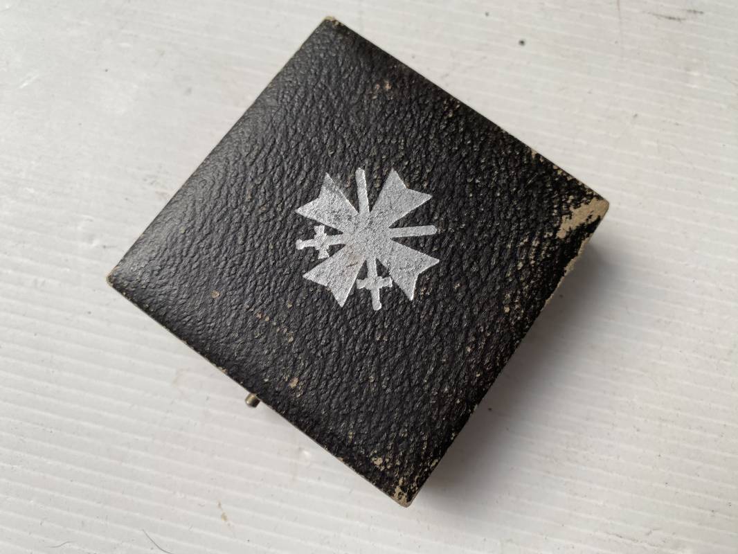 Belle croix de mérite 1939 de première classe avec glaives et son boitier . Belle fabrication soignée, beaux reliefs, fabrication massive. Attache et crochet d’origines au dos. Légèrement porté en parfait état . Boitier en carton , marquage de la croix sur le dessus . Intérieur doublé en soie blanche , et velours noir . Bel état . Bel ensemble trouvé en Allemagne Ref 18919