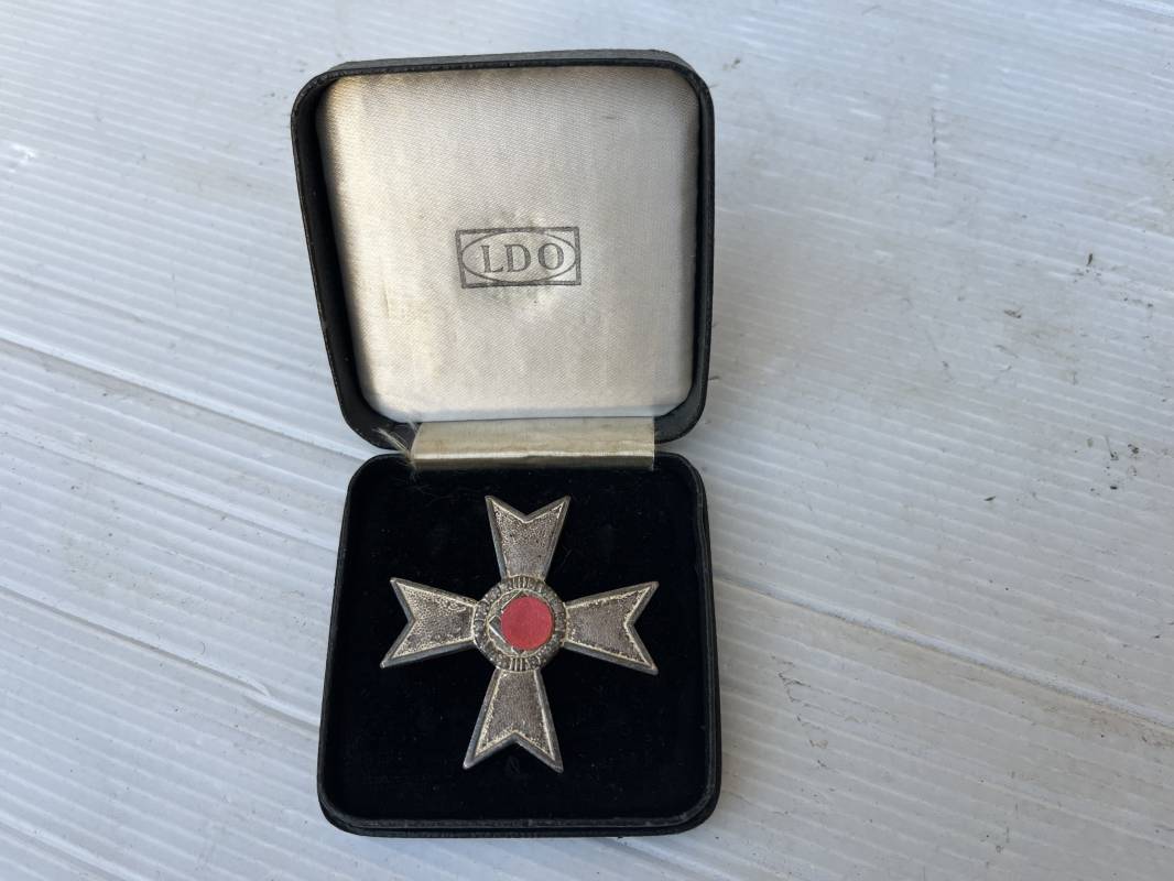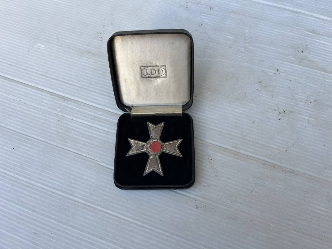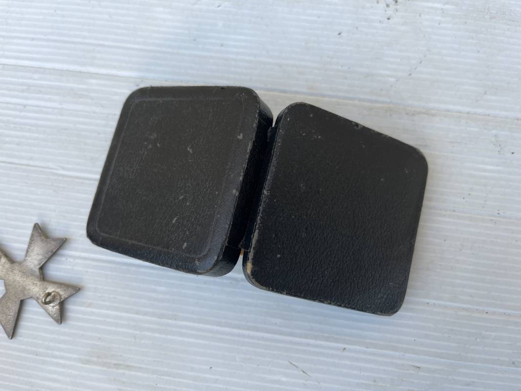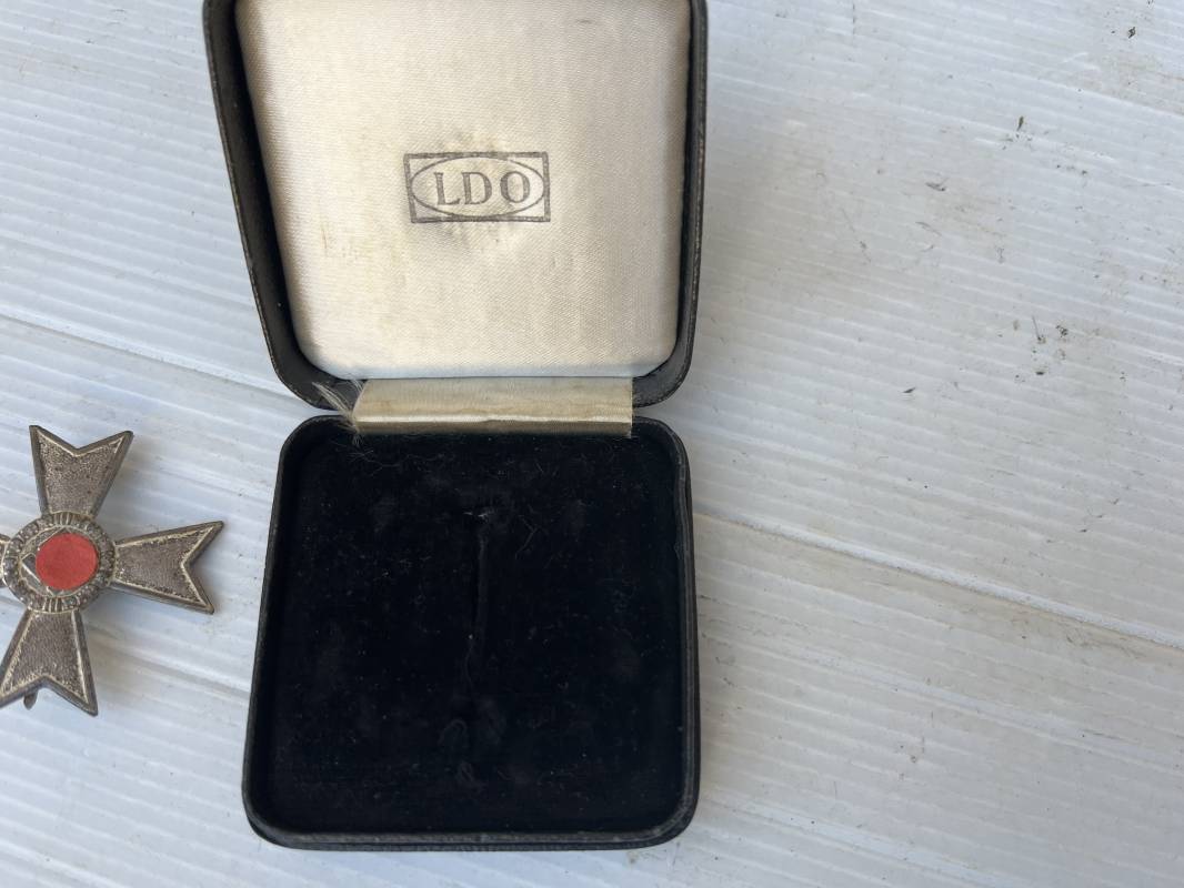 Trés belle croix de mérite 1939 de première classe et son boitier . Belle fabrication soignée, beaux reliefs, fabrication massive avec patine ' vieille argent '. Attache et crochet d’origines au dos. Légèrement porté en parfait état . Boitier en carton , marquage LDO sur la soie interieure . Intérieur doublé en soie blanche , et velours noir . Trés bel état . Bel ensemble trouvé en Allemagne Ref 21310