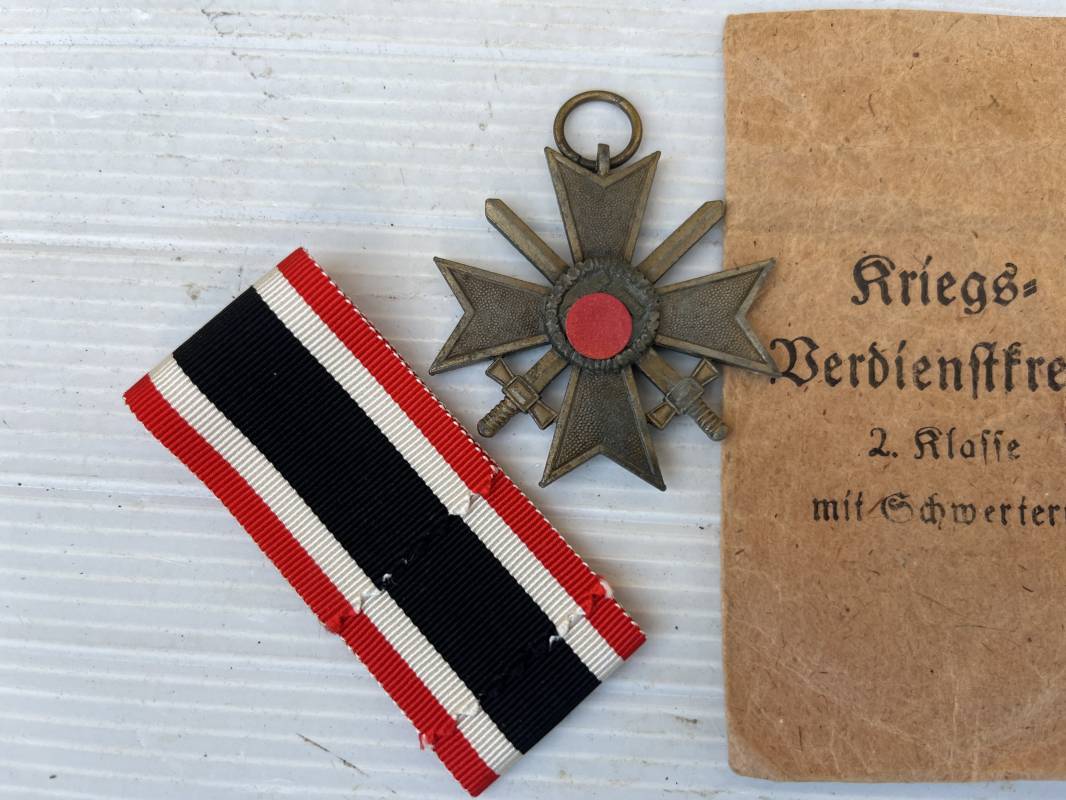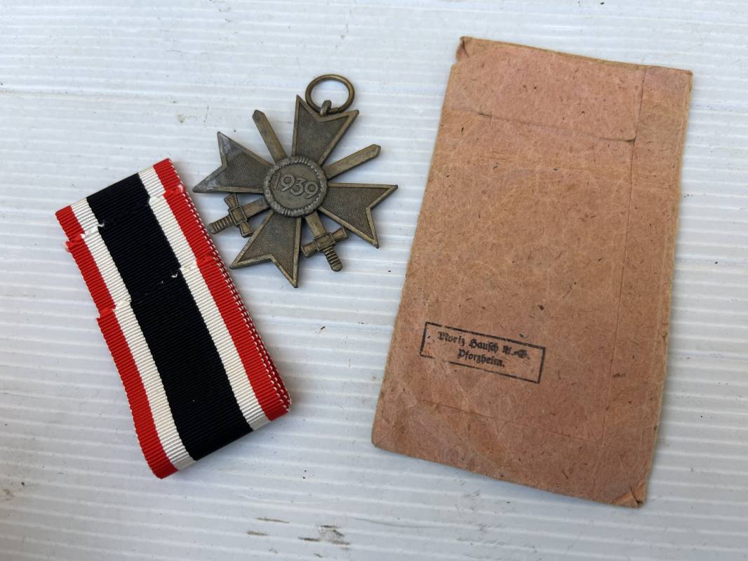 Trés belle croix de mérite 2éme classe 1939 avec glaives et son sachet papier . Croix bronze doubles faces . Glaives . Anneau et ruban . Ruban pleine longueur 30 cm . Sachet en papier avec marquage fabricant sur le derriere 'Wortz Bausch Pforzheim Trés bel ensemble en parfait état , a noté sachet en partie déchiré ( voir photos ) 1939/45 ref 21311