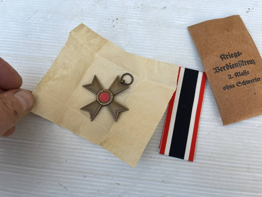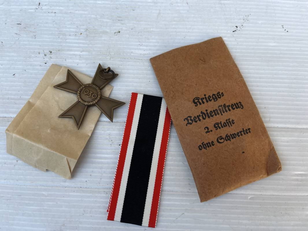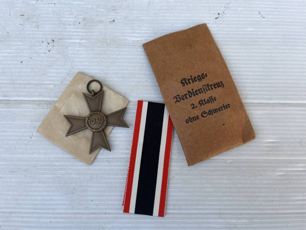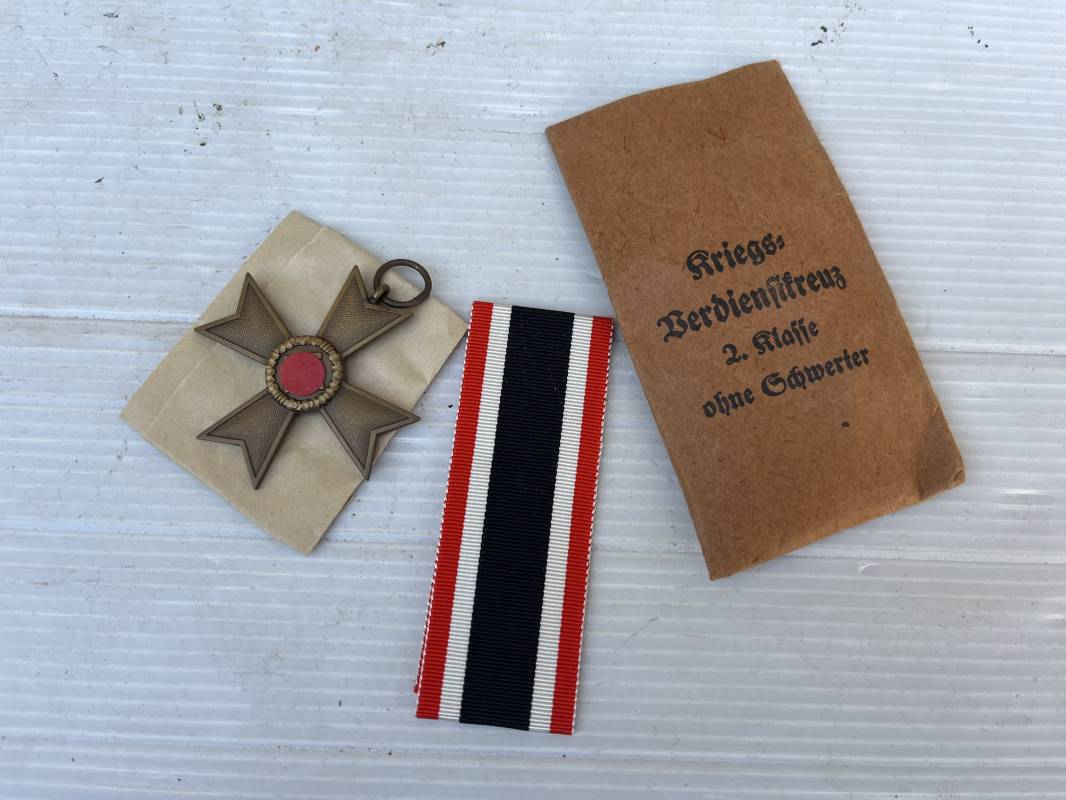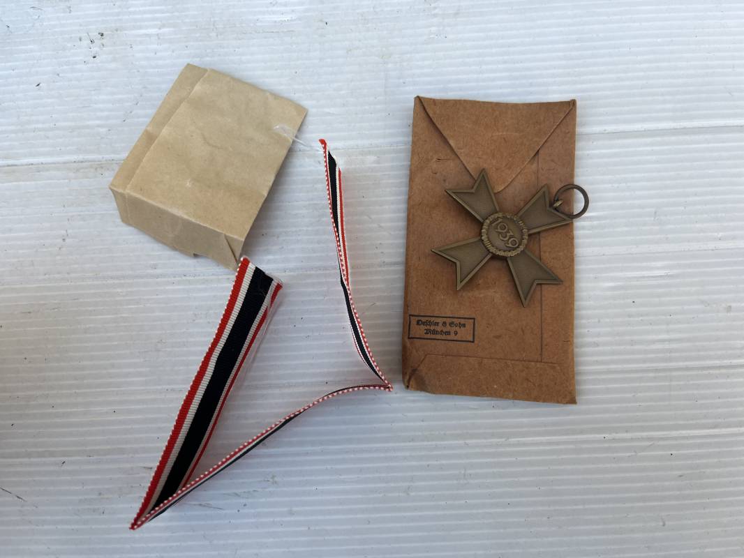 Trés belle croix de mérite 2éme classe 1939 et son sachet papier . Croix bronze doubles faces . Glaives . Anneau et ruban .Marquage code fabricant ' 1 ' sur anneau de chez Deschler Ruban pleine longueur 30 cm . Sachet en papier avec marquage fabricant sur le derriere 'Deschler Munchen' . Petit papier d 'origine d 'emballage interieur . Trés bel ensemble en état quasi neuf . 1939/45 ref 21481