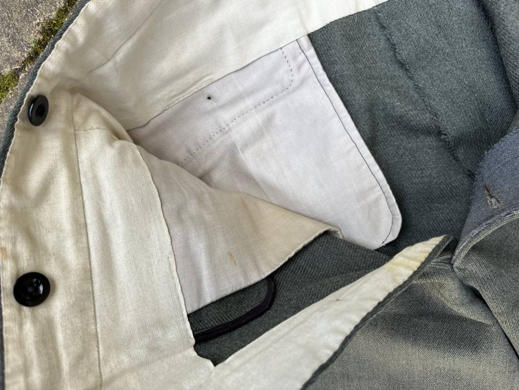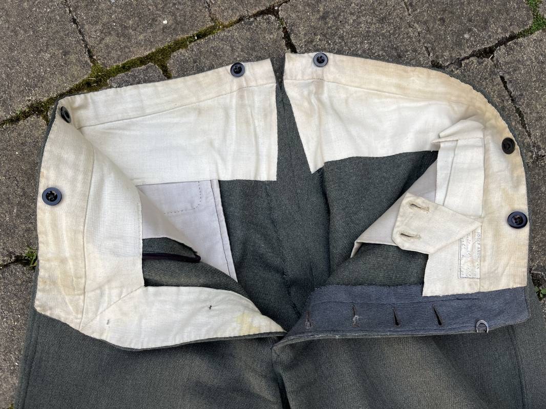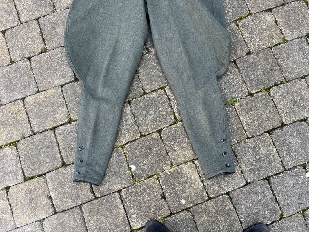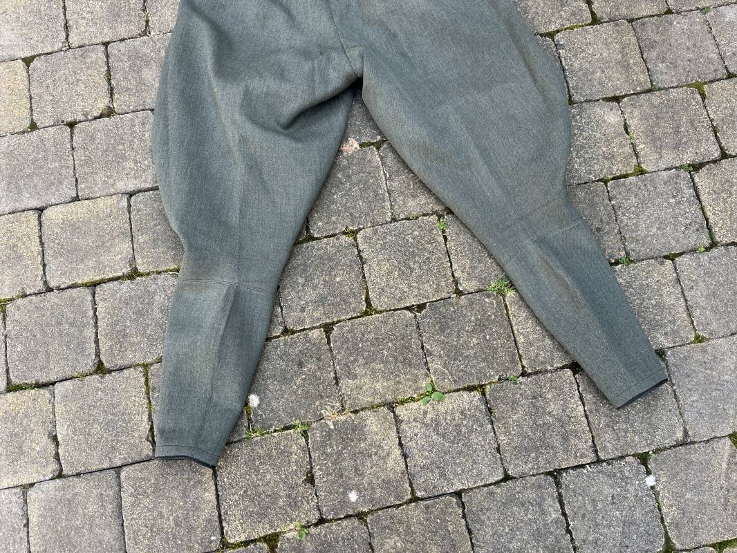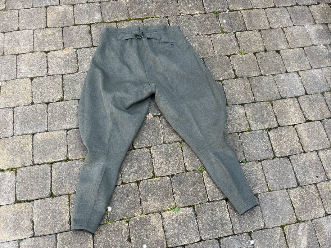 Trés belle culotte d'un officier de la Heer en gabardine feldgrau . Trois poches dont une fessière , petite poche à gousset sur le devant . Boutons plastique cousus d'origine , crochet métallique de braguette . Bas des jambes à boutons .Martingale sur le derrière avec boucles en fer bronzé Intérieur doublé en coton blanc , poche en toile de coton blanc . Etiquette nominette du tailleur militaire Josef Andrykek nom de l officier et numero matricule , daté 1942 . Culotte légèrement portée en tres bon état . Taille 44 , longueur 105 cm . Belle culotte d'un officier de la heer . 1940/45 Ref 18706