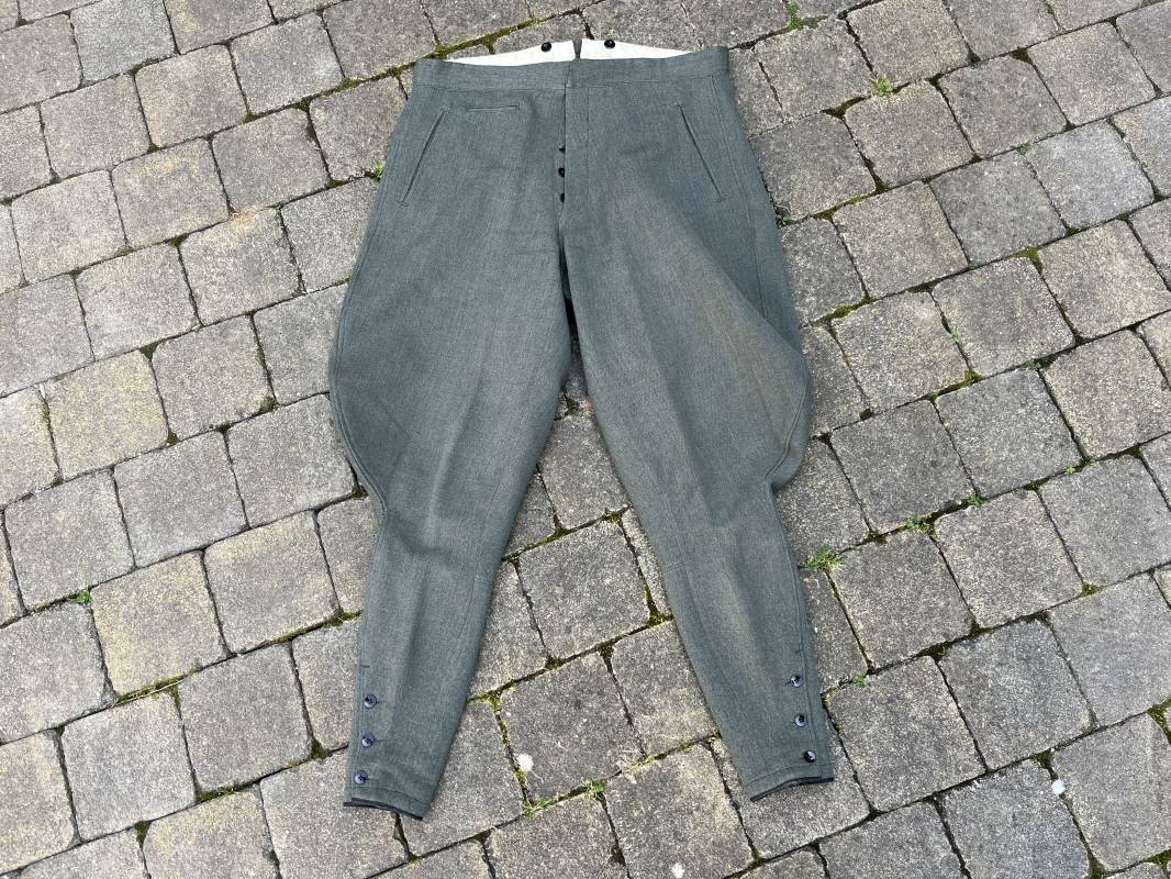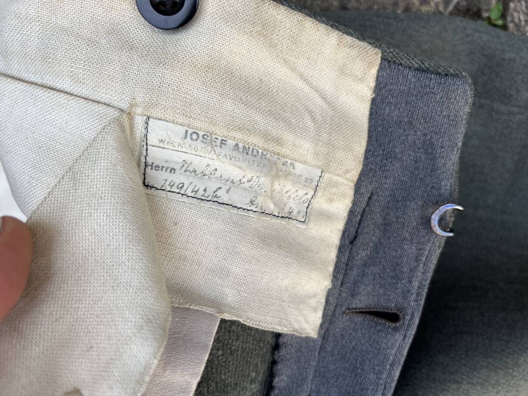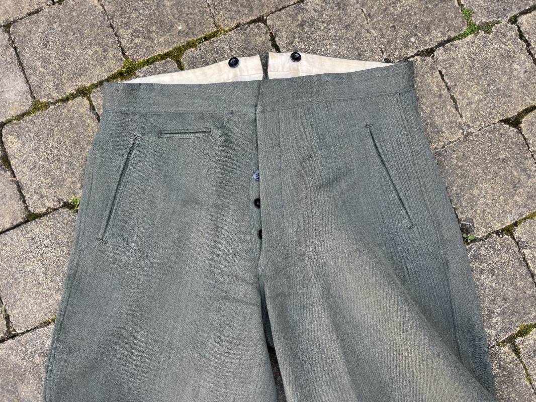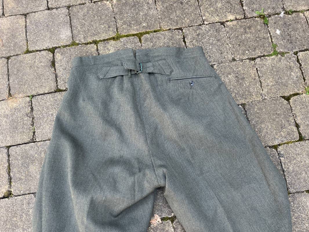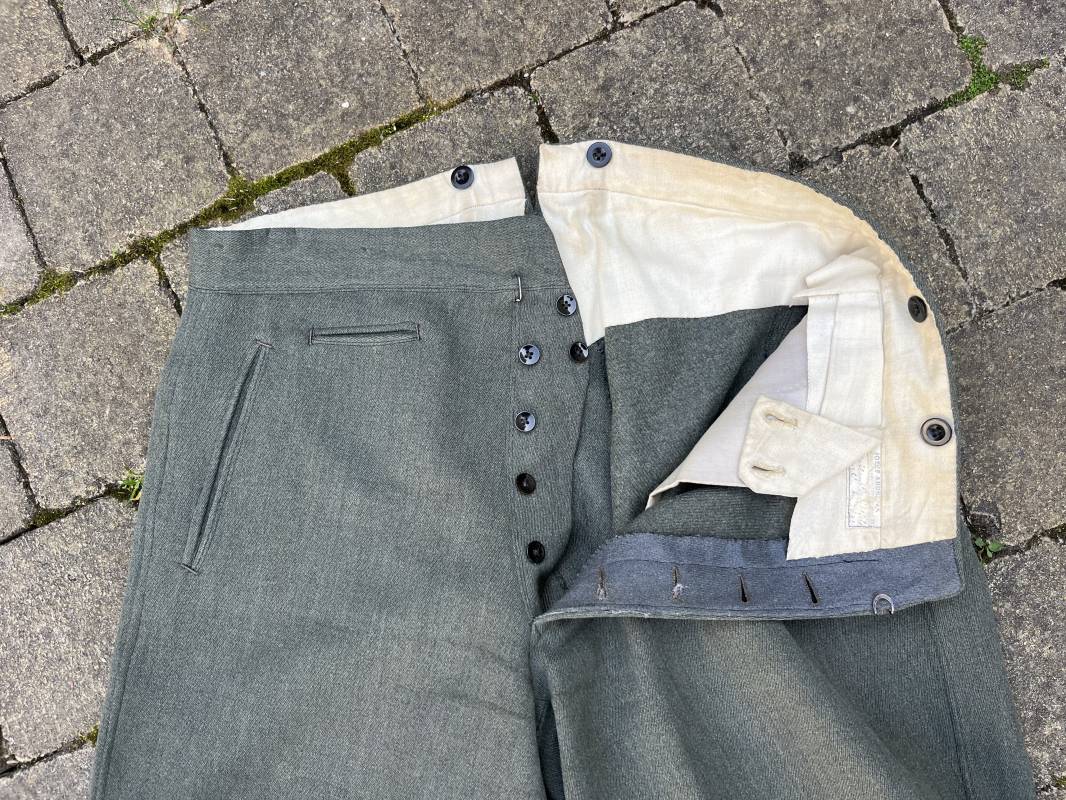 Trés belle culotte d'un officier de la Heer en gabardine feldgrau . Trois poches dont une fessière , petite poche à gousset sur le devant . Boutons plastique cousus d'origine , crochet métallique de braguette . Bas des jambes à boutons .Martingale sur le derrière avec boucles en fer bronzé Intérieur doublé en coton blanc , poche en toile de coton blanc . Etiquette nominette du tailleur militaire Josef Andrykek nom de l officier et numero matricule , daté 1942 . Culotte légèrement portée en tres bon état . Taille 44 , longueur 105 cm . Belle culotte d'un officier de la heer . 1940/45 Ref 18706