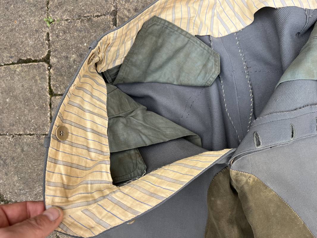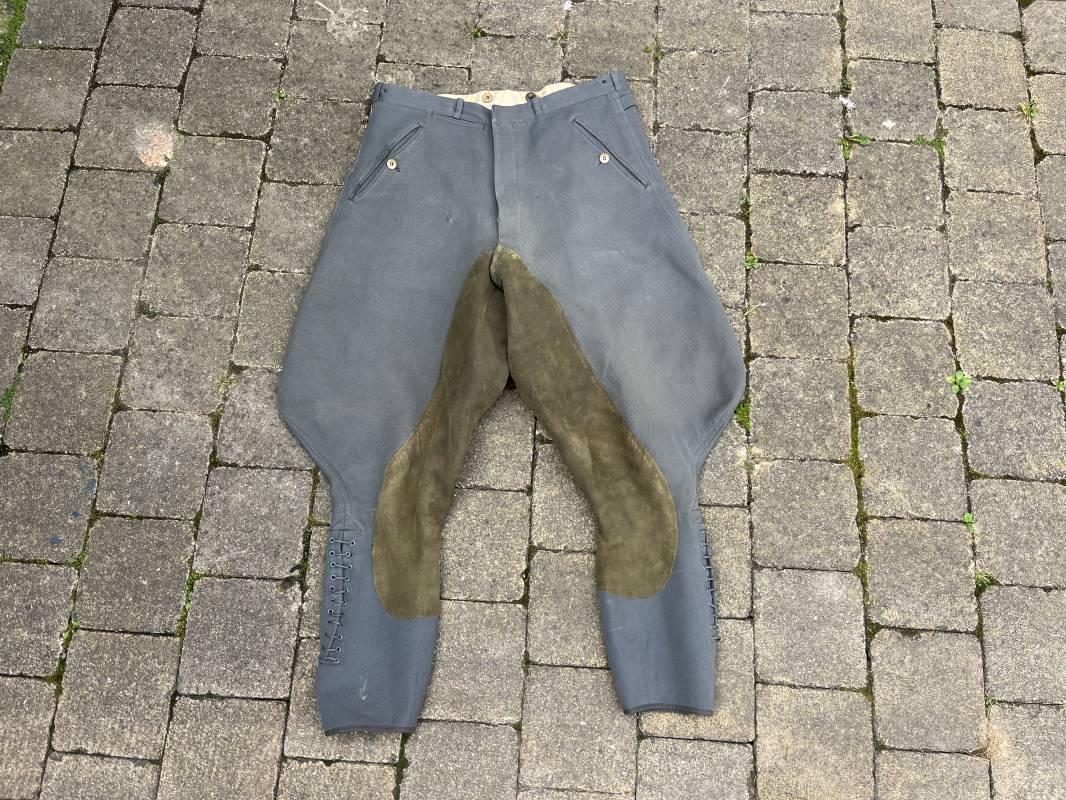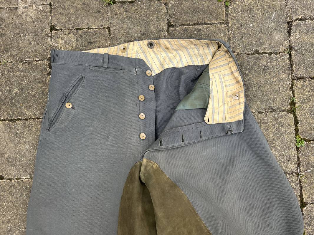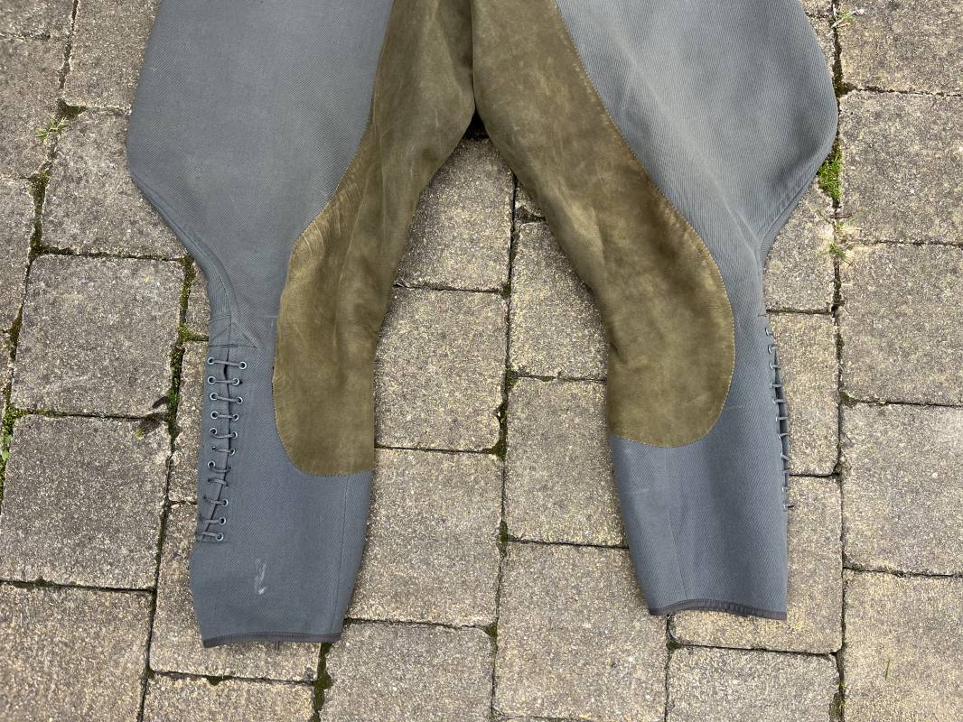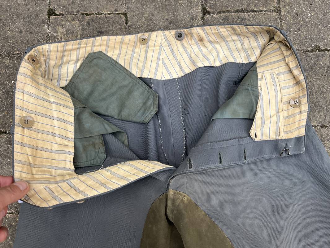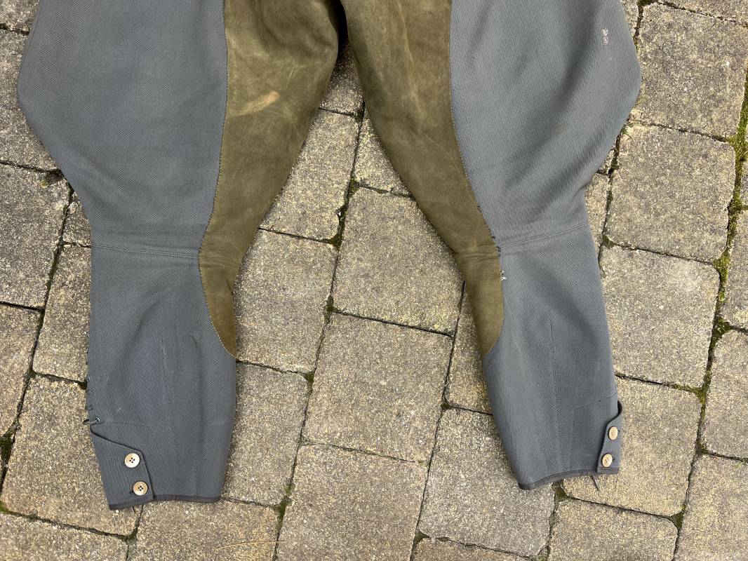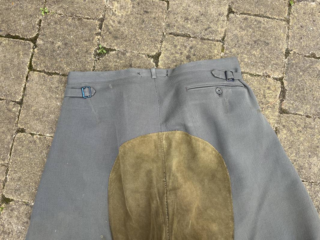 Trés belle culotte d'un officier de la Heer en gabardine grise ' Stein grau' avec basane en cuir . Trois poches dont une fessière , petite poche gousset . passants de ceinturon en tissu . Boutons plastique cousus d'origine .crochet metallique . Bas des jambes à lacets et boutons , lacets coton d origine .Basane a l entre deux jambes en cuir chamois beige . deux passants lateraux pour réglage de taille avec boucles en métal bronzé . Intérieur doublé en coton gris et satiné rayé . Culotte légèrement portée parfait état . Taille 42, longueur 95 cm . Belle culotte d'un officier de la heer 1935/45 Ref 18414