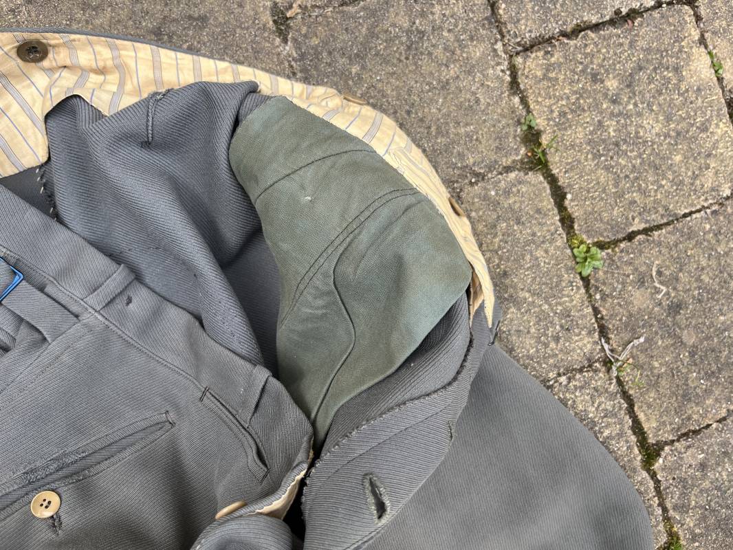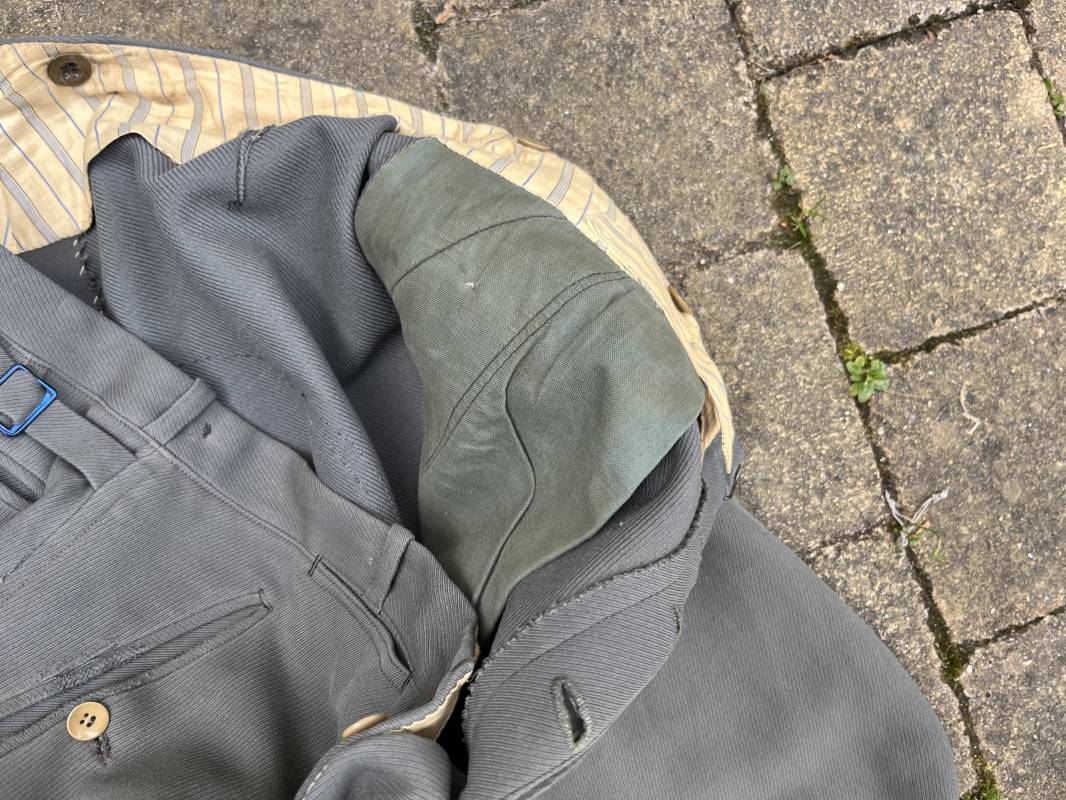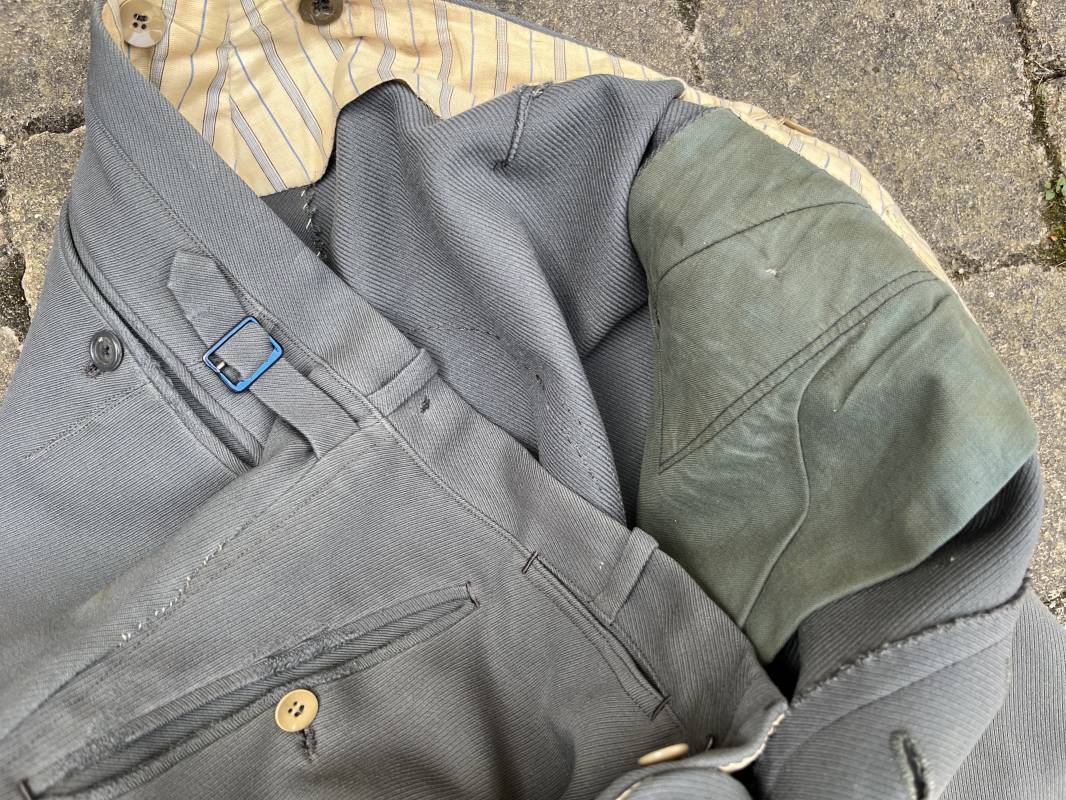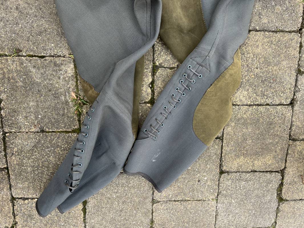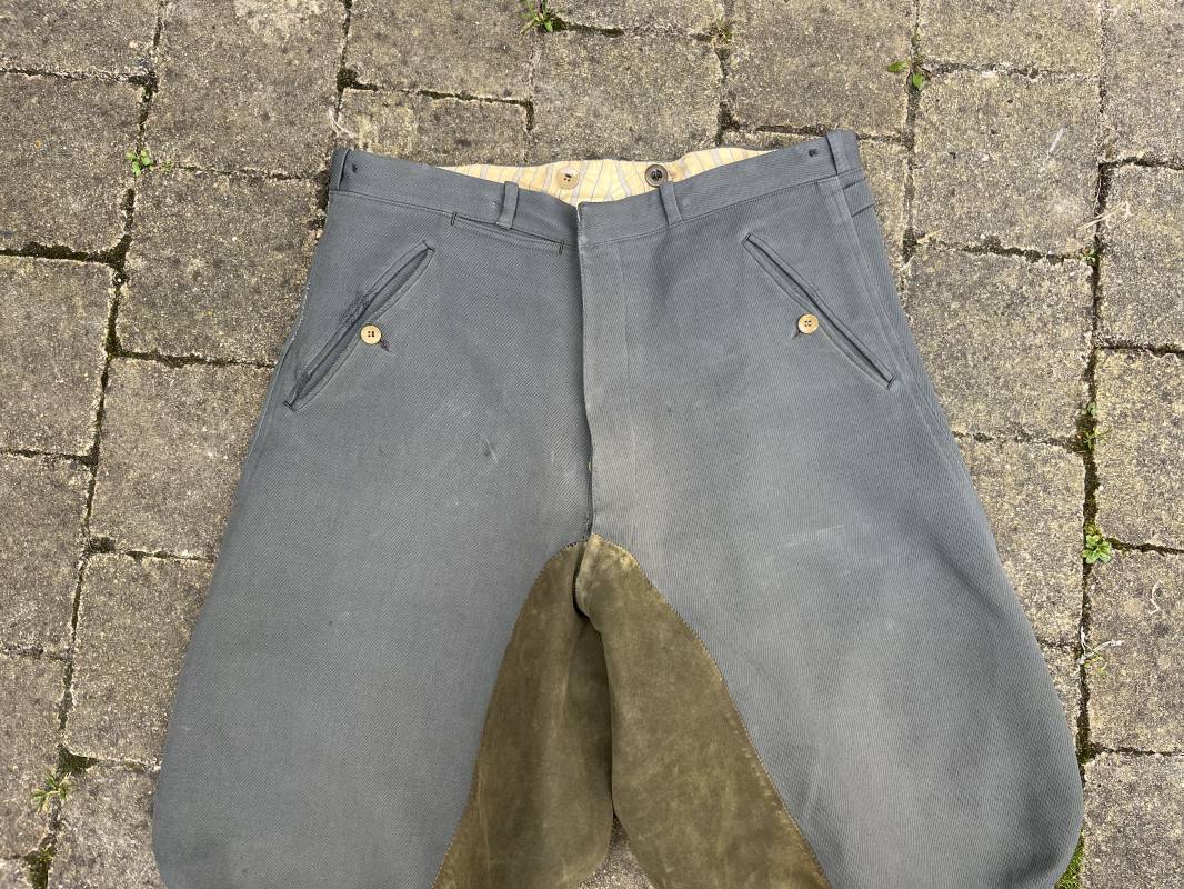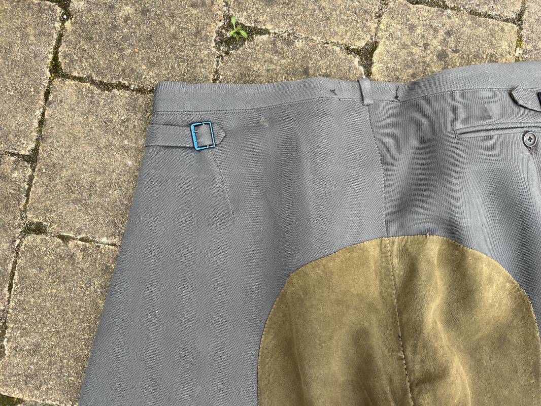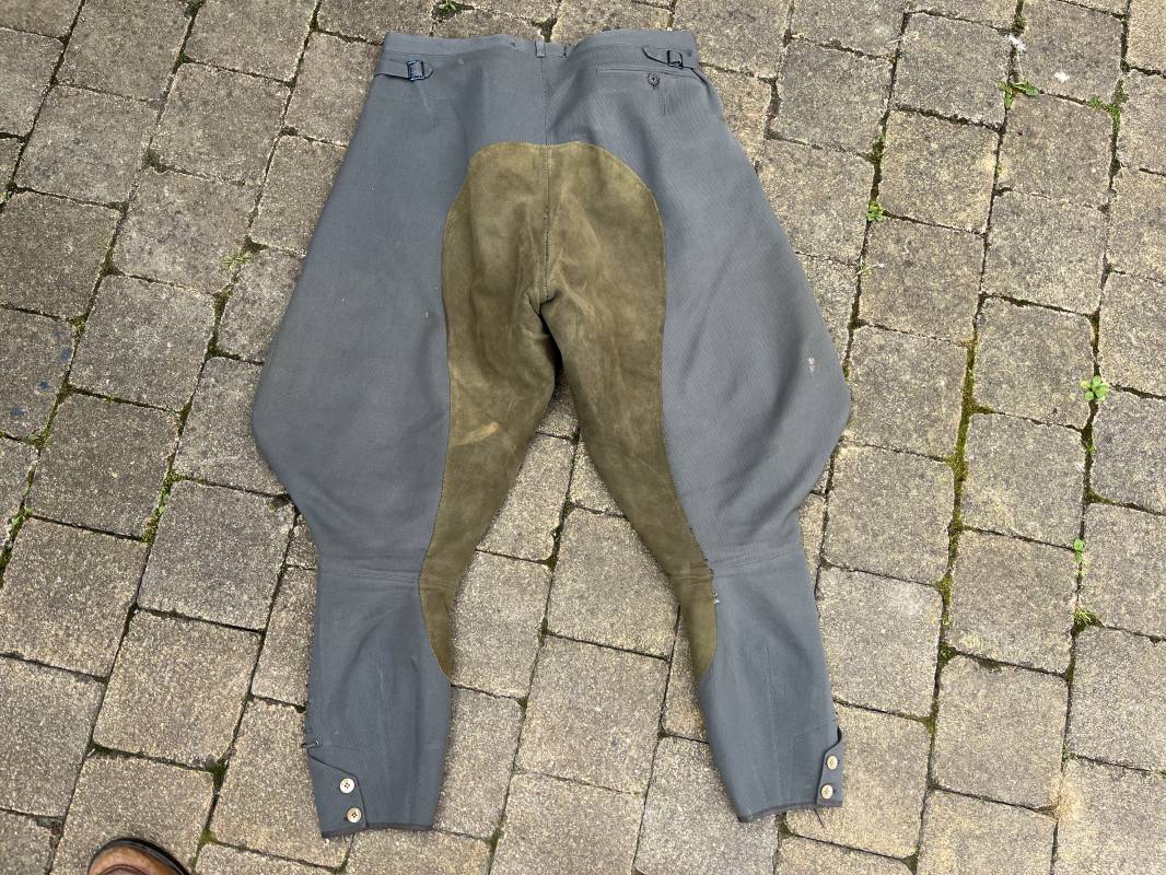 Trés belle culotte d'un officier de la Heer en gabardine grise ' Stein grau' avec basane en cuir . Trois poches dont une fessière , petite poche gousset . passants de ceinturon en tissu . Boutons plastique cousus d'origine .crochet metallique . Bas des jambes à lacets et boutons , lacets coton d origine .Basane a l entre deux jambes en cuir chamois beige . deux passants lateraux pour réglage de taille avec boucles en métal bronzé . Intérieur doublé en coton gris et satiné rayé . Culotte légèrement portée parfait état . Taille 42, longueur 95 cm . Belle culotte d'un officier de la heer 1935/45 Ref 18414