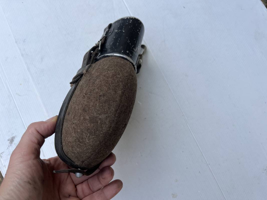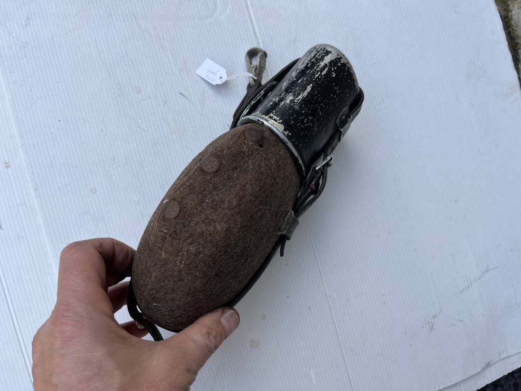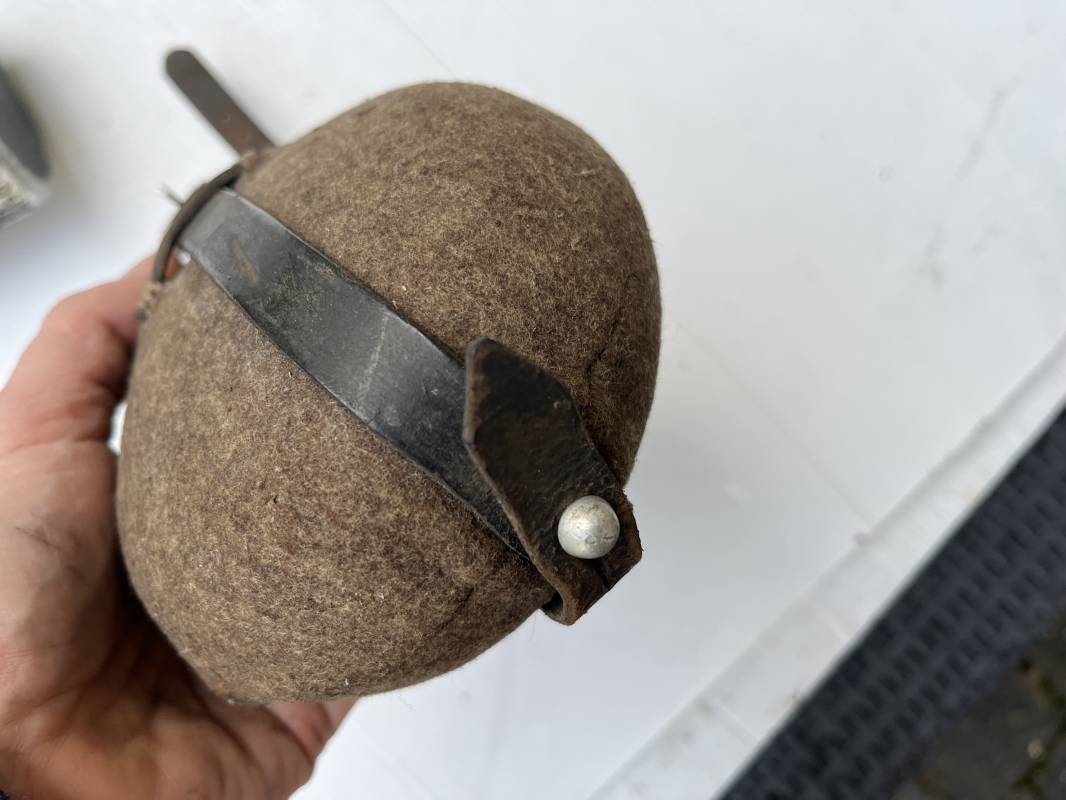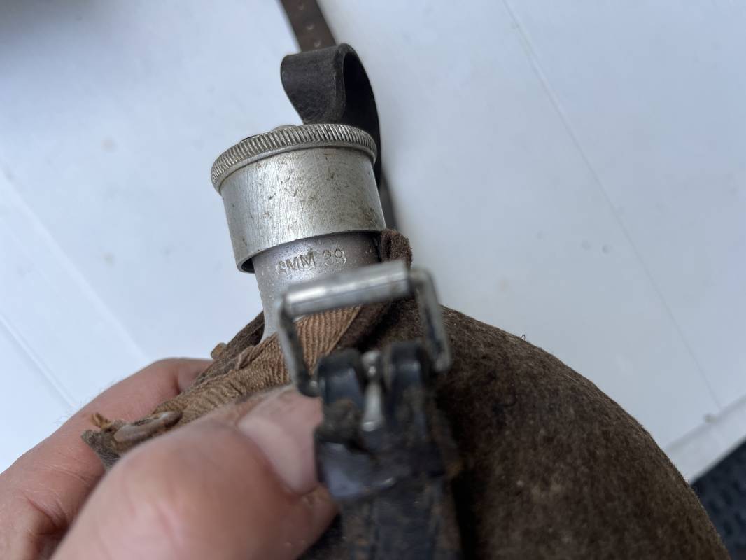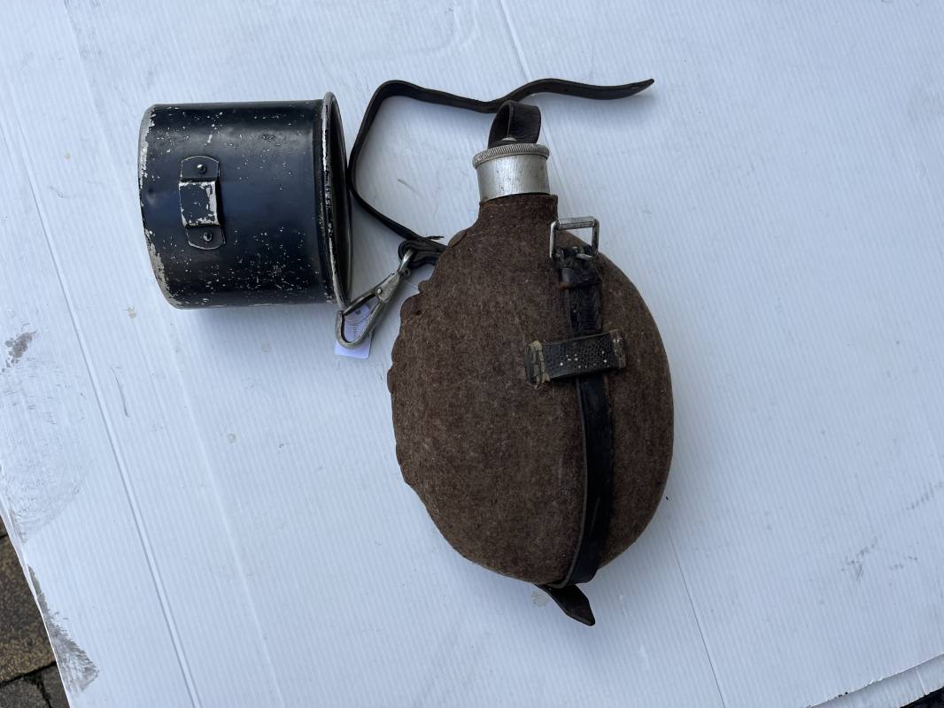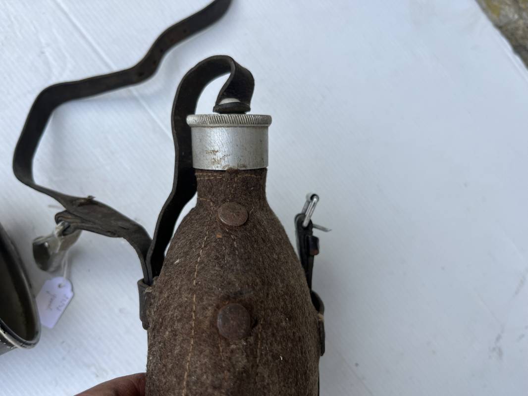 Gourde individuelle de la Wehrmacht modéle 1931 . Bidon et bouchon en alu , marquage fabricant SSM 1938 , housse feutrine marron , harnais en cuir noir , crochet alu . Quart individuel en fer peint en noir , marquage gnl 1942 . Gourde 100 % dans son jus et intouchée 1943/45 Ref 21147
