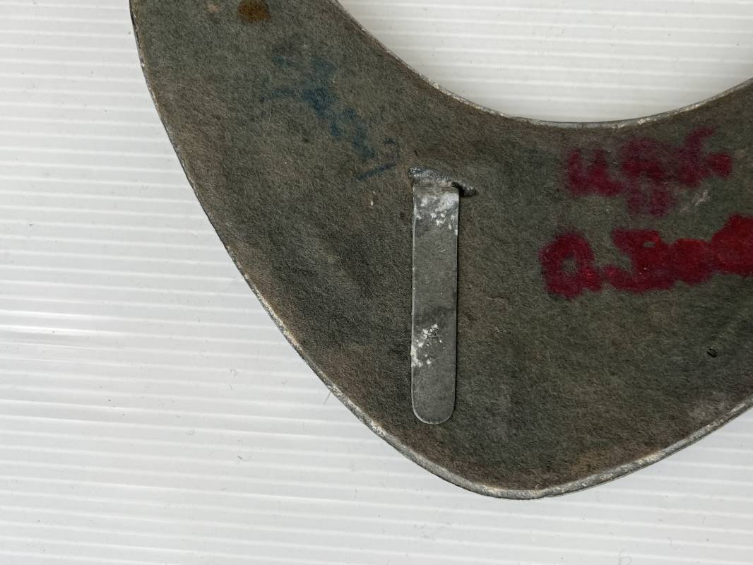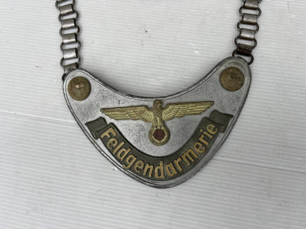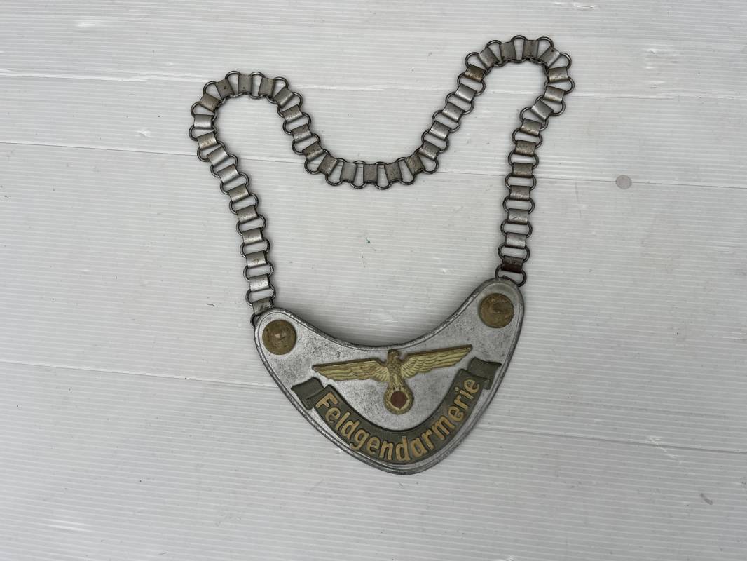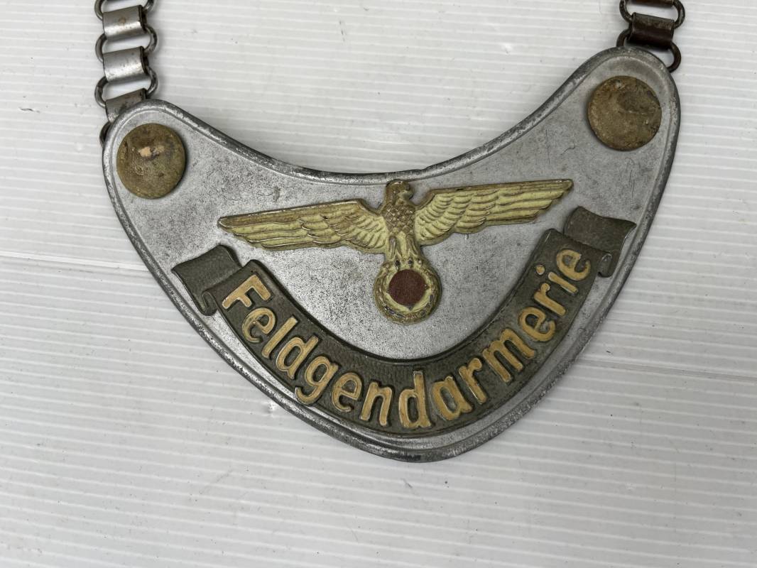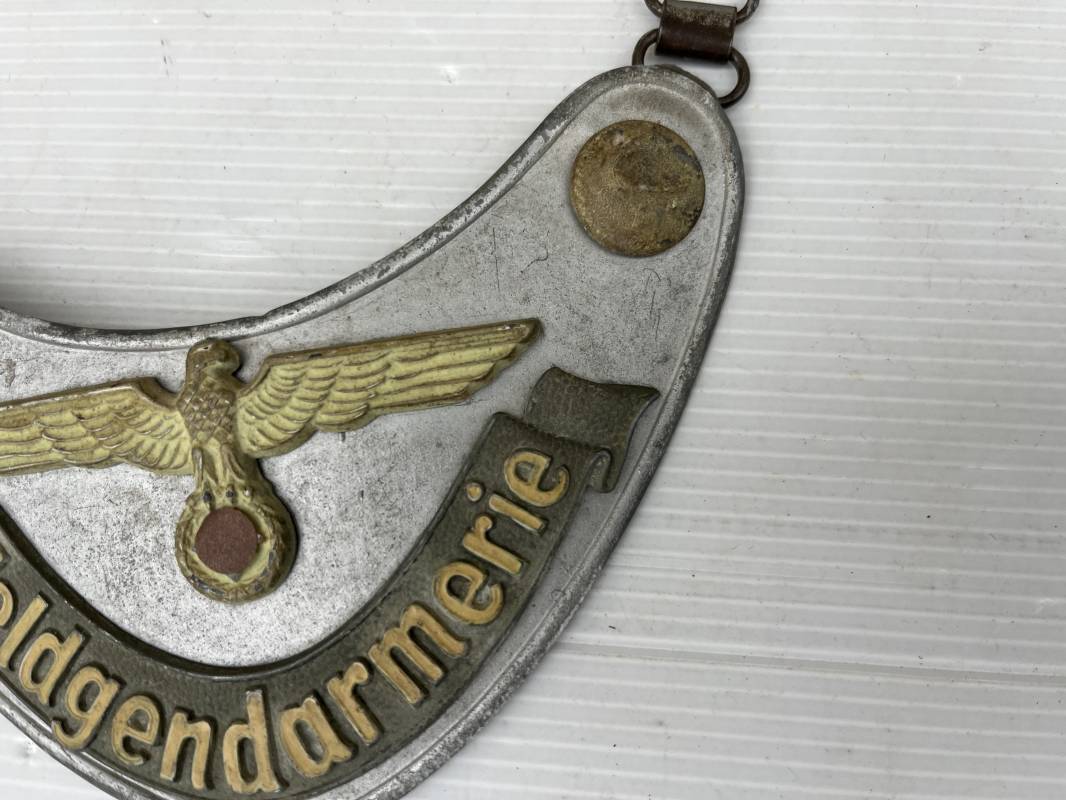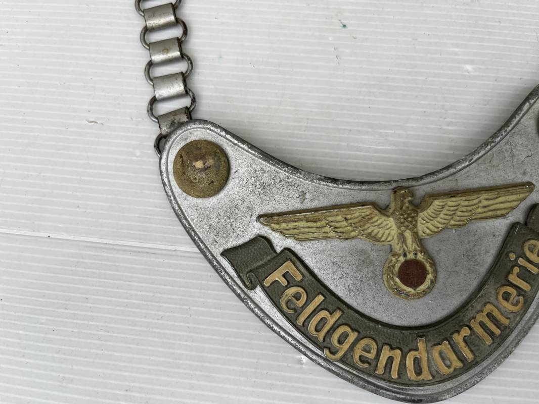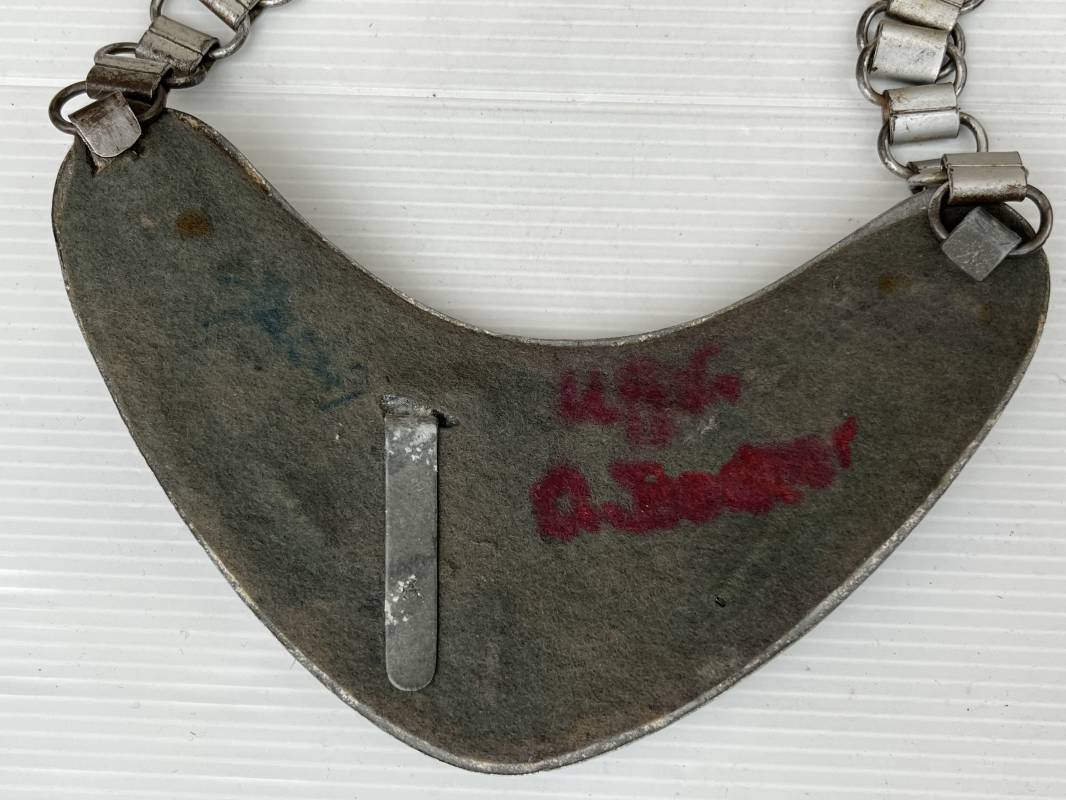 Rare hausse col d'un feldgendarme de la Wehrmacht. Hausse col du modèle 'lourd'. Cette hausse col a été trouvée en succession familiale a Paris . Cette hausse col n a jamais été en collection Marquage fabricant ' A ' ( Assmann) sur la patelette metallique Peinture argentée et phosphorescente d'origine. Cette plaque est 100% nature et n'a jamais été nettoyée. Revers en drap feldgrau avec non manuscrit du gendarme militaire . Deux pattes métalliques plates de fixation. Chaine d'origine à 43 maillons. Peinture gris argent d'origine. Très belle hausse col, légèrement portée en parfait état. Très belle patine générale . Rare. Ref 22304