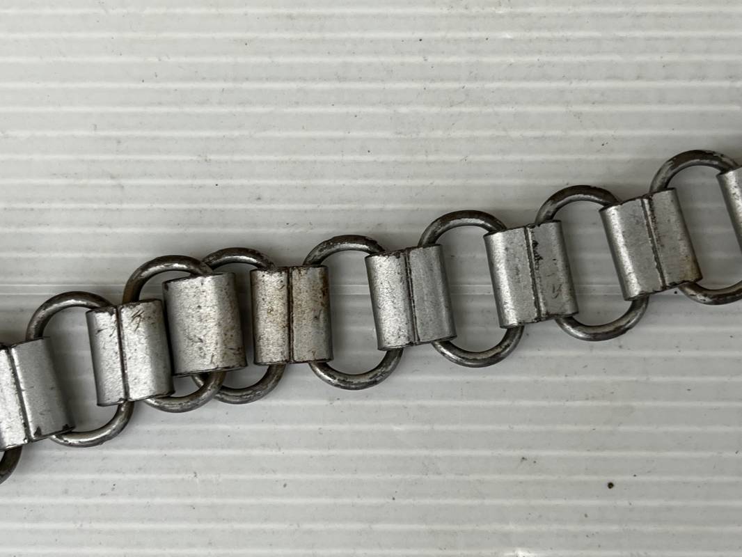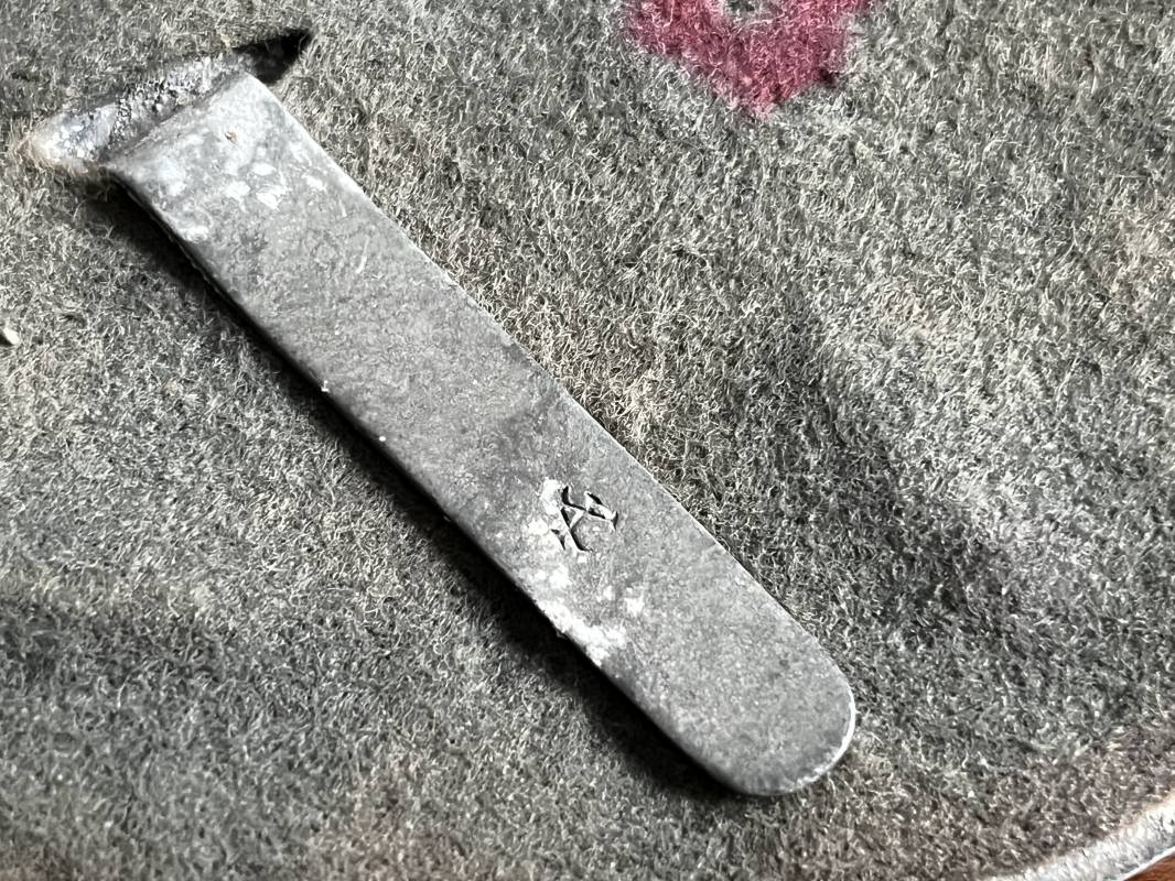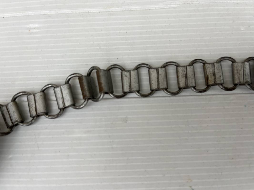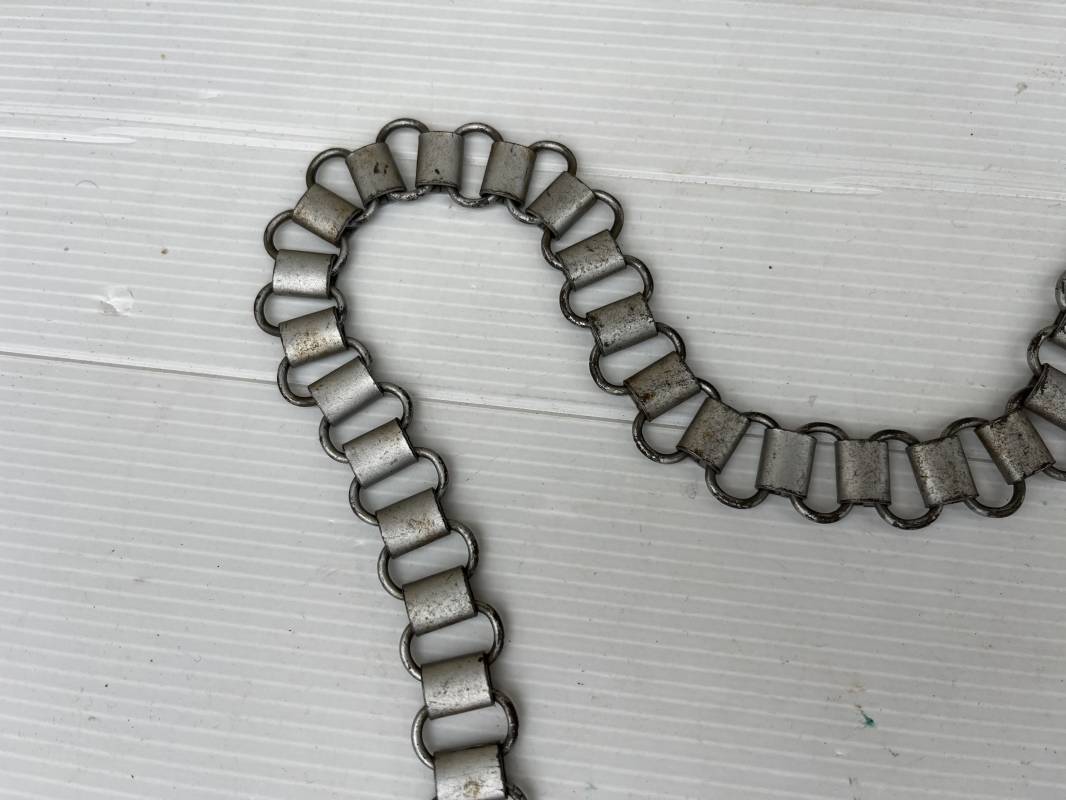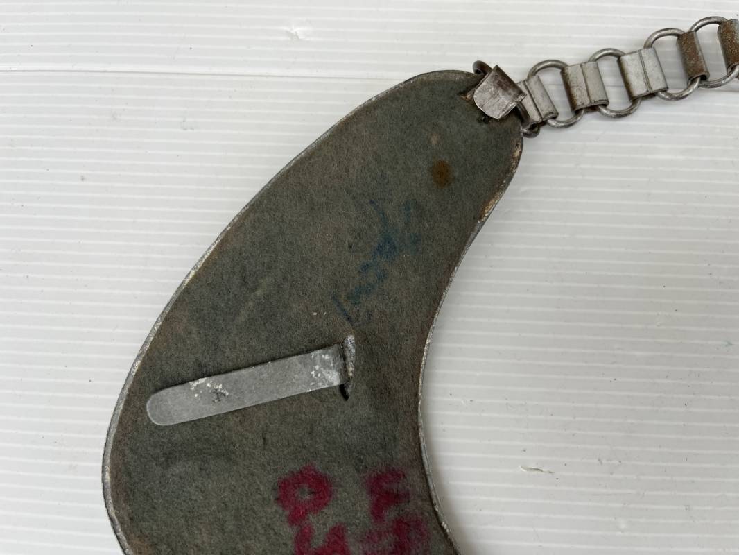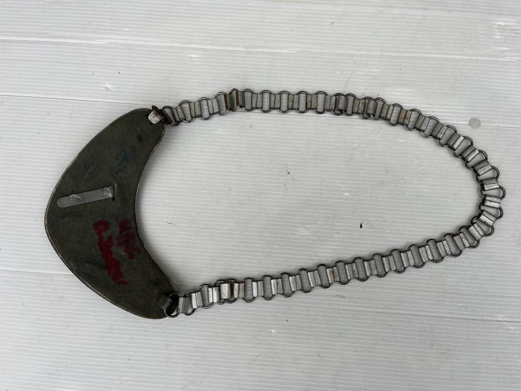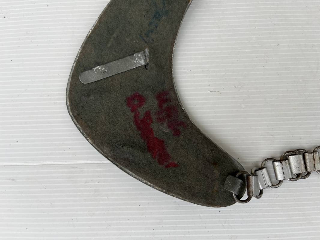 Rare hausse col d'un feldgendarme de la Wehrmacht. Hausse col du modèle 'lourd'. Cette hausse col a été trouvée en succession familiale a Paris . Cette hausse col n a jamais été en collection Marquage fabricant ' A ' ( Assmann) sur la patelette metallique Peinture argentée et phosphorescente d'origine. Cette plaque est 100% nature et n'a jamais été nettoyée. Revers en drap feldgrau avec non manuscrit du gendarme militaire . Deux pattes métalliques plates de fixation. Chaine d'origine à 43 maillons. Peinture gris argent d'origine. Très belle hausse col, légèrement portée en parfait état. Très belle patine générale . Rare. Ref 22304