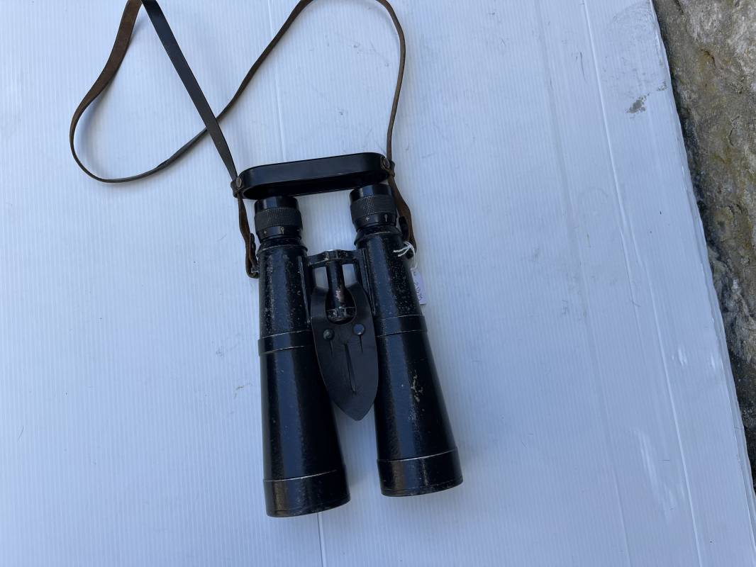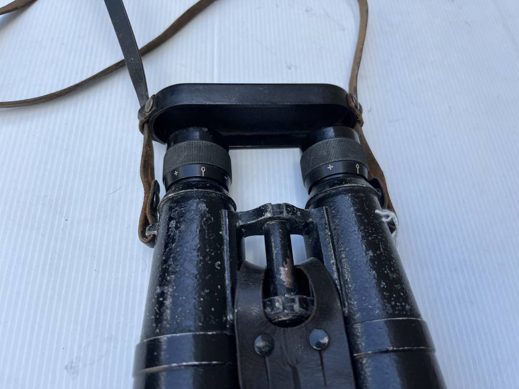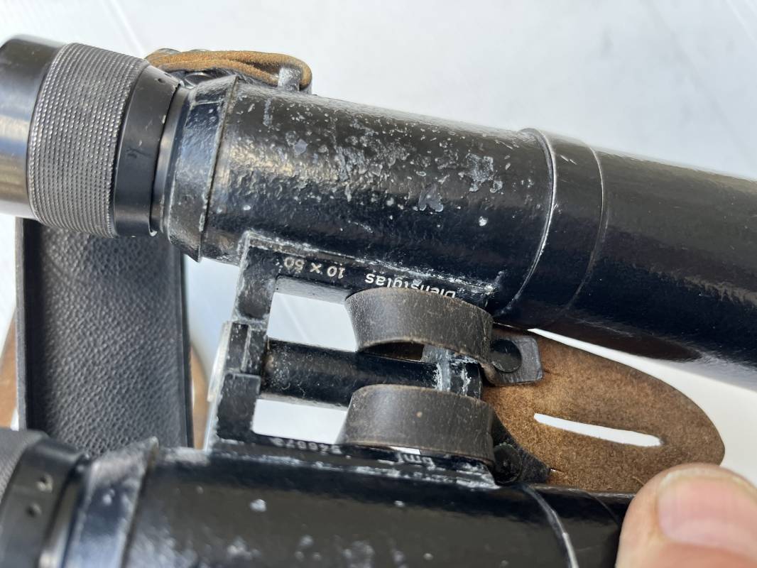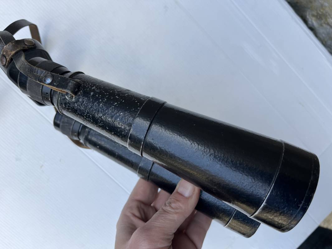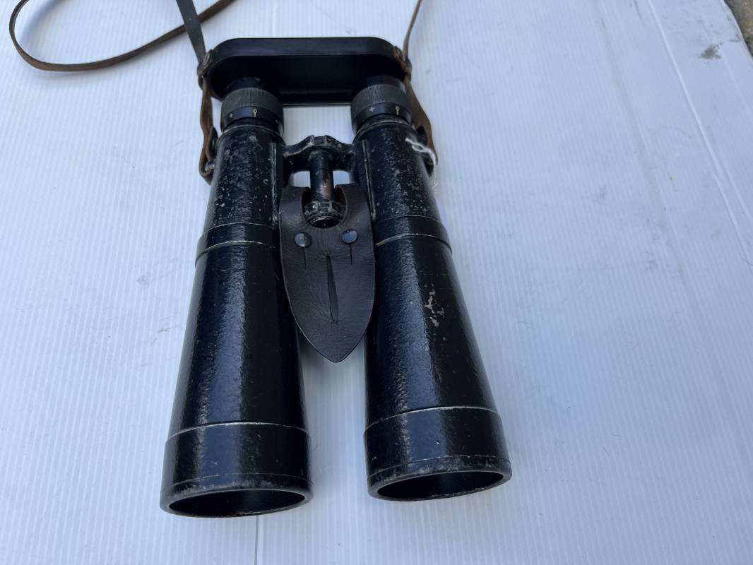 Rare paire de jumelles longues du modèle anti chars en peinture noire avec sangle , couvre optic et boutonnière cuir . Fabricant bmj, marquage sur monture avec numéro matricule, grossissement 10x50, optiques clairs avec réticule sur occulaire droit . Peinture noire d'origine, sangle en cuir et rivets métalliques. Protège optiques en bakélite noire , boutonnière cuir et rivets metalliques . Belle paire légèrement portée en bel état . 1943/44 Ref 21879