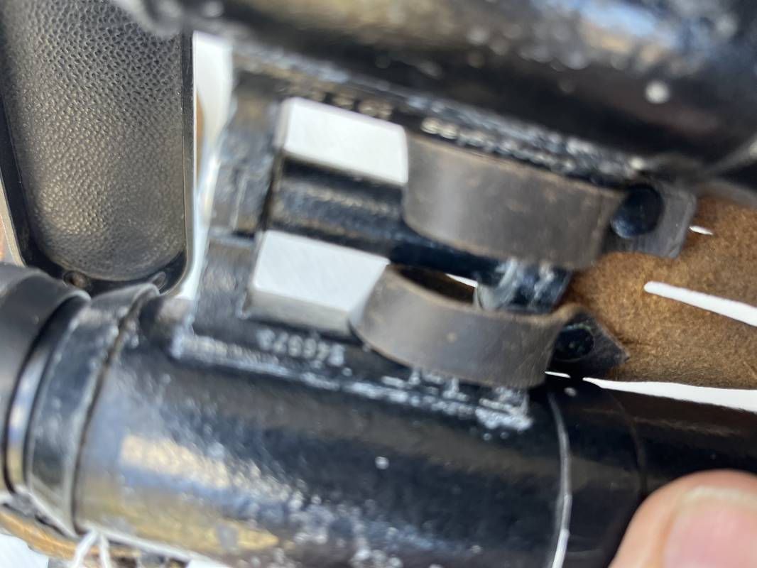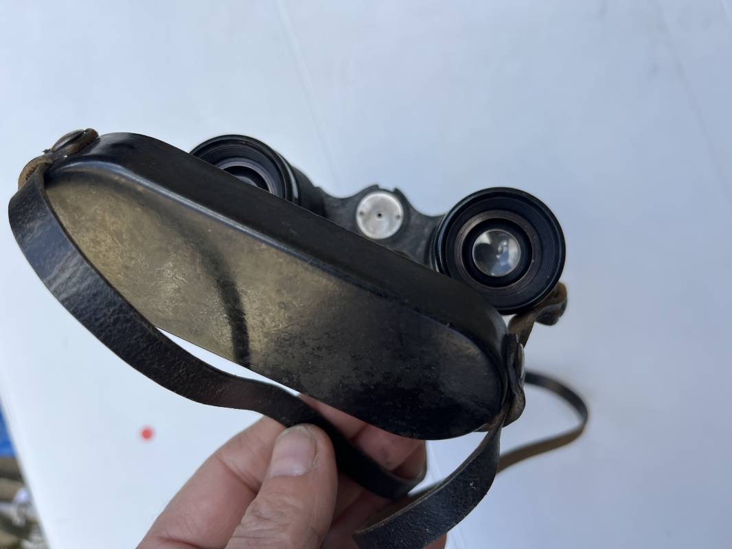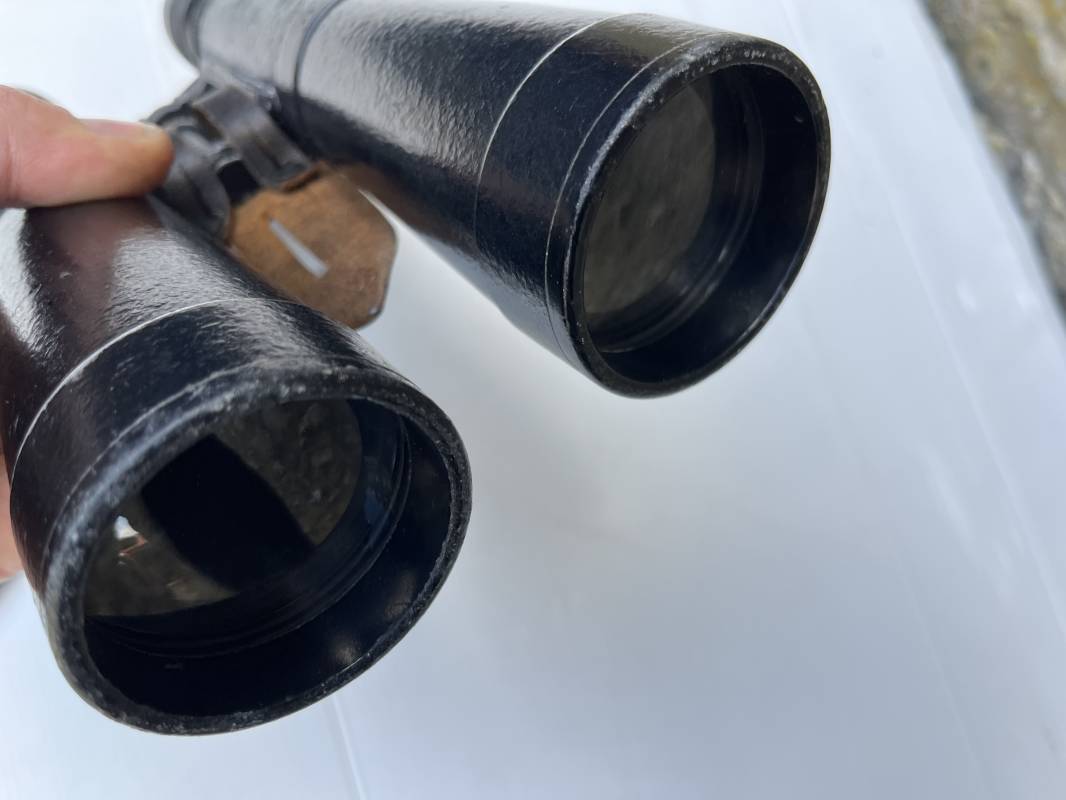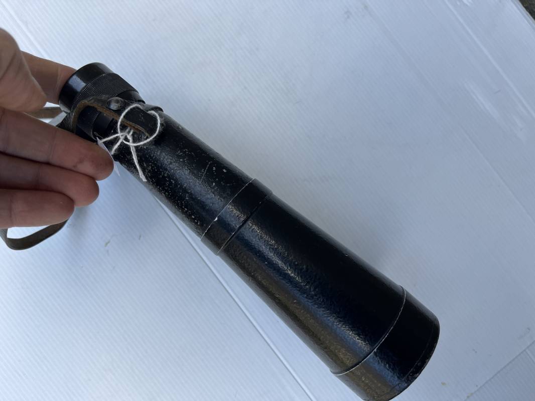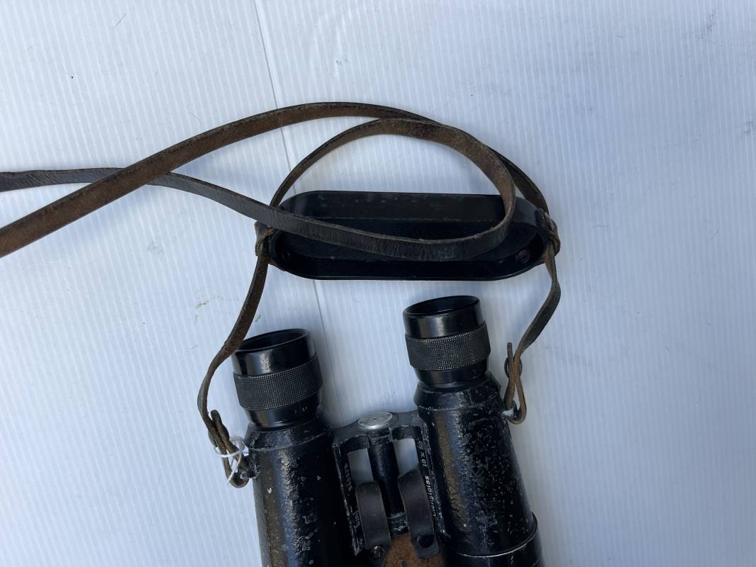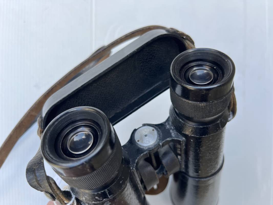 Rare paire de jumelles longues du modèle anti chars en peinture noire avec sangle , couvre optic et boutonnière cuir . Fabricant bmj, marquage sur monture avec numéro matricule, grossissement 10x50, optiques clairs avec réticule sur occulaire droit . Peinture noire d'origine, sangle en cuir et rivets métalliques. Protège optiques en bakélite noire , boutonnière cuir et rivets metalliques . Belle paire légèrement portée en bel état . 1943/44 Ref 21879