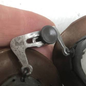 Marquage fabricant sur articulation nasale QRS 39 . Monture métallique , pourtour en caoutchouc marron clair . Fabrication précoce . Verres blancs . Sangle élastique en toile marron , crochets et boucle métallques . Boite d econditionnement d'origine en métal bronze . Compartiment intérieur pour pochette de verre de rechange . Pochette en coton de verre . Verres de rechange manquants . Bel ensemble homogéne légèrement porté en bel état 1939/45 Ref 18204