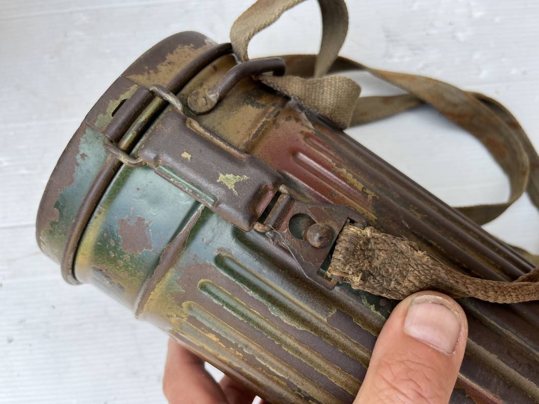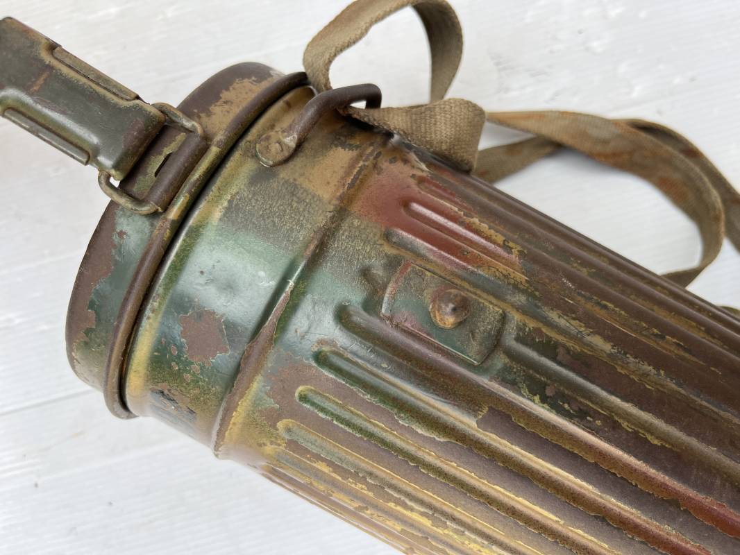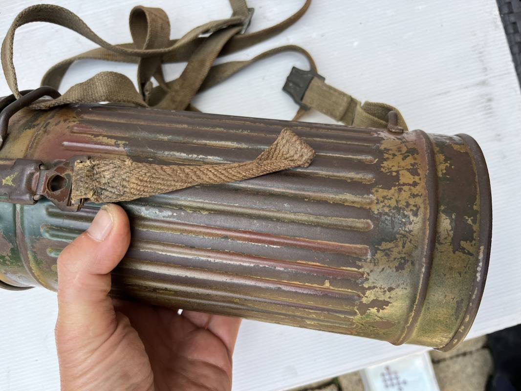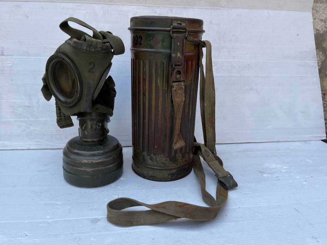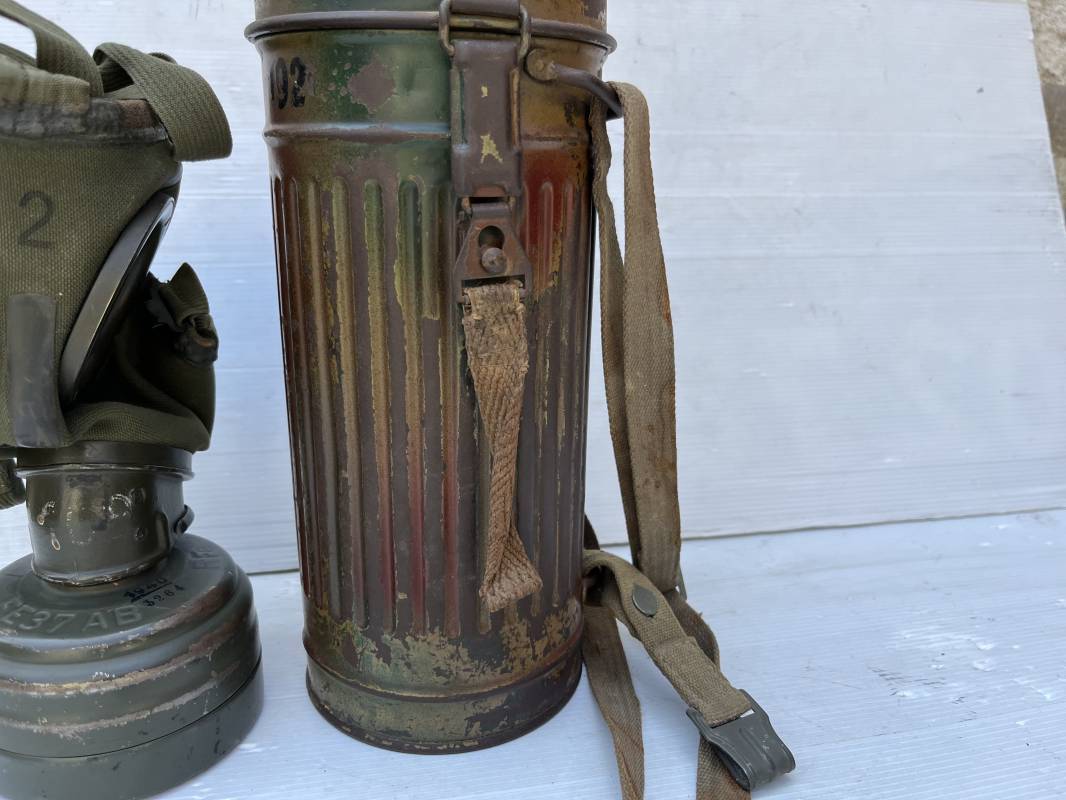 Rare masque de protection modèle 1938 camouflé trois tons de la Wehrmacht avec ses sangles ( longue et courte ) . Boitier métallique 28cm, peinture feldgrau d'origine recouverte d'une peinture camouflée trois tons vert jaune et brique appliquée au pistolet à peinture . Camouflage typique de a bataille de Normandie et des régiments de panzer grenadier Peinture non frottée non nettoyée . Fermoir à ressort et tirette . Sangles en toile d'origines Longue et courte . Verres de rechanges. Chiffon et ressort métallique en fond de boite. Masque en toilr caoutchoutée feldgrau souple . Complet en bel état. . Filtre FE 37 avec marquage encre daté 1940 . Trés bel ensemble porté en bel état . Trés belle patine générale . Authenticité du camouflage du boitier garanti . Rare 1943/45. Ref 21199
