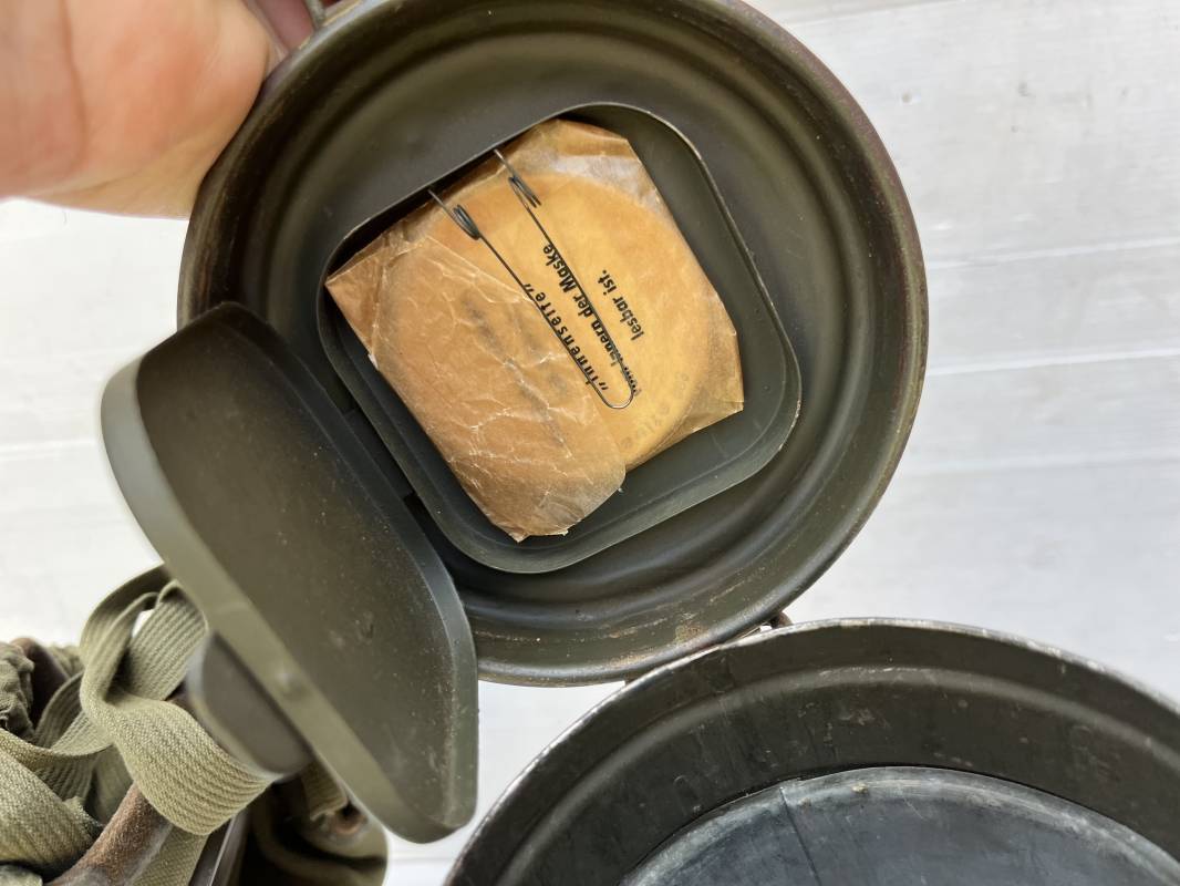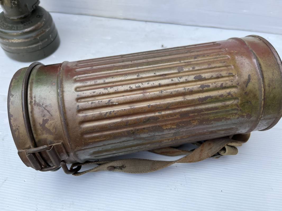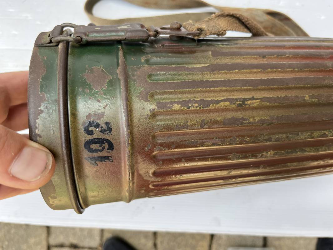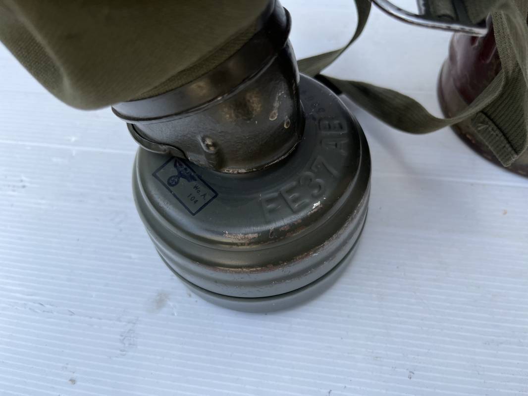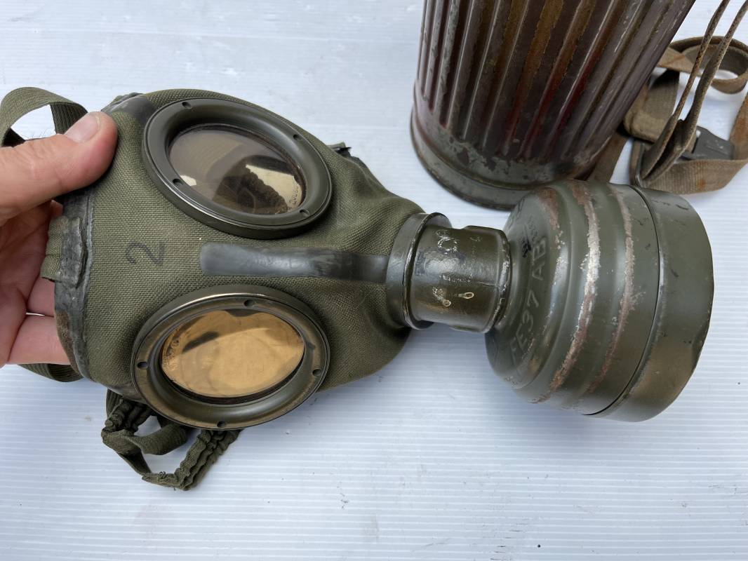 Rare masque de protection modèle 1938 camouflé trois tons de la Wehrmacht avec ses sangles ( longue et courte ) . Boitier métallique 28cm, peinture feldgrau d'origine recouverte d'une peinture camouflée trois tons vert jaune et brique appliquée au pistolet à peinture . Camouflage typique de a bataille de Normandie et des régiments de panzer grenadier Peinture non frottée non nettoyée . Fermoir à ressort et tirette . Sangles en toile d'origines Longue et courte . Verres de rechanges. Chiffon et ressort métallique en fond de boite. Masque en toilr caoutchoutée feldgrau souple . Complet en bel état. . Filtre FE 37 avec marquage encre daté 1940 . Trés bel ensemble porté en bel état . Trés belle patine générale . Authenticité du camouflage du boitier garanti . Rare 1943/45. Ref 21199