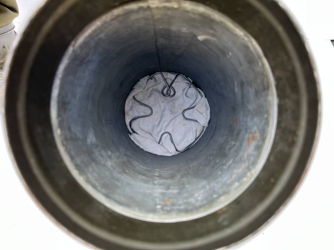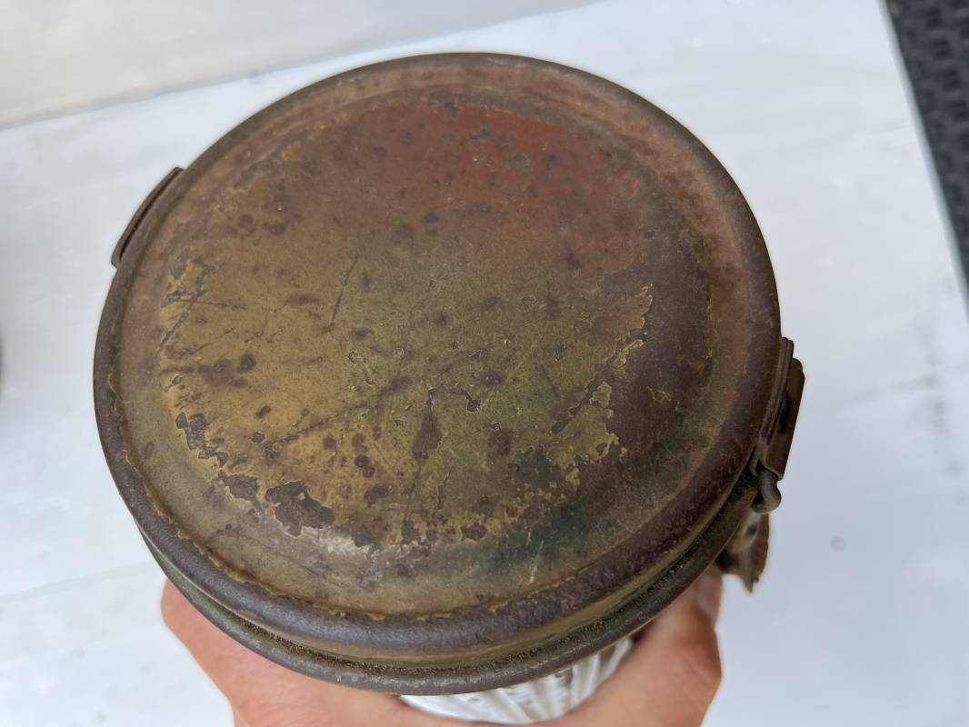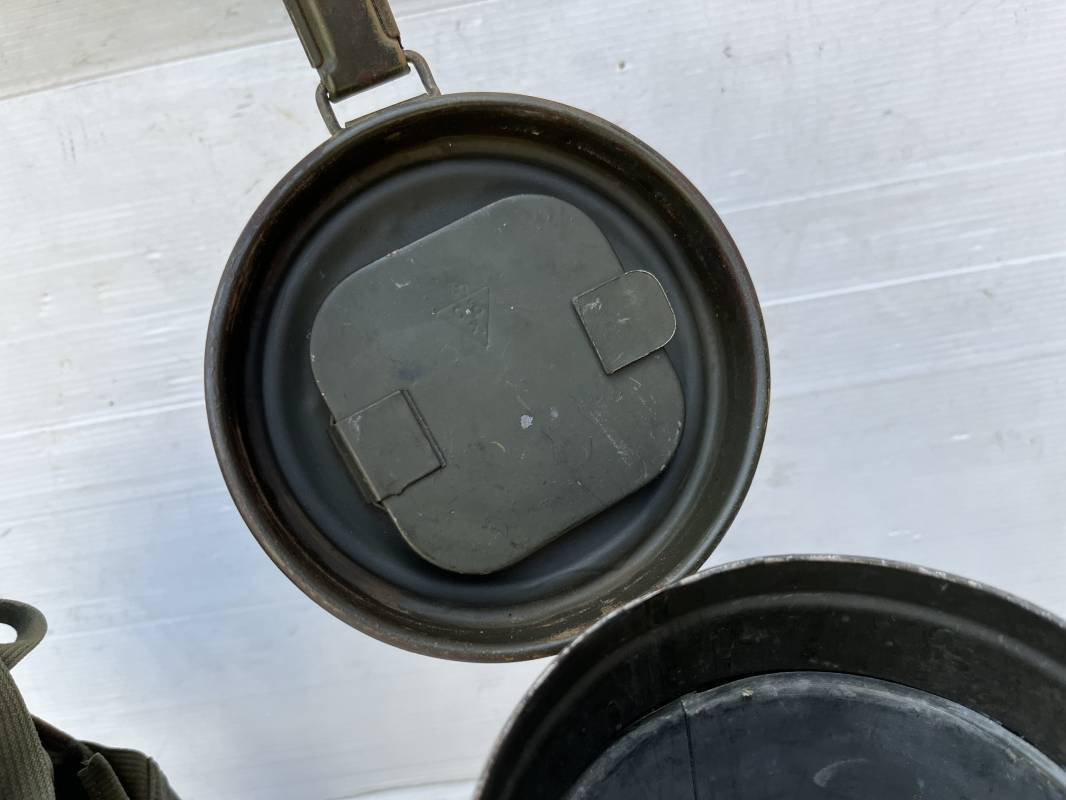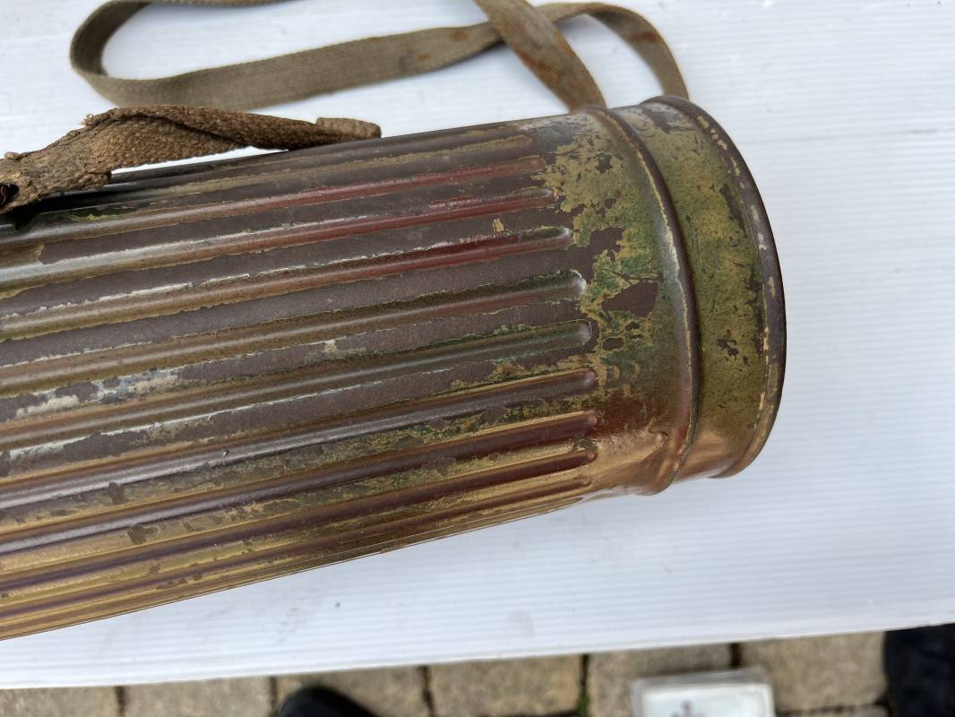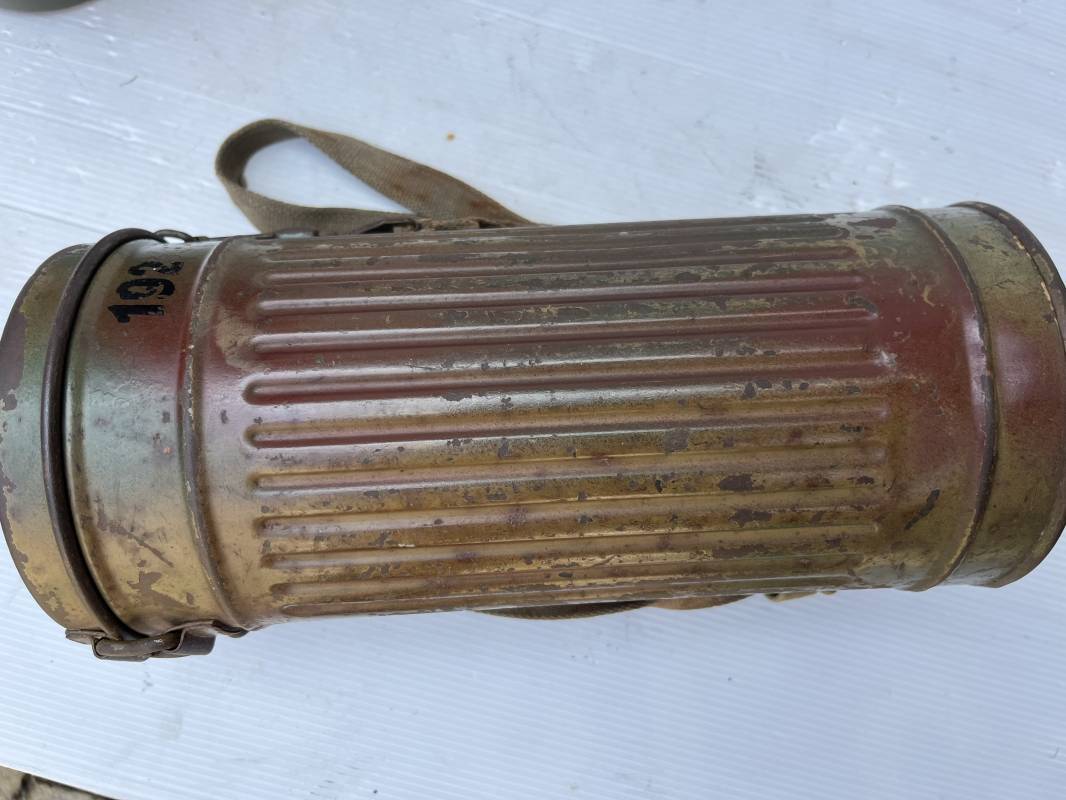 Rare masque de protection modèle 1938 camouflé trois tons de la Wehrmacht avec ses sangles ( longue et courte ) . Boitier métallique 28cm, peinture feldgrau d'origine recouverte d'une peinture camouflée trois tons vert jaune et brique appliquée au pistolet à peinture . Camouflage typique de a bataille de Normandie et des régiments de panzer grenadier Peinture non frottée non nettoyée . Fermoir à ressort et tirette . Sangles en toile d'origines Longue et courte . Verres de rechanges. Chiffon et ressort métallique en fond de boite. Masque en toilr caoutchoutée feldgrau souple . Complet en bel état. . Filtre FE 37 avec marquage encre daté 1940 . Trés bel ensemble porté en bel état . Trés belle patine générale . Authenticité du camouflage du boitier garanti . Rare 1943/45. Ref 21199