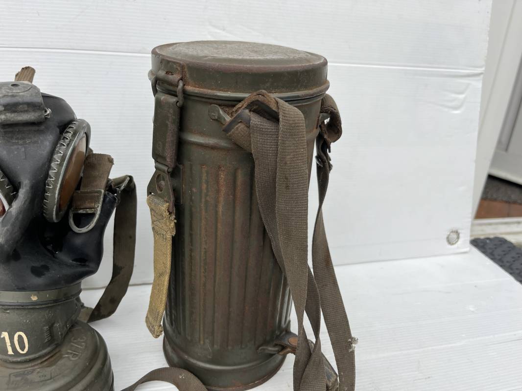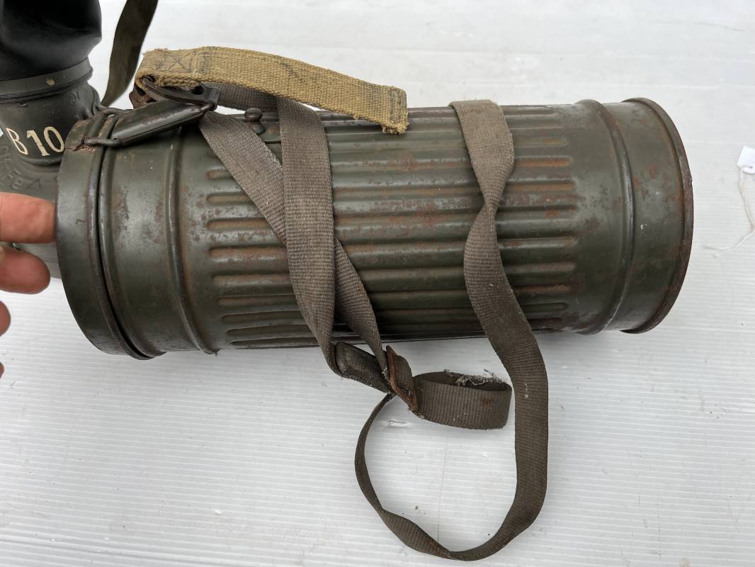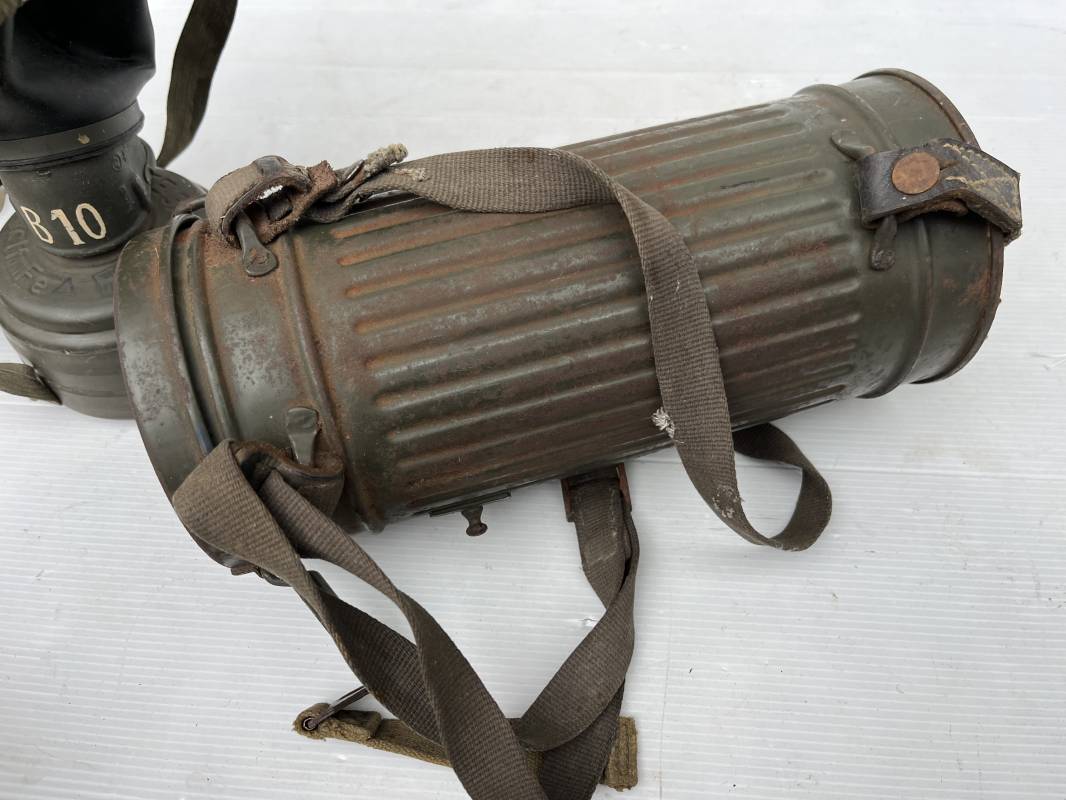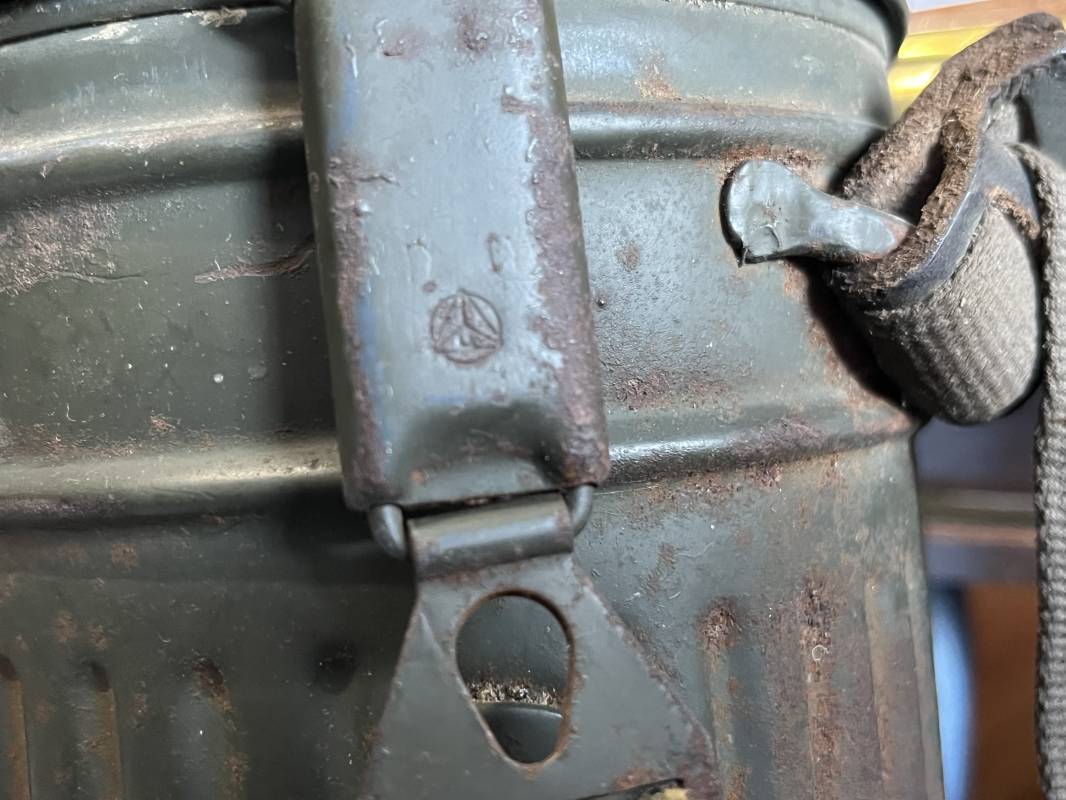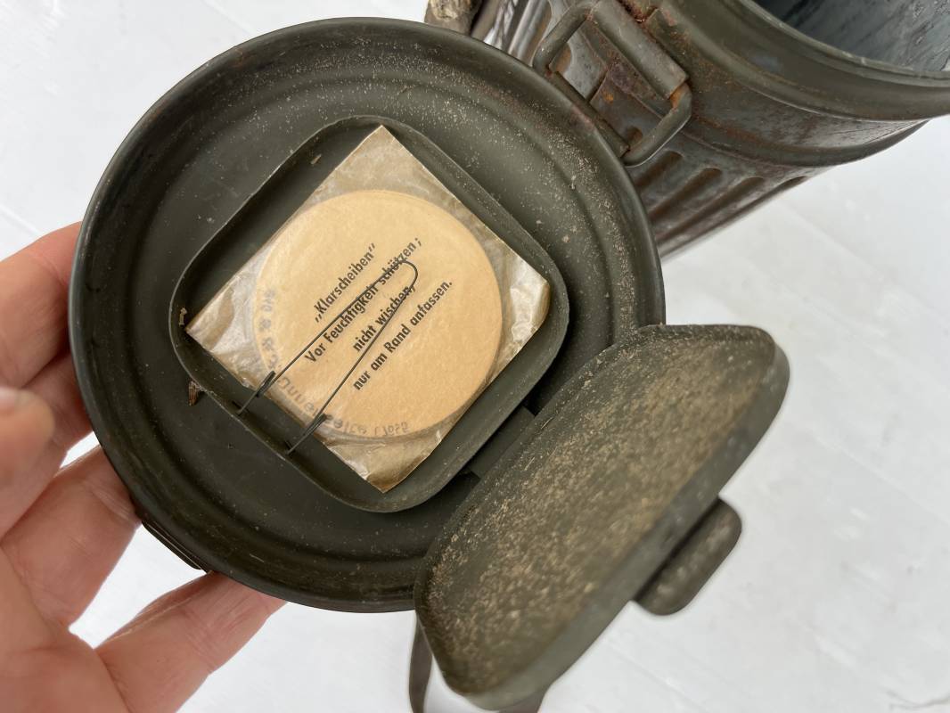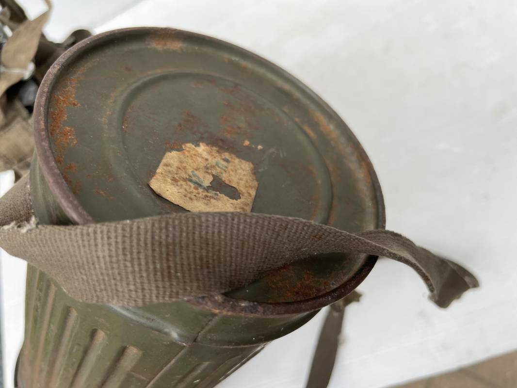 Masque de protection modèle 1938 de la Wehrmacht avec ses sangles longue et courte et les renforts en cuir . Boitier métallique 28cm, peinture feldgrau d'origine. Fermoir à ressort et tirette. Marquage logo fabricant sur fermoir . Longue et courte sangles en toile d'origine avec les renforts en cuir . Verres de rechanges. Nominette papier avec nom du soldat Kanonier POHL . Chiffon et ressort métallique en fond de boite. Masque en caoutchouc noir souple. Complet en bel état. Filtre FE 41 avec marquage encre. Bel ensemble 100% dans son jus et intouché 1939/40. Ref 21648