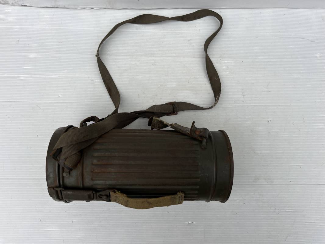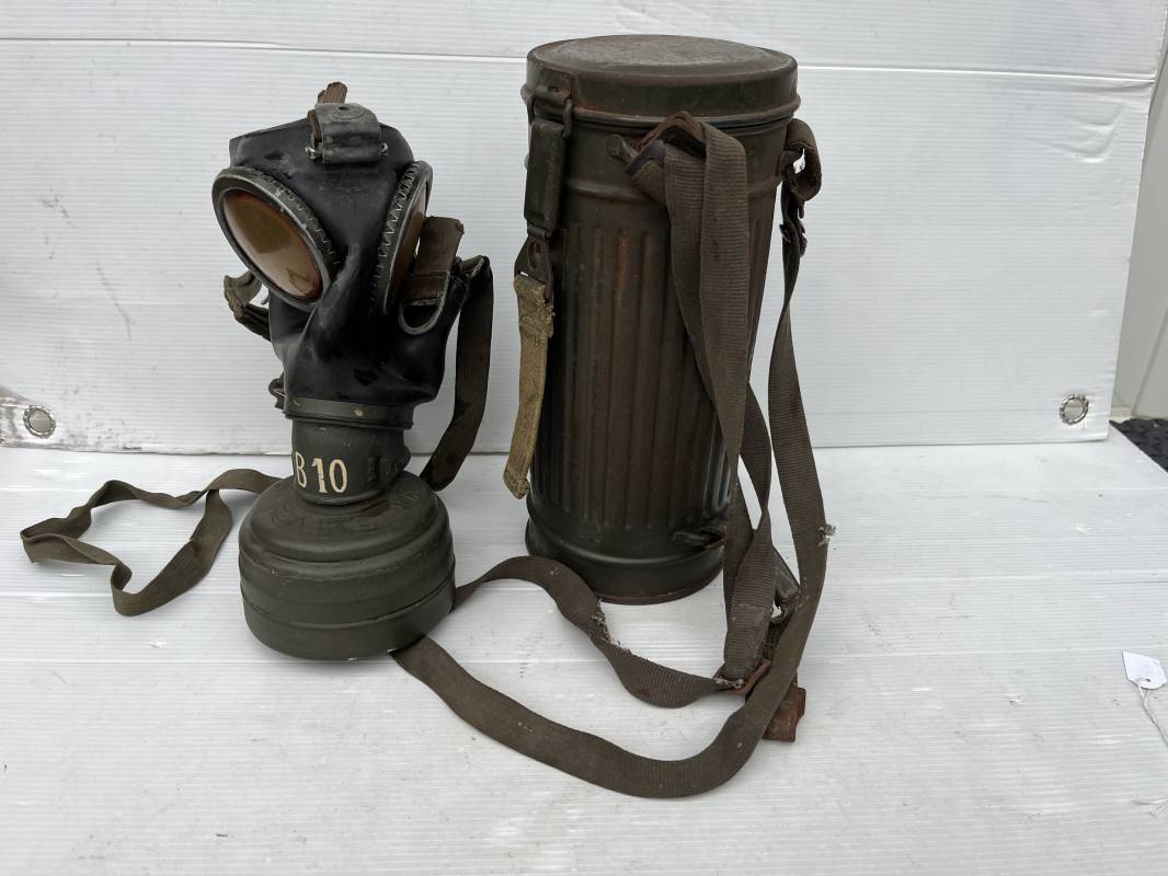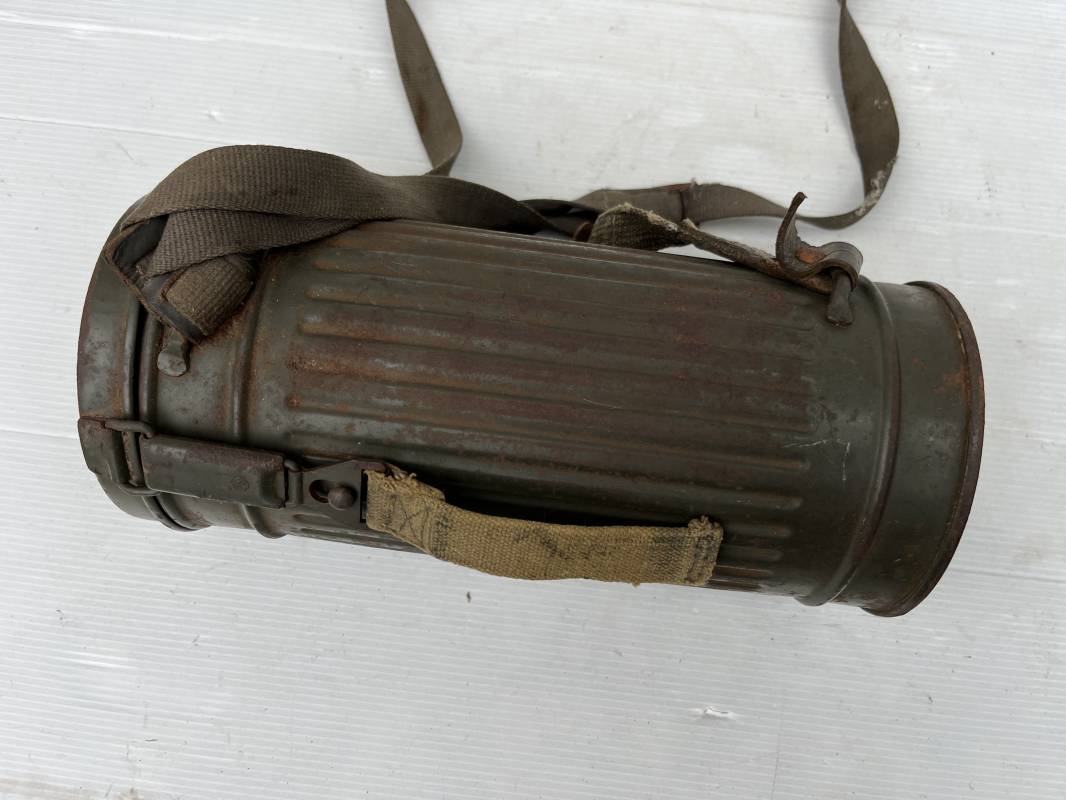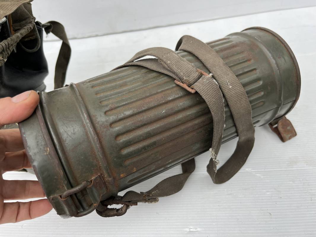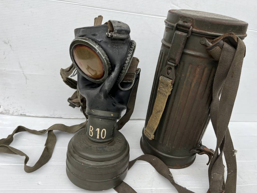 Masque de protection modèle 1938 de la Wehrmacht avec ses sangles longue et courte et les renforts en cuir . Boitier métallique 28cm, peinture feldgrau d'origine. Fermoir à ressort et tirette. Marquage logo fabricant sur fermoir . Longue et courte sangles en toile d'origine avec les renforts en cuir . Verres de rechanges. Nominette papier avec nom du soldat Kanonier POHL . Chiffon et ressort métallique en fond de boite. Masque en caoutchouc noir souple. Complet en bel état. Filtre FE 41 avec marquage encre. Bel ensemble 100% dans son jus et intouché 1939/40. Ref 21648