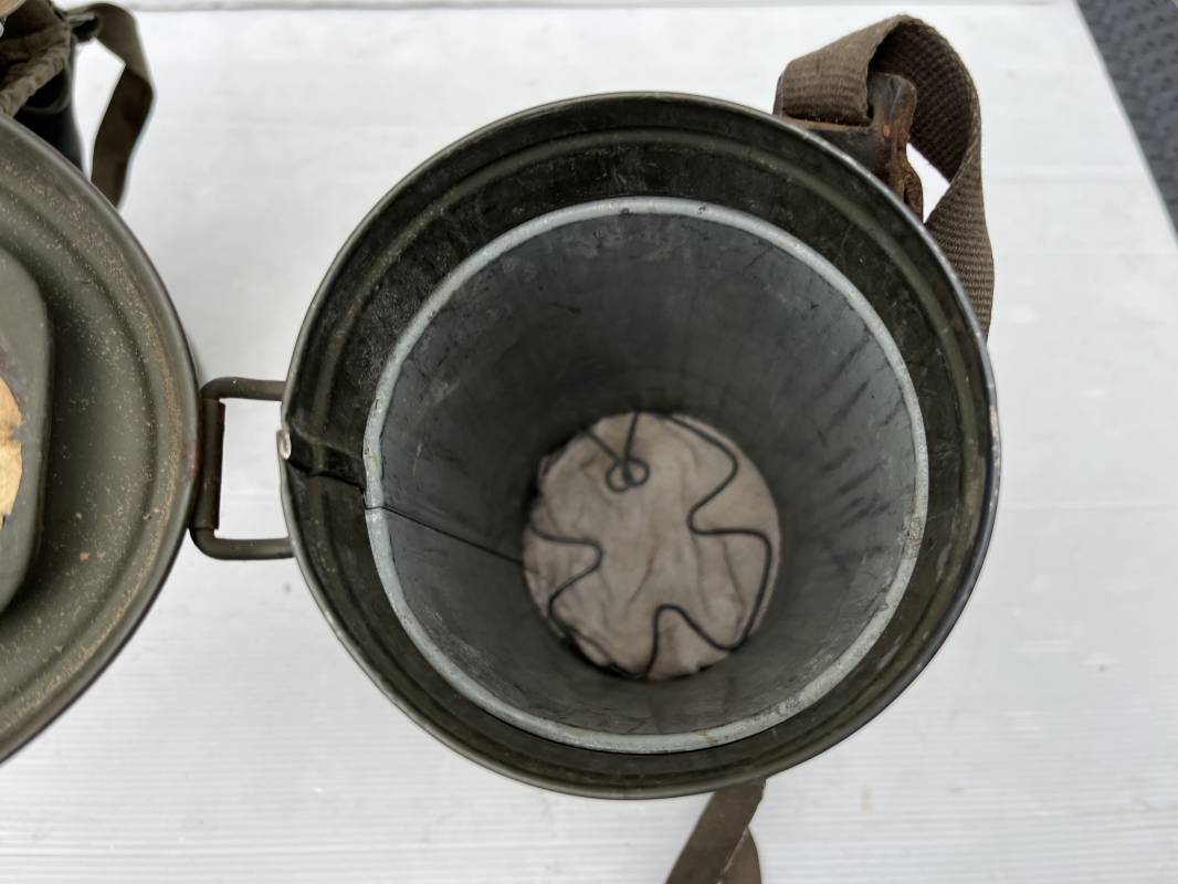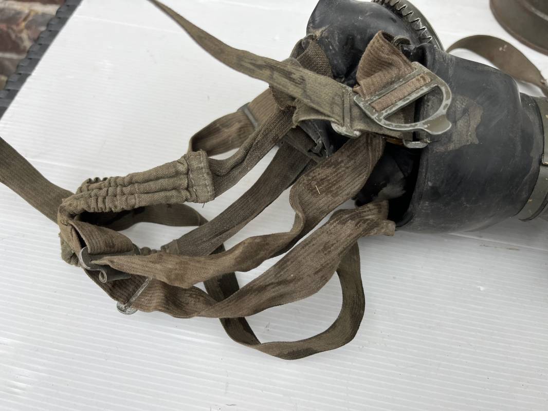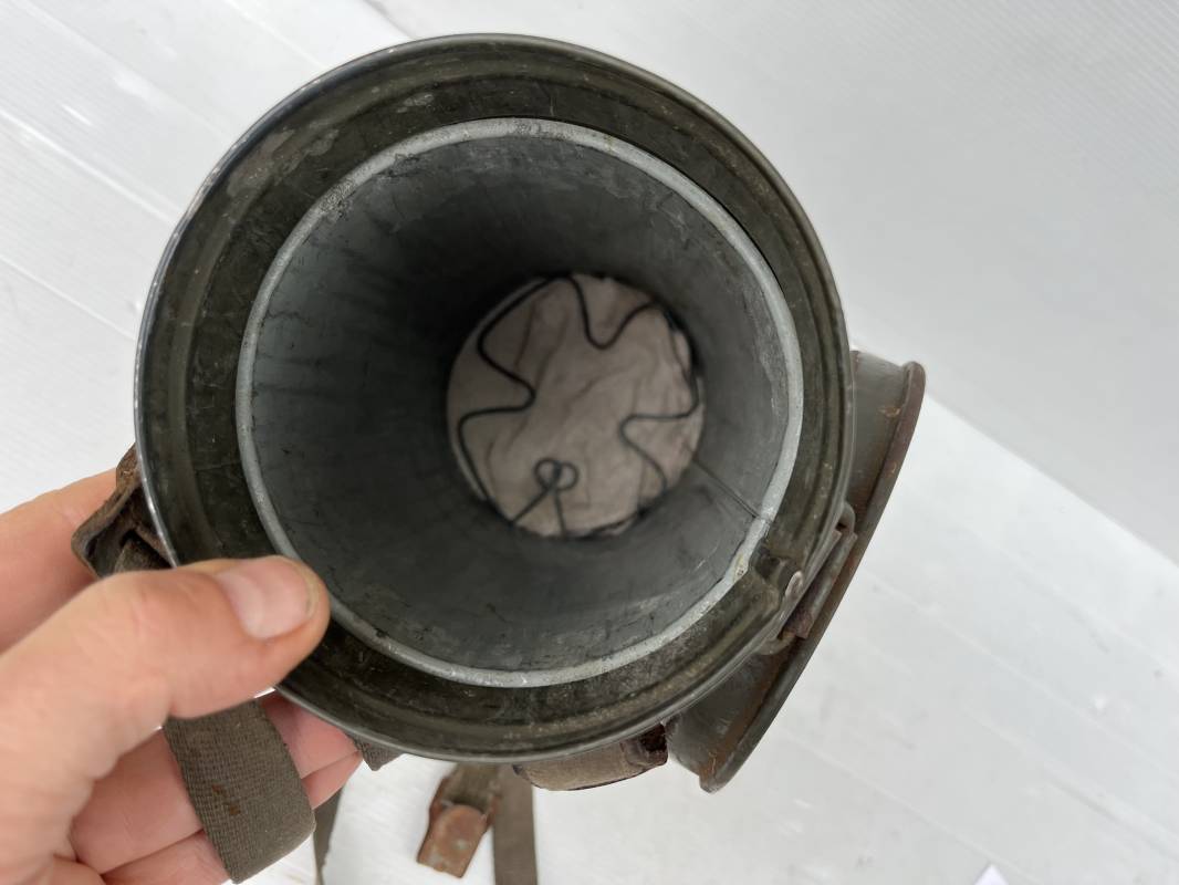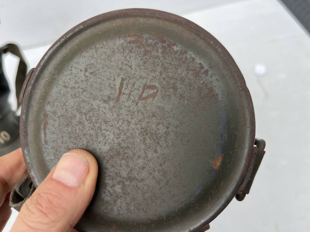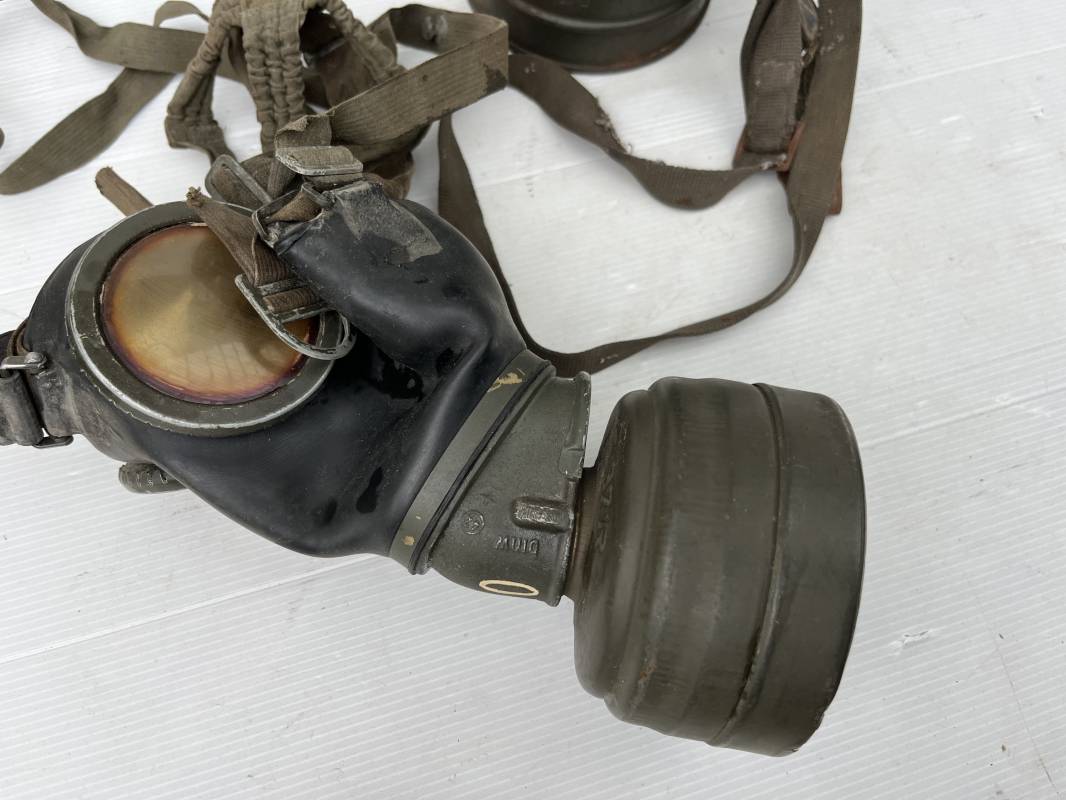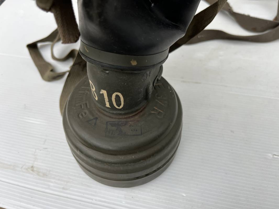 Masque de protection modèle 1938 de la Wehrmacht avec ses sangles longue et courte et les renforts en cuir . Boitier métallique 28cm, peinture feldgrau d'origine. Fermoir à ressort et tirette. Marquage logo fabricant sur fermoir . Longue et courte sangles en toile d'origine avec les renforts en cuir . Verres de rechanges. Nominette papier avec nom du soldat Kanonier POHL . Chiffon et ressort métallique en fond de boite. Masque en caoutchouc noir souple. Complet en bel état. Filtre FE 41 avec marquage encre. Bel ensemble 100% dans son jus et intouché 1939/40. Ref 21648