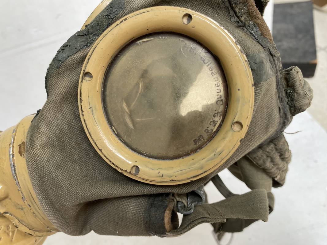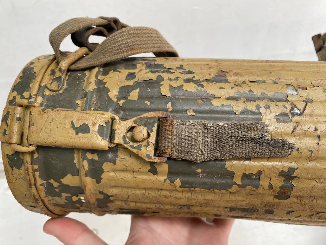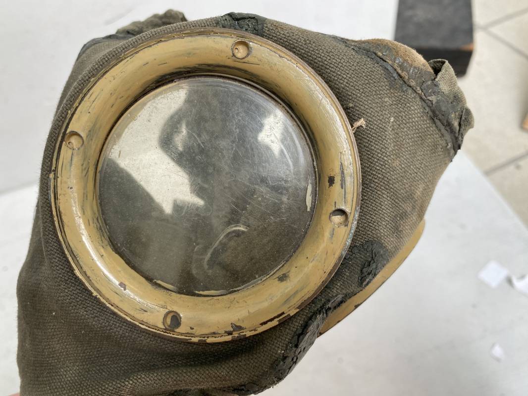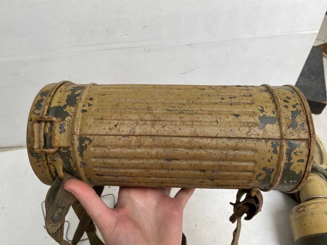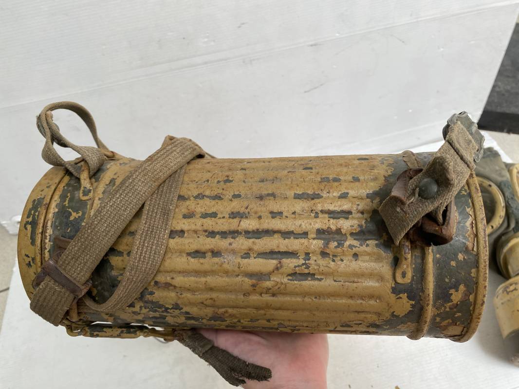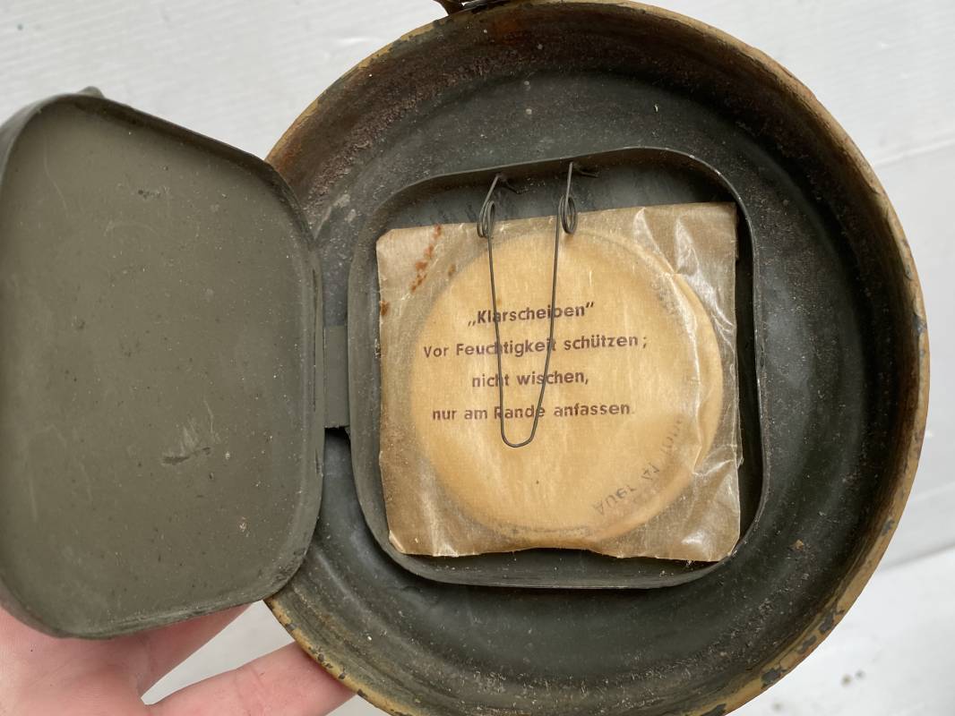 Très beau masque de protection de la Wehrmacht du modèle Tropical avec sangles. Cet ensemble a été retrouvé en succession et n'a jamais été en collection. Boitier métallique modèle 1938 , 275mm de long. Peinture feldgrau recouverte d'une peinture jaune sable appliquée mains d'origine. Marquage sous couvercle daté 1940. Nominette papier' Fu. Klessius'. Verres de rechange dans le voitier sous le rabat . Tirette à ressort avec lanière en toile dont l'extrémité est manquante. Masque en toile caoutchouc feldgrau complet avec ses sangles en coton. Les parties métalliques sont peintes en jaune sable. Occulaires, filtre FE 42. Ressort métallique en fond de boitier. Sangles longue et courte d'origines. Boucles et rivets en alu peints en vert. Renforts en cuir. Très bel ensemble intouché 100% nature 1940/42.Rare Ref 17888