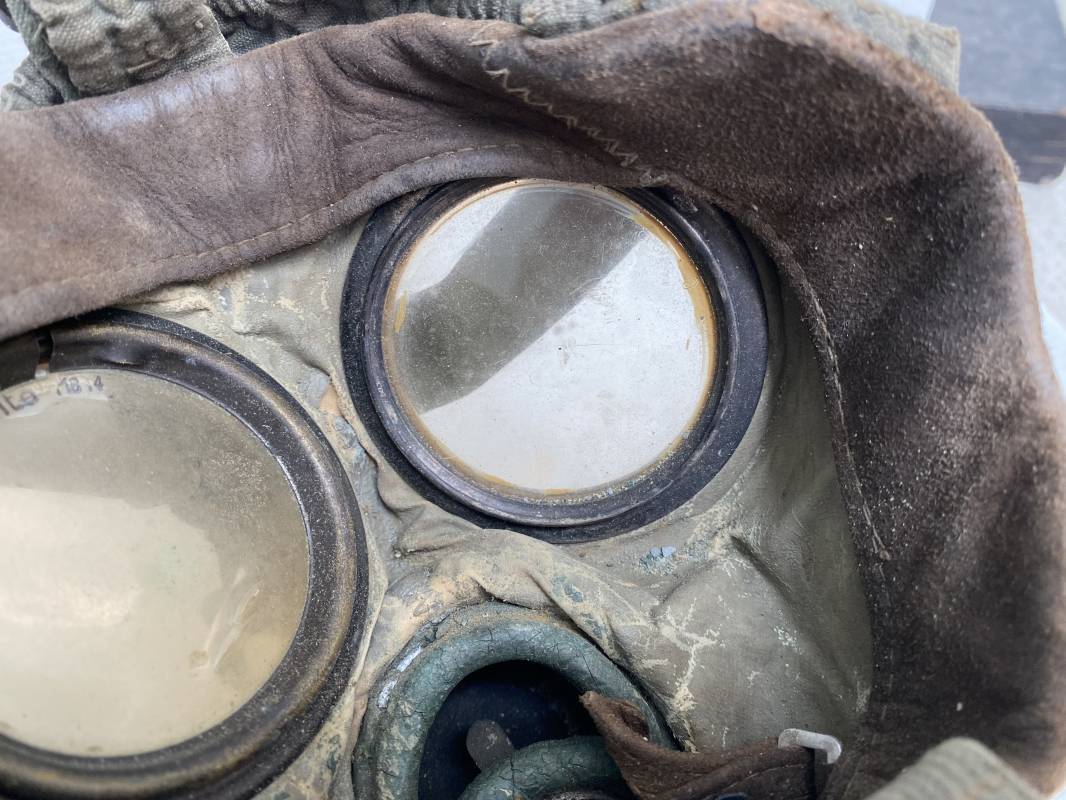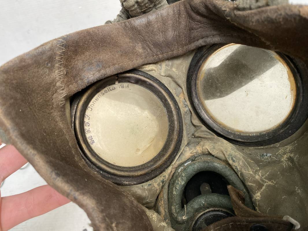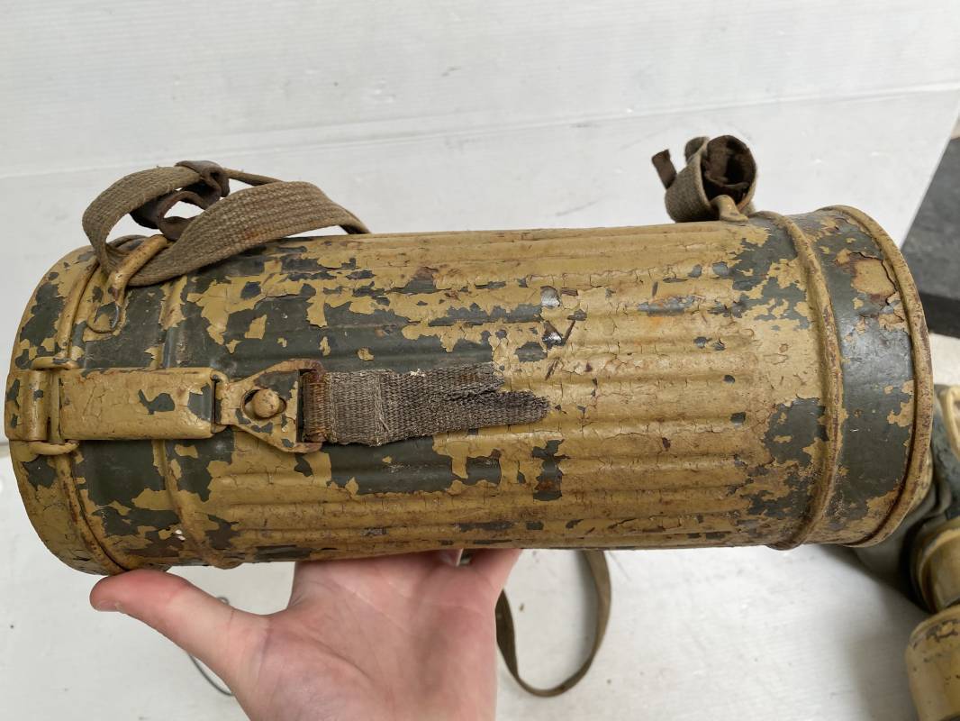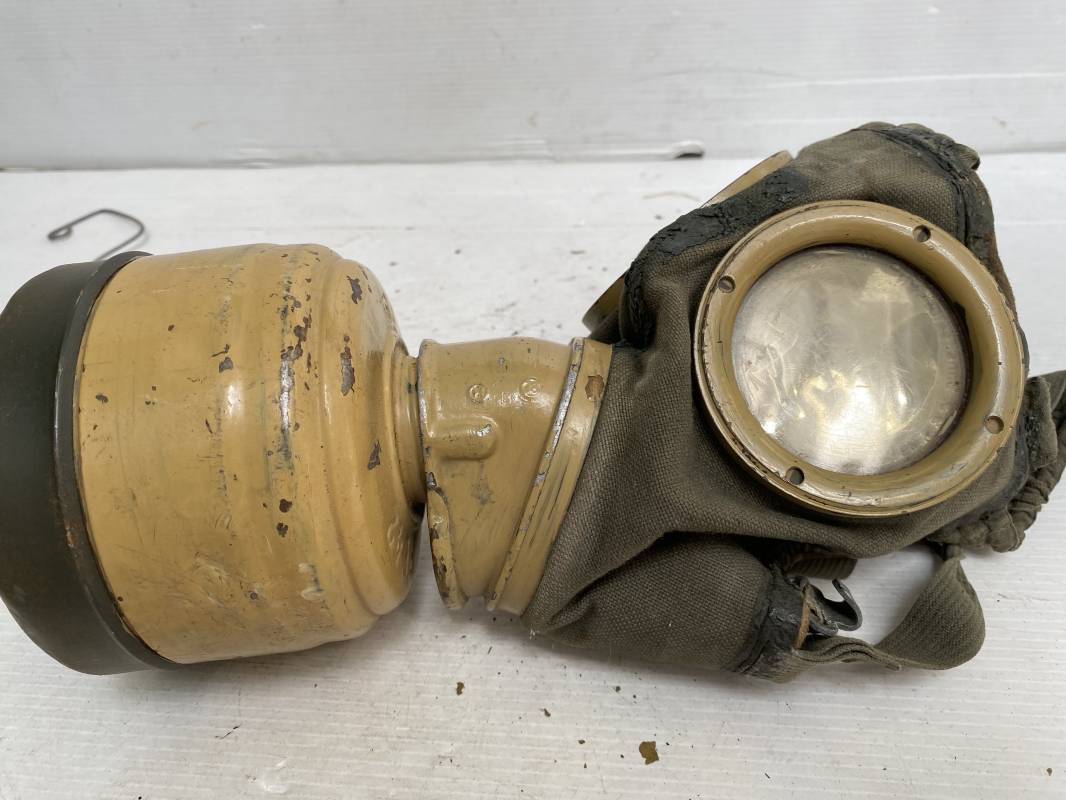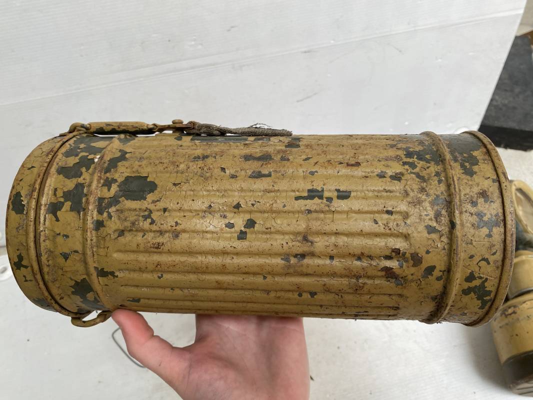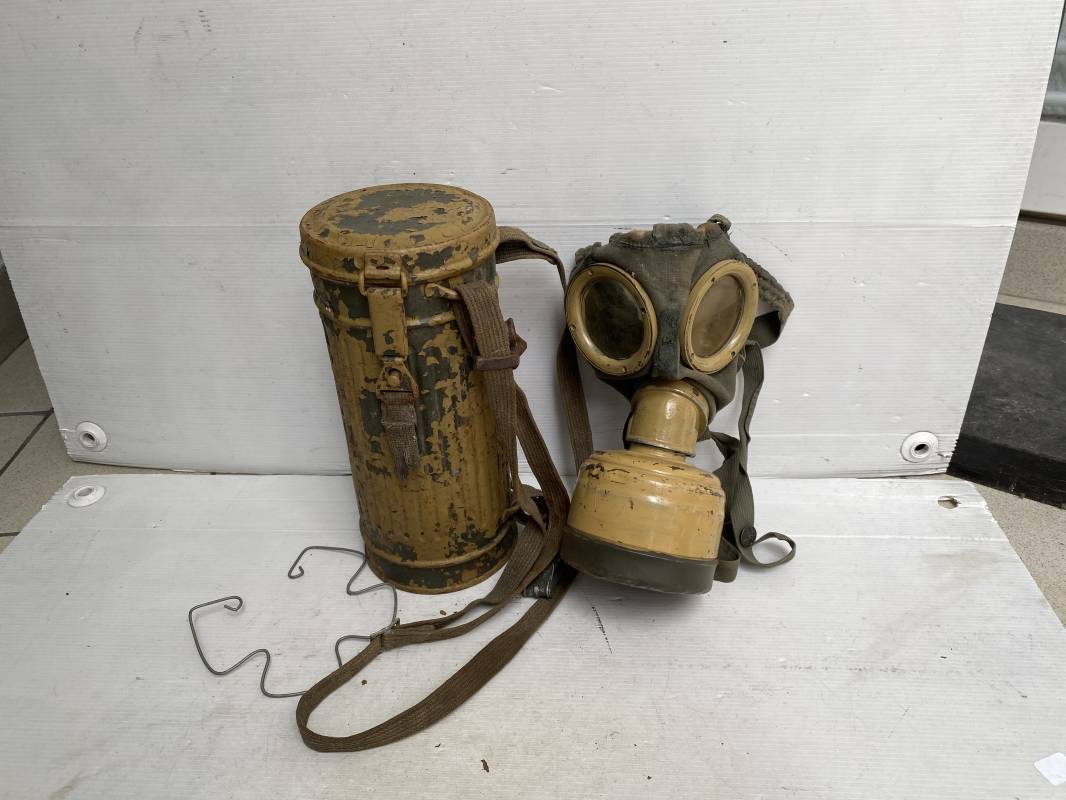 Très beau masque de protection de la Wehrmacht du modèle Tropical avec sangles. Cet ensemble a été retrouvé en succession et n'a jamais été en collection. Boitier métallique modèle 1938 , 275mm de long. Peinture feldgrau recouverte d'une peinture jaune sable appliquée mains d'origine. Marquage sous couvercle daté 1940. Nominette papier' Fu. Klessius'. Verres de rechange dans le voitier sous le rabat . Tirette à ressort avec lanière en toile dont l'extrémité est manquante. Masque en toile caoutchouc feldgrau complet avec ses sangles en coton. Les parties métalliques sont peintes en jaune sable. Occulaires, filtre FE 42. Ressort métallique en fond de boitier. Sangles longue et courte d'origines. Boucles et rivets en alu peints en vert. Renforts en cuir. Très bel ensemble intouché 100% nature 1940/42.Rare Ref 17888