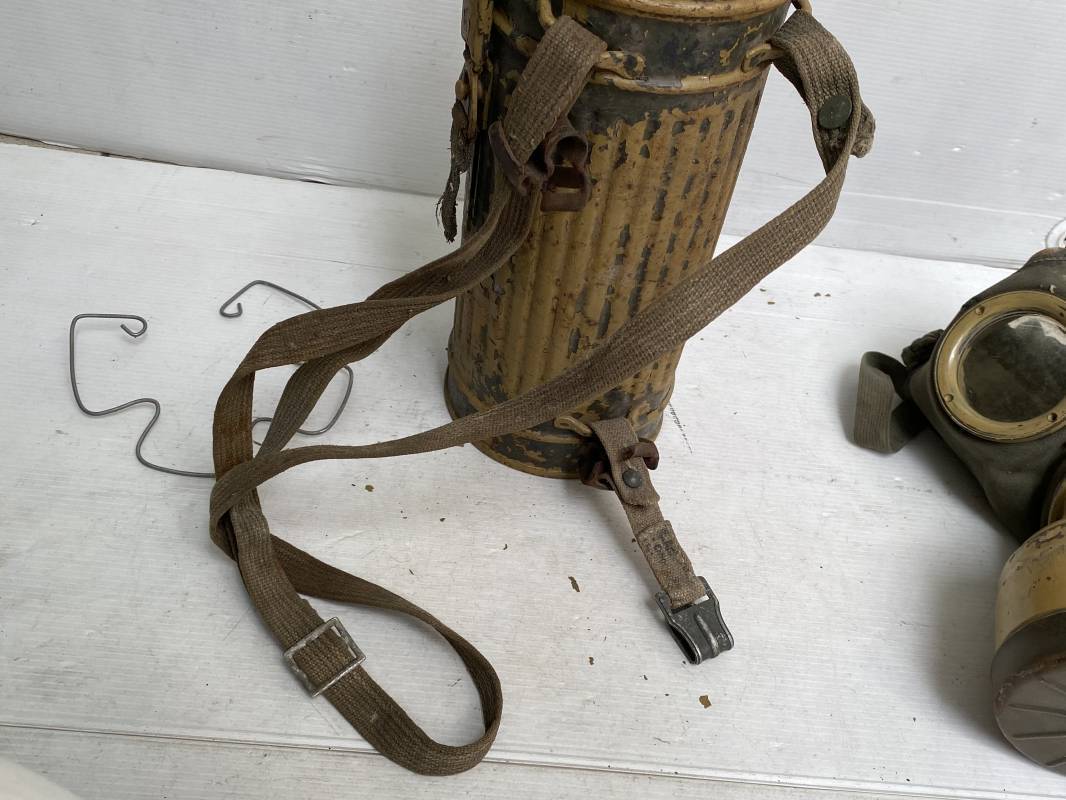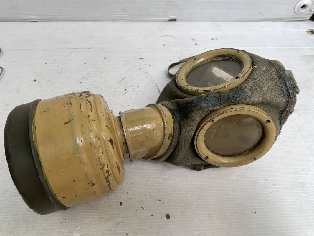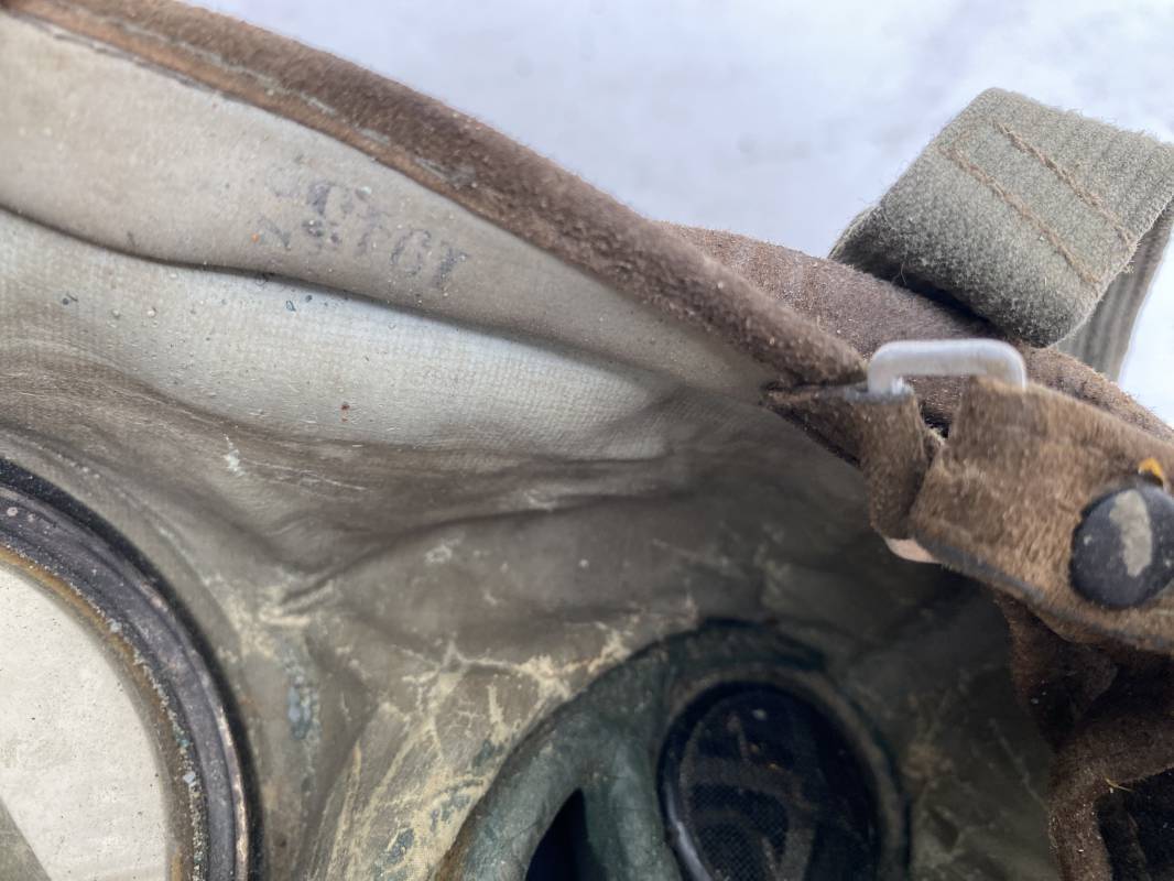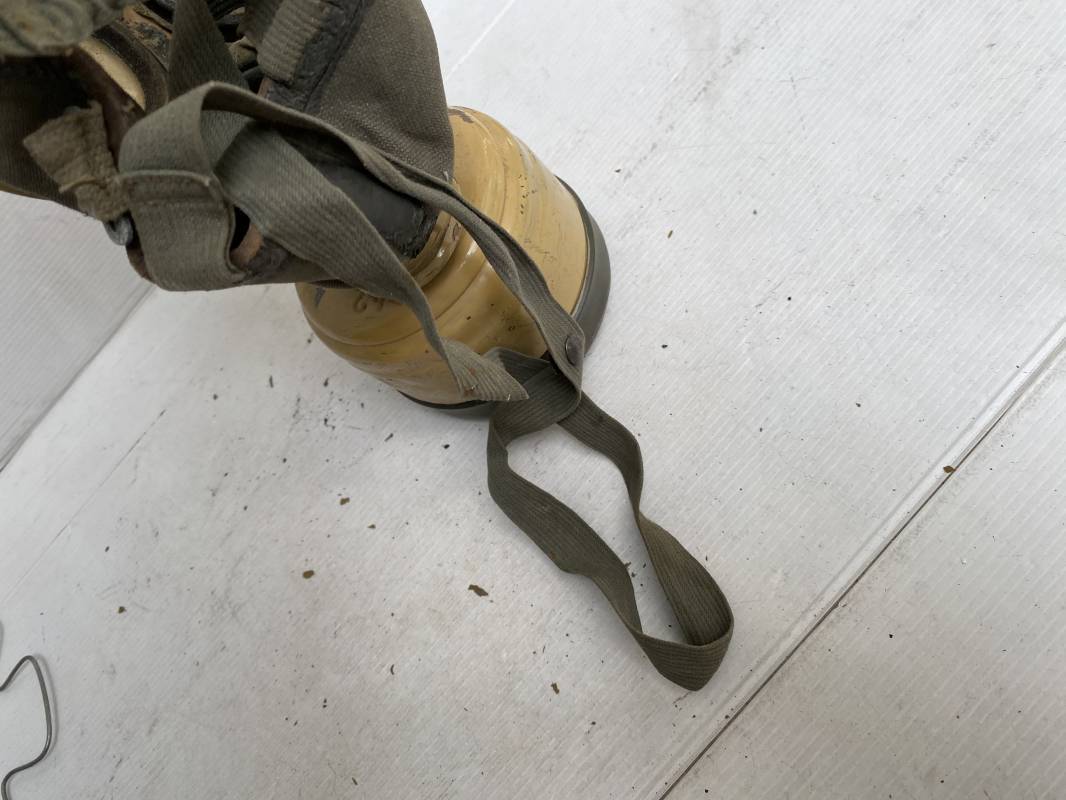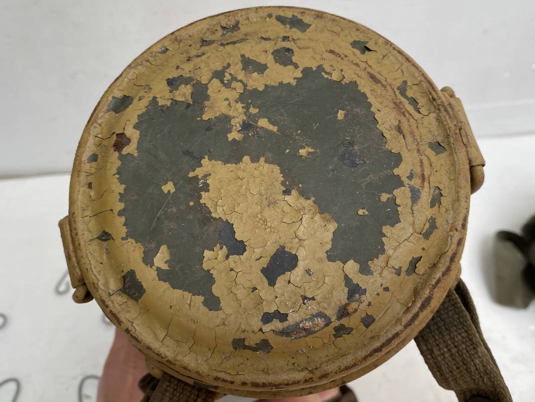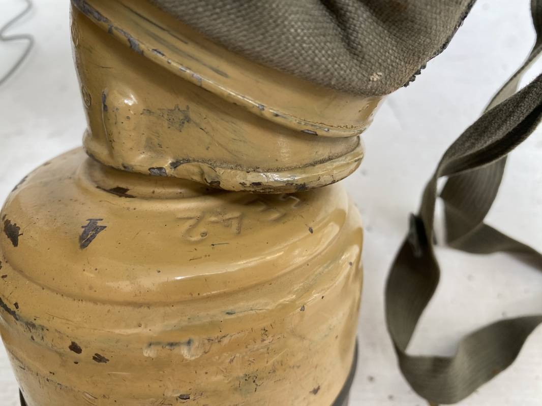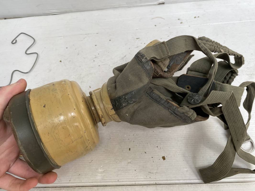 Très beau masque de protection de la Wehrmacht du modèle Tropical avec sangles. Cet ensemble a été retrouvé en succession et n'a jamais été en collection. Boitier métallique modèle 1938 , 275mm de long. Peinture feldgrau recouverte d'une peinture jaune sable appliquée mains d'origine. Marquage sous couvercle daté 1940. Nominette papier' Fu. Klessius'. Verres de rechange dans le voitier sous le rabat . Tirette à ressort avec lanière en toile dont l'extrémité est manquante. Masque en toile caoutchouc feldgrau complet avec ses sangles en coton. Les parties métalliques sont peintes en jaune sable. Occulaires, filtre FE 42. Ressort métallique en fond de boitier. Sangles longue et courte d'origines. Boucles et rivets en alu peints en vert. Renforts en cuir. Très bel ensemble intouché 100% nature 1940/42.Rare Ref 17888