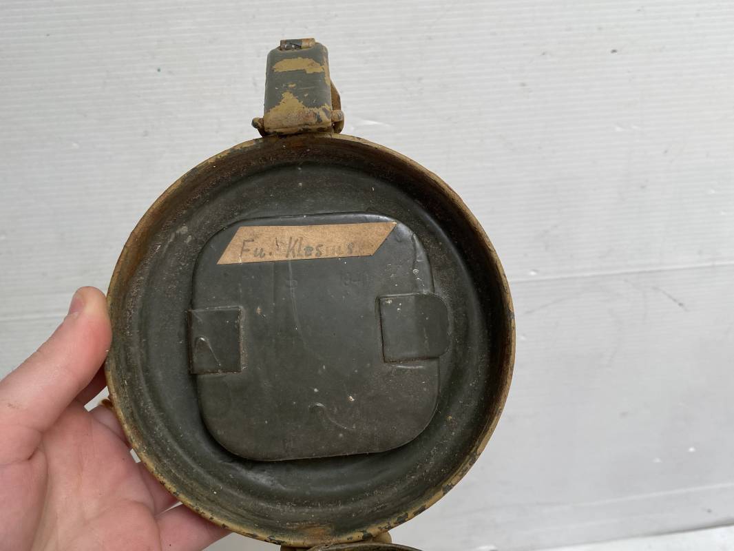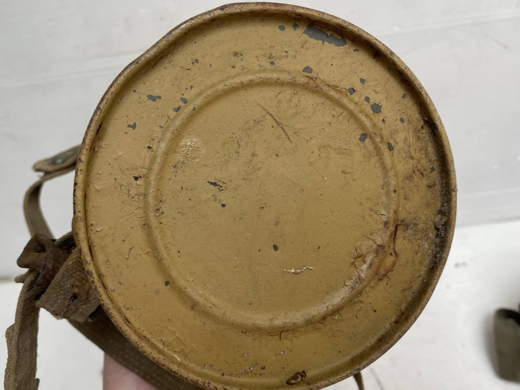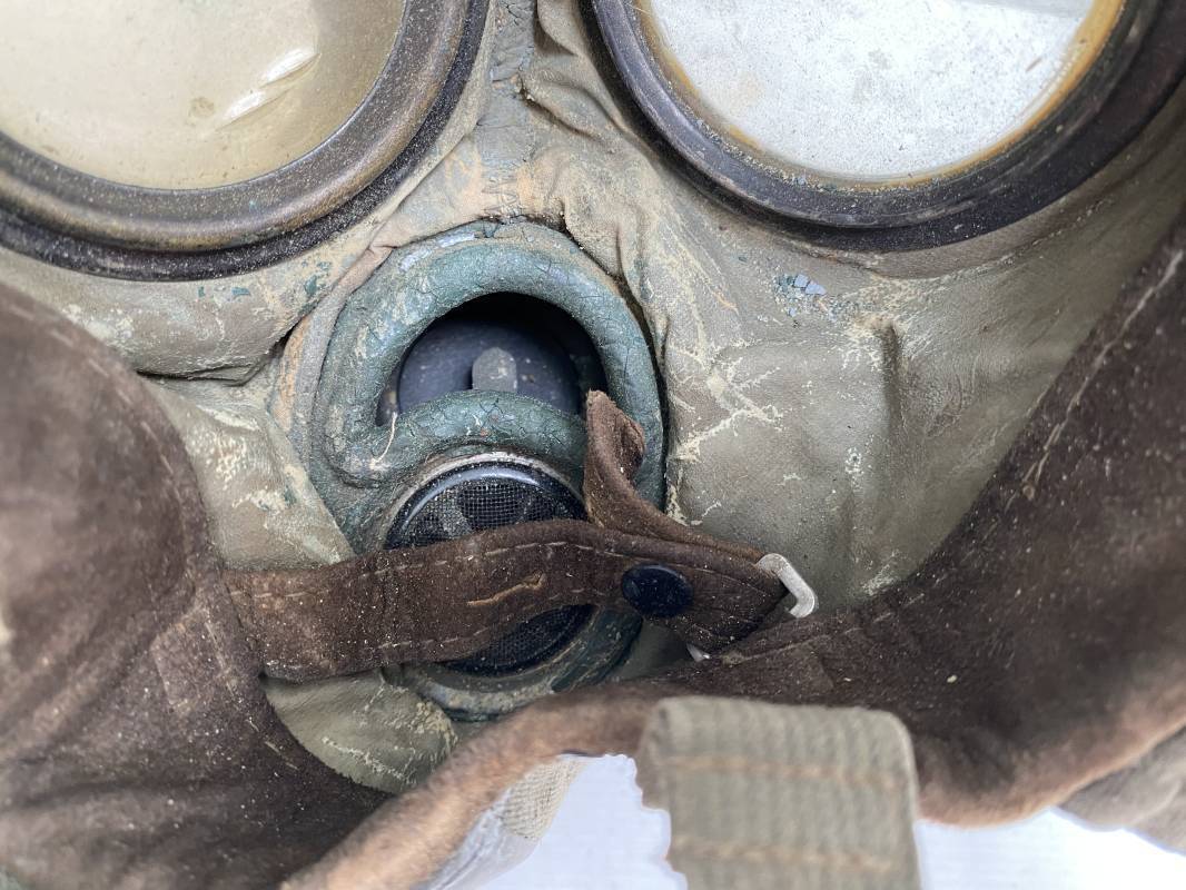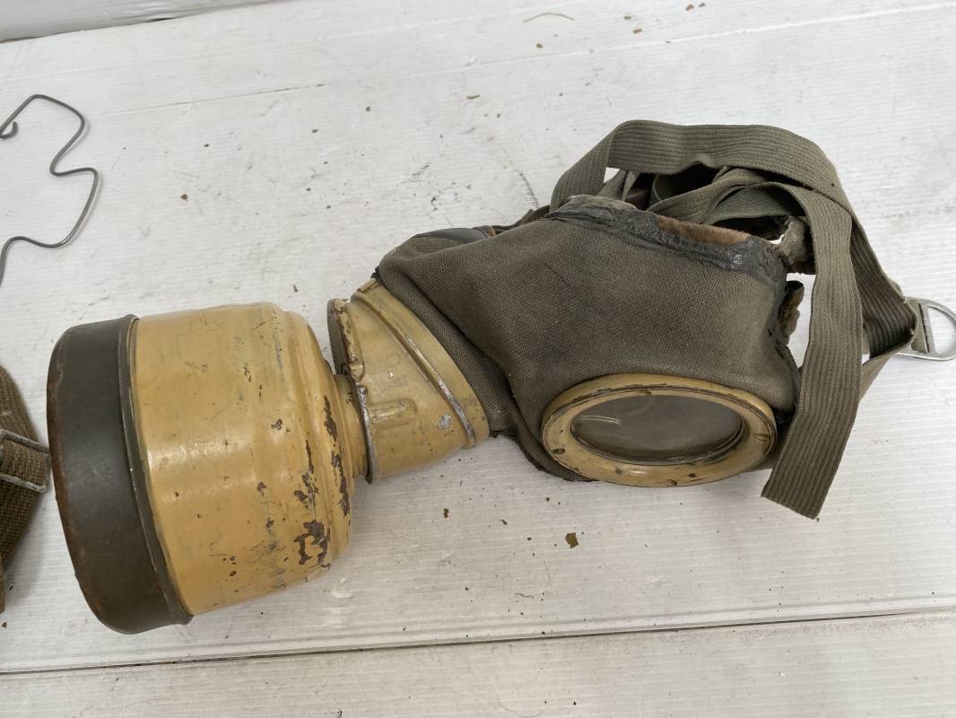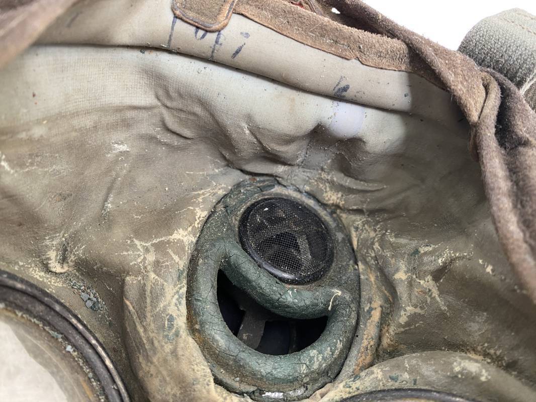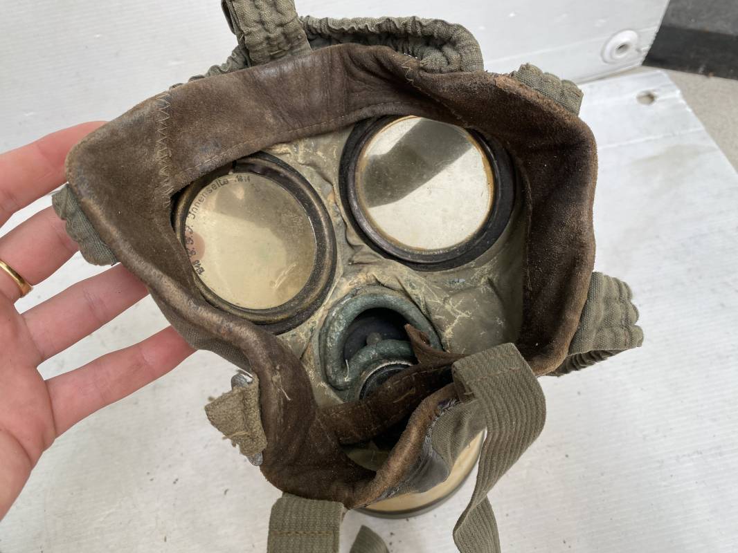 Très beau masque de protection de la Wehrmacht du modèle Tropical avec sangles. Cet ensemble a été retrouvé en succession et n'a jamais été en collection. Boitier métallique modèle 1938 , 275mm de long. Peinture feldgrau recouverte d'une peinture jaune sable appliquée mains d'origine. Marquage sous couvercle daté 1940. Nominette papier' Fu. Klessius'. Verres de rechange dans le voitier sous le rabat . Tirette à ressort avec lanière en toile dont l'extrémité est manquante. Masque en toile caoutchouc feldgrau complet avec ses sangles en coton. Les parties métalliques sont peintes en jaune sable. Occulaires, filtre FE 42. Ressort métallique en fond de boitier. Sangles longue et courte d'origines. Boucles et rivets en alu peints en vert. Renforts en cuir. Très bel ensemble intouché 100% nature 1940/42.Rare Ref 17888