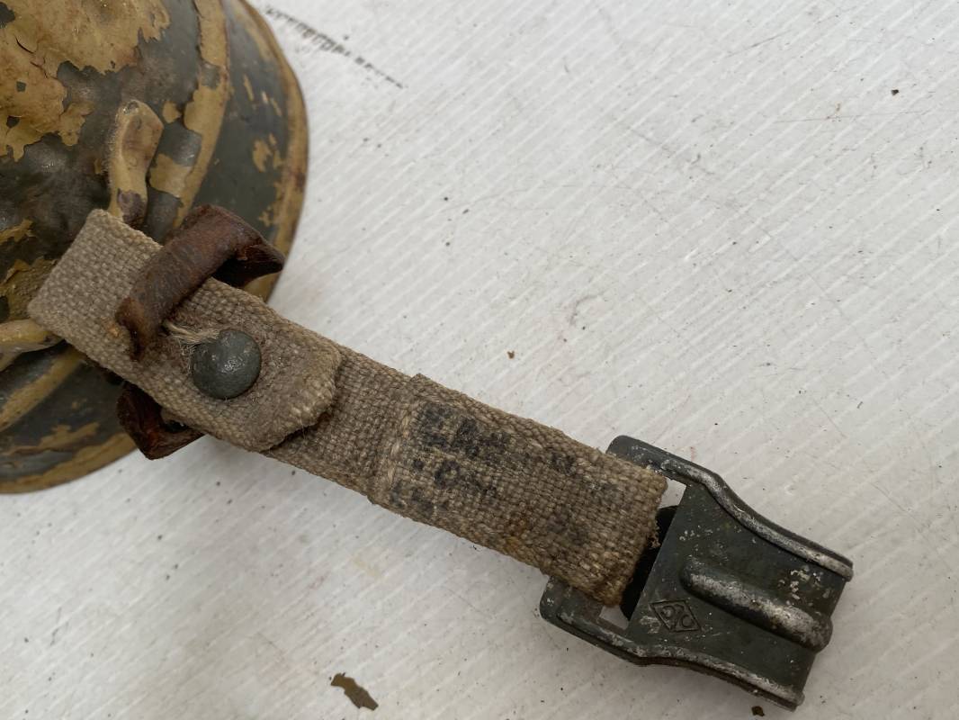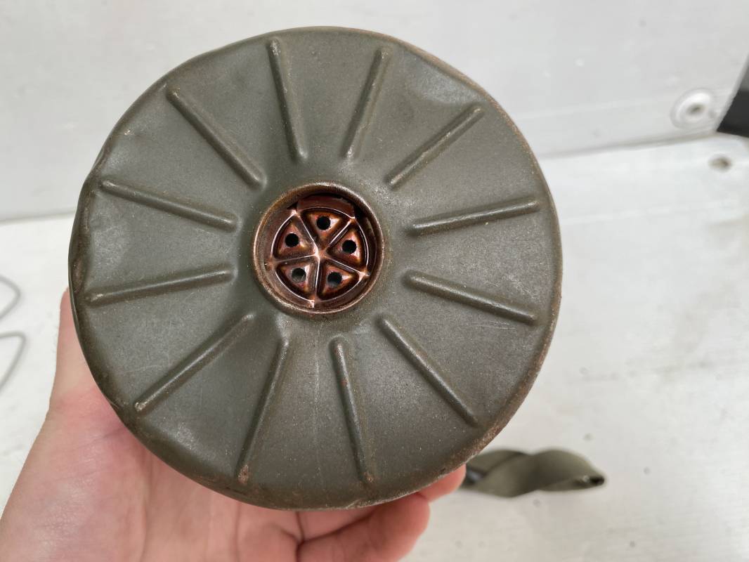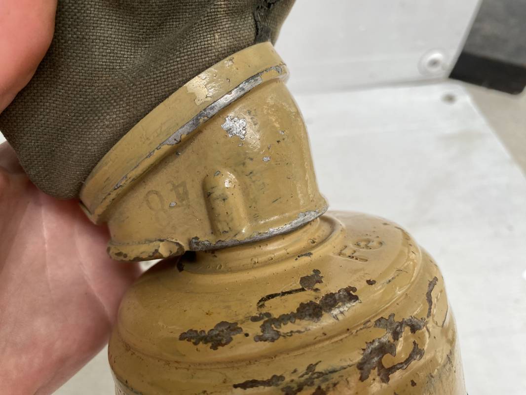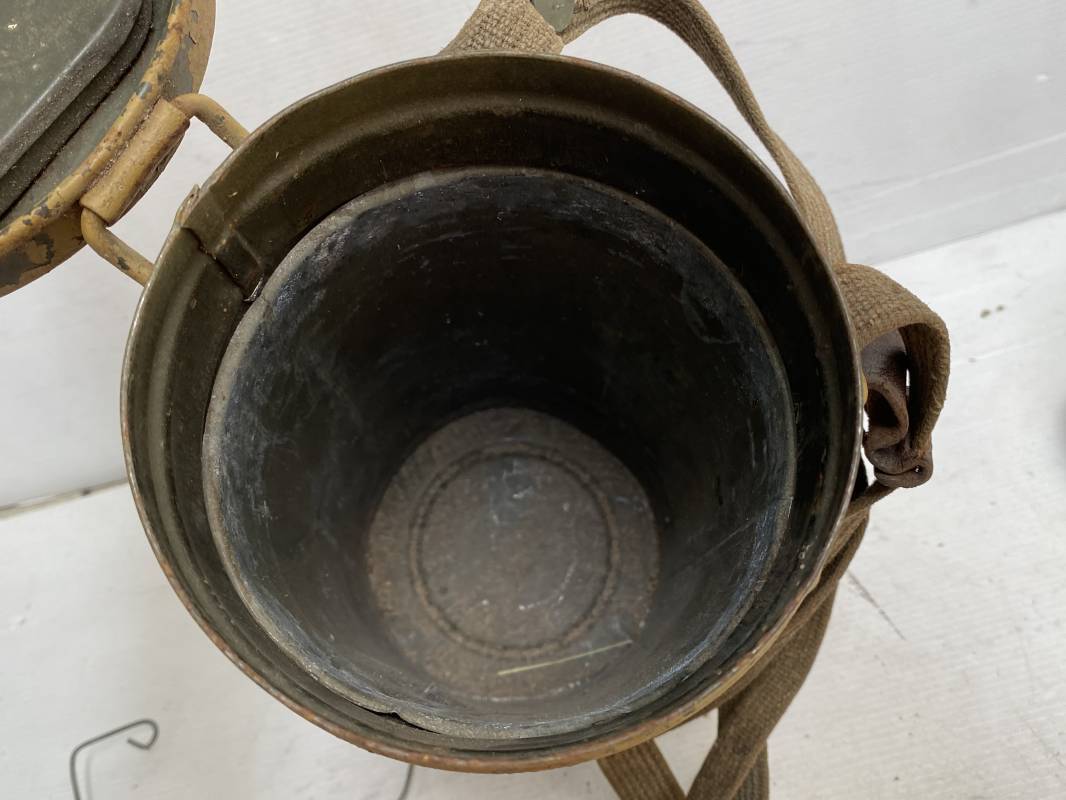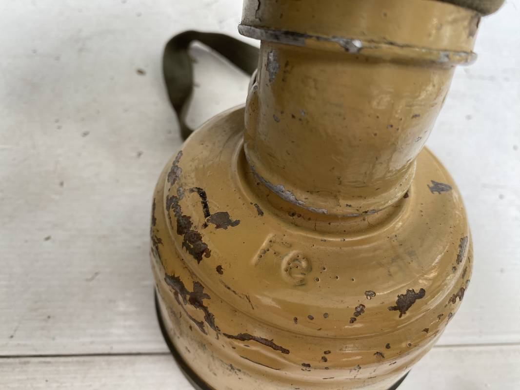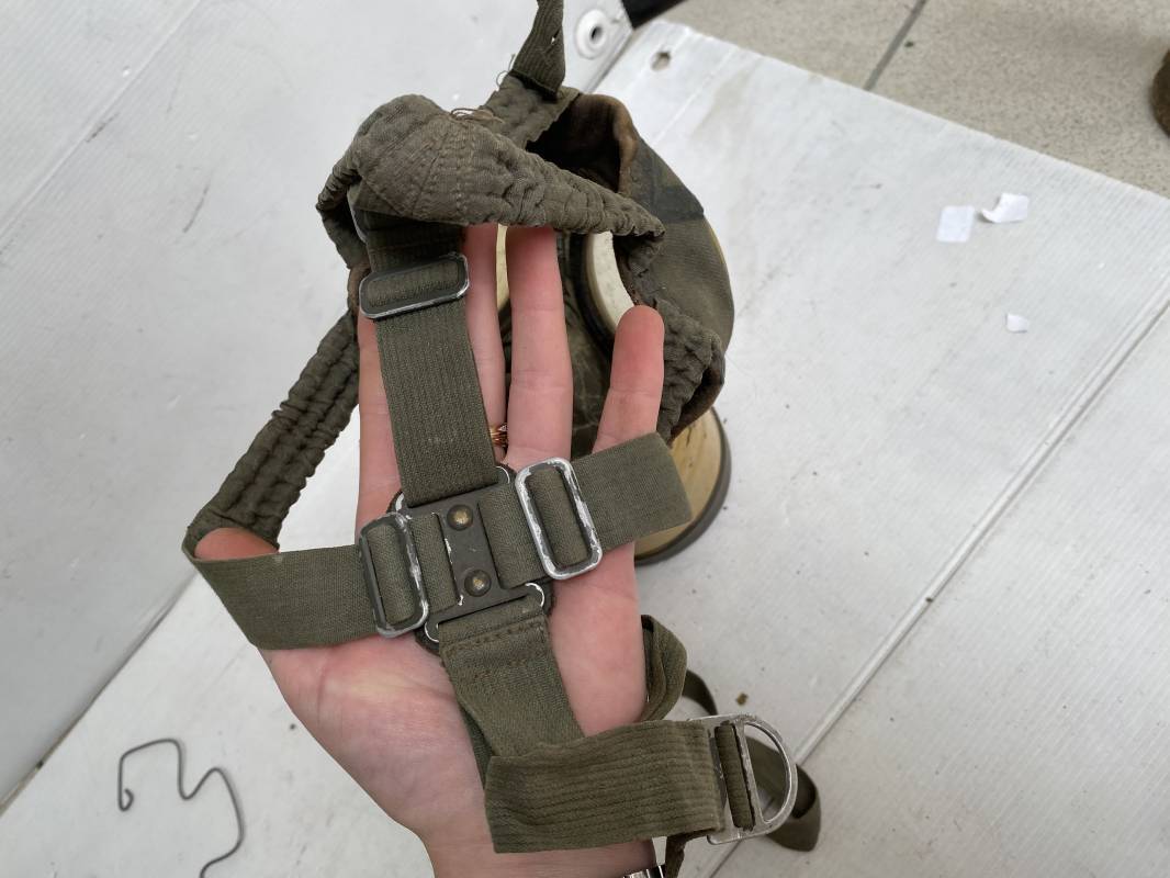 Très beau masque de protection de la Wehrmacht du modèle Tropical avec sangles. Cet ensemble a été retrouvé en succession et n'a jamais été en collection. Boitier métallique modèle 1938 , 275mm de long. Peinture feldgrau recouverte d'une peinture jaune sable appliquée mains d'origine. Marquage sous couvercle daté 1940. Nominette papier' Fu. Klessius'. Verres de rechange dans le voitier sous le rabat . Tirette à ressort avec lanière en toile dont l'extrémité est manquante. Masque en toile caoutchouc feldgrau complet avec ses sangles en coton. Les parties métalliques sont peintes en jaune sable. Occulaires, filtre FE 42. Ressort métallique en fond de boitier. Sangles longue et courte d'origines. Boucles et rivets en alu peints en vert. Renforts en cuir. Très bel ensemble intouché 100% nature 1940/42.Rare Ref 17888