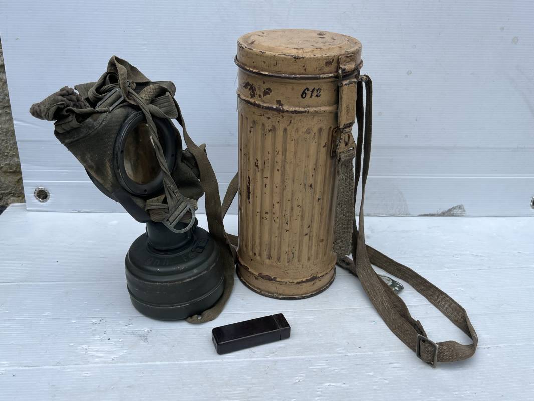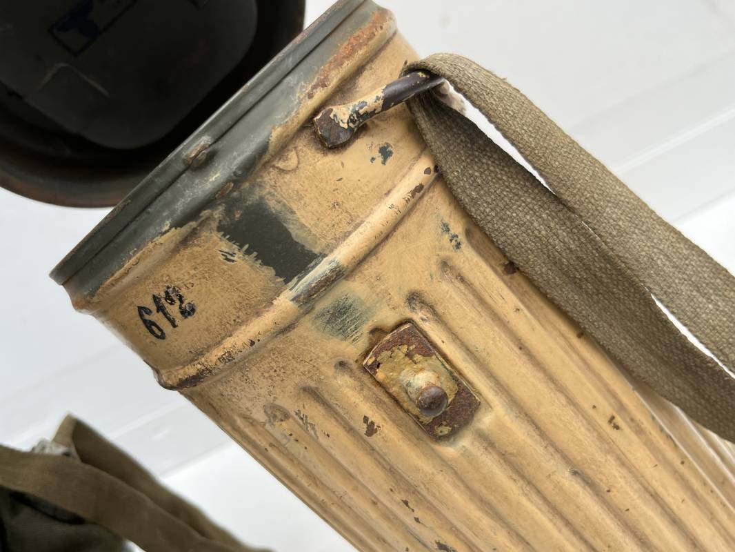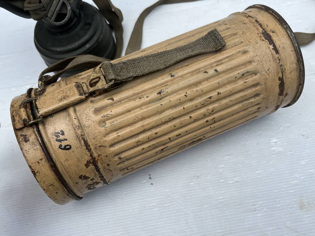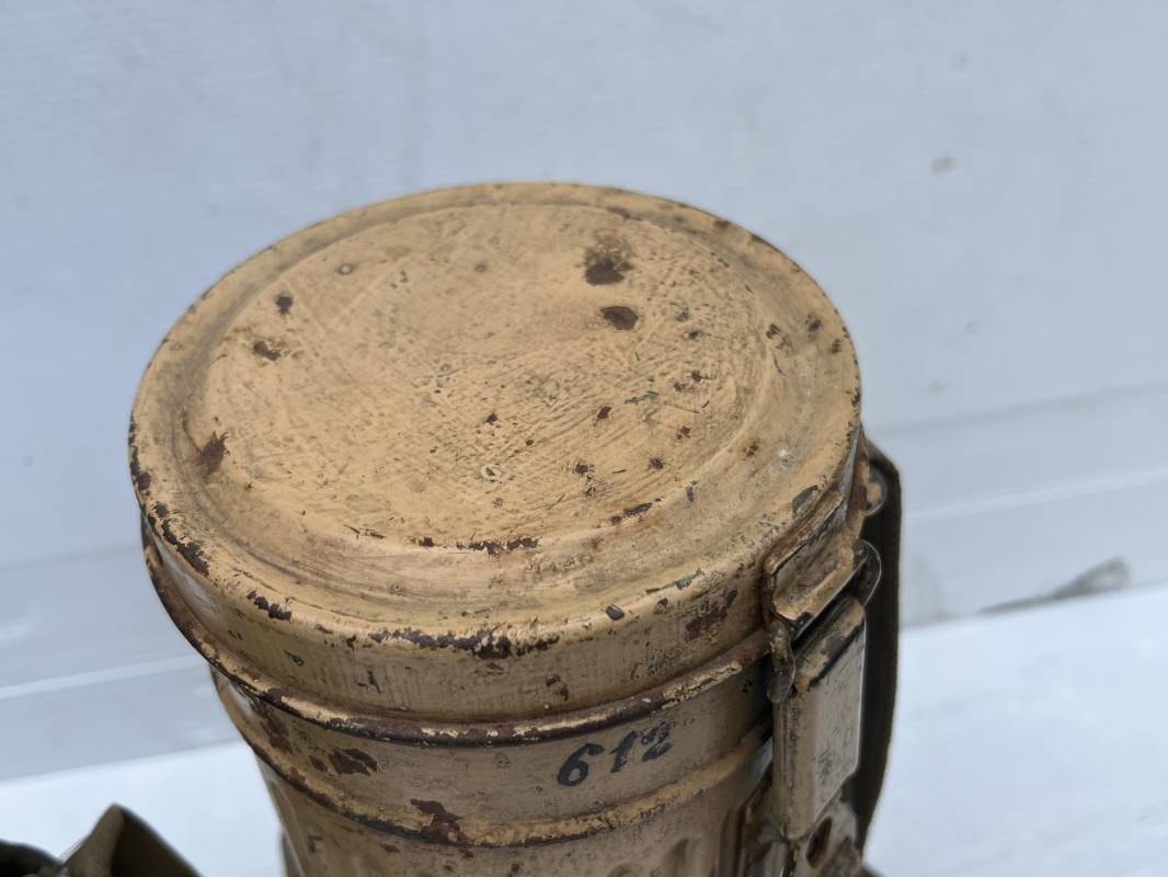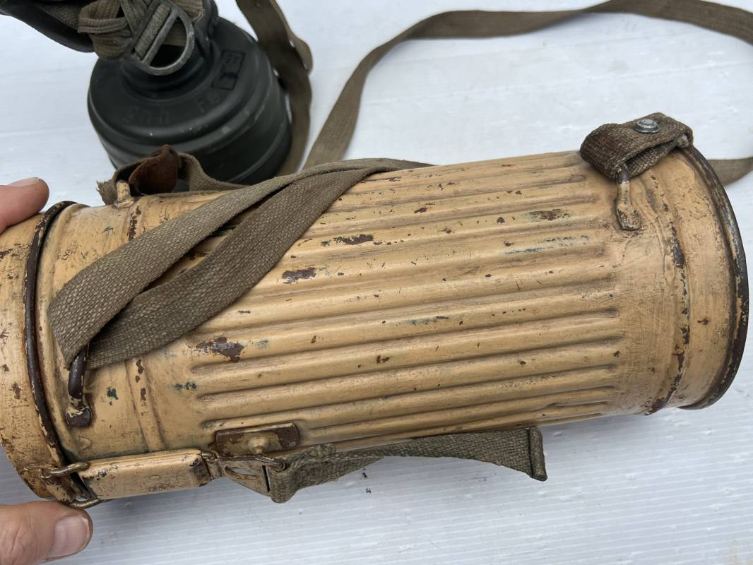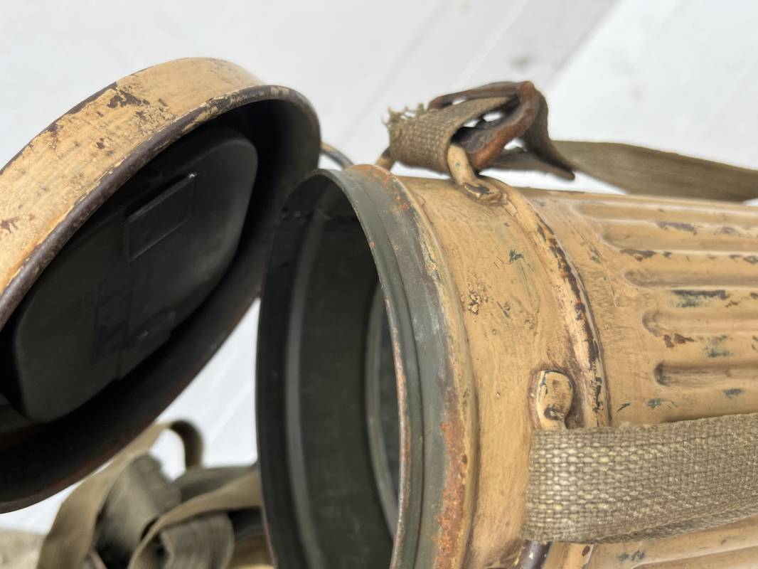 Très beau masque de protection de la Wehrmacht modéle 1938 du modèle Tropical avec sangles . Boitier métallique modèle 1938 , 275mm de long. Peinture feldgrau recouverte d'une peinture jaune sable appliquée mains d'origine. Marquage sous couvercle fabricant FFA daté 1940 . Verres de rechange dans le boitier sous le rabat . Tirette à ressort avec lanière en toile . Masque en toile caoutchoutée feldgrau complet avec ses sangles en coton.Marquage fabricant bwz . Occulaires, filtre FE 41 fabricant bwz , tampons encre noire avec aigle et code de reception . Petit rectagle en bakélite marron foncé de décontamination . Ressort métallique en fond de boitier et chiffon en laine blanche de dotation . Sangles longue et courte d'origines. Boucles et rivets en alu peints en vert. Très bel ensemble intouché 100% nature 1940/42.Rare Ref 21920