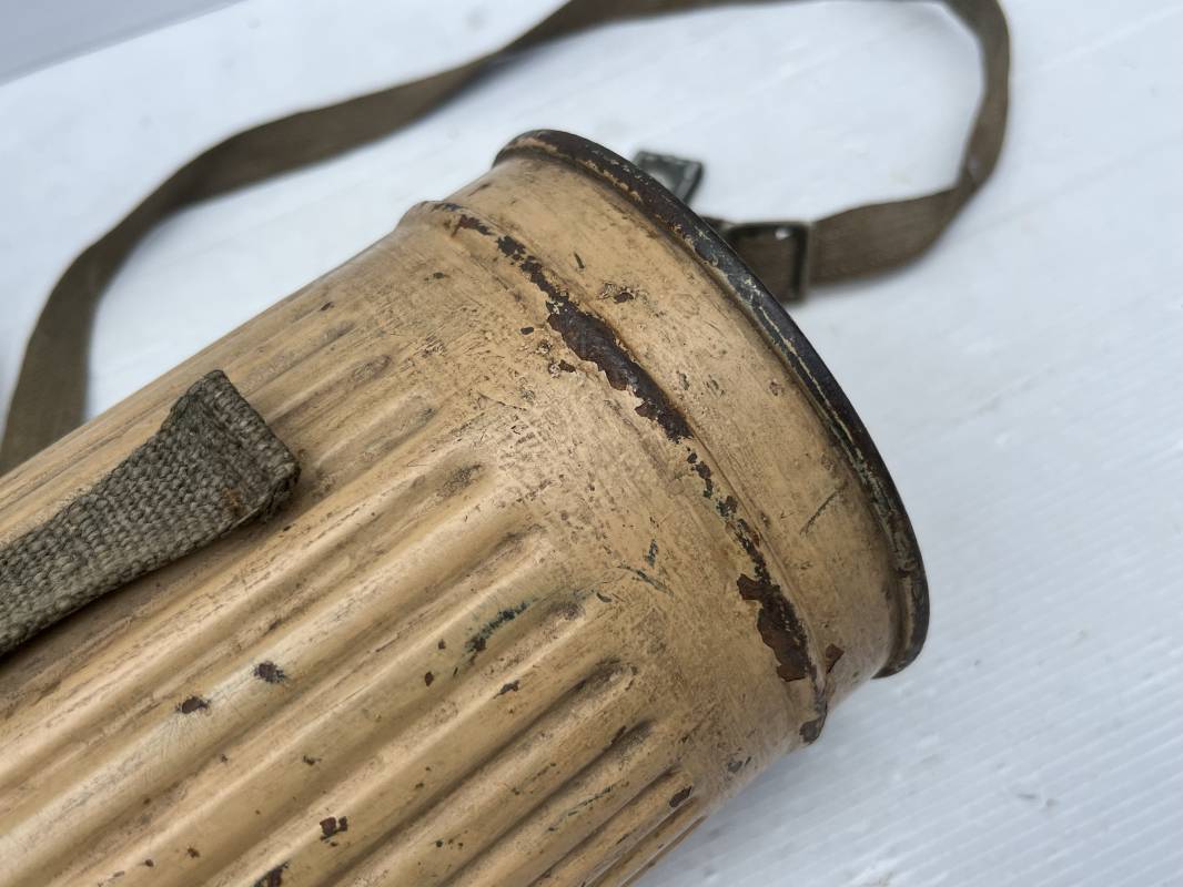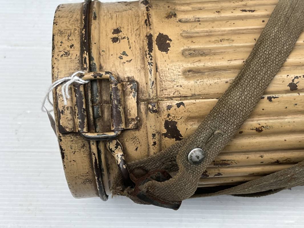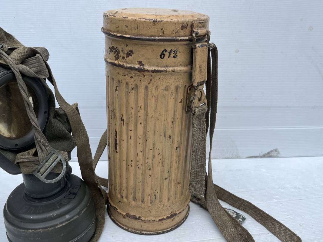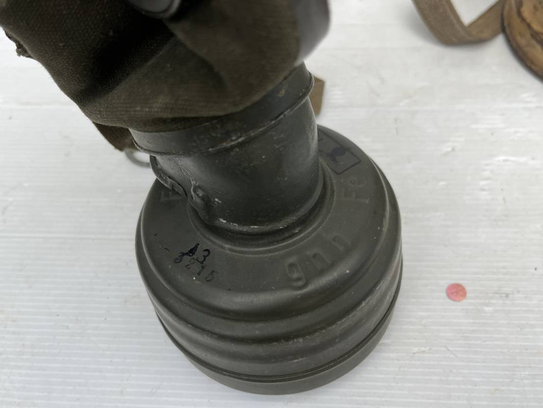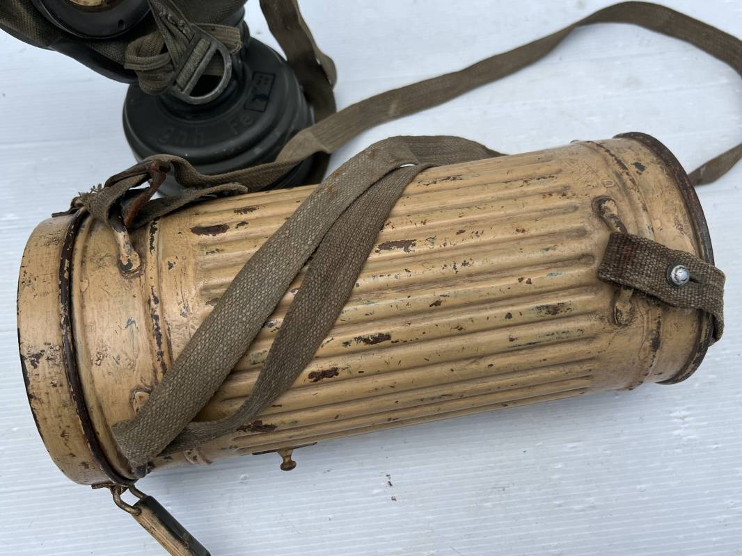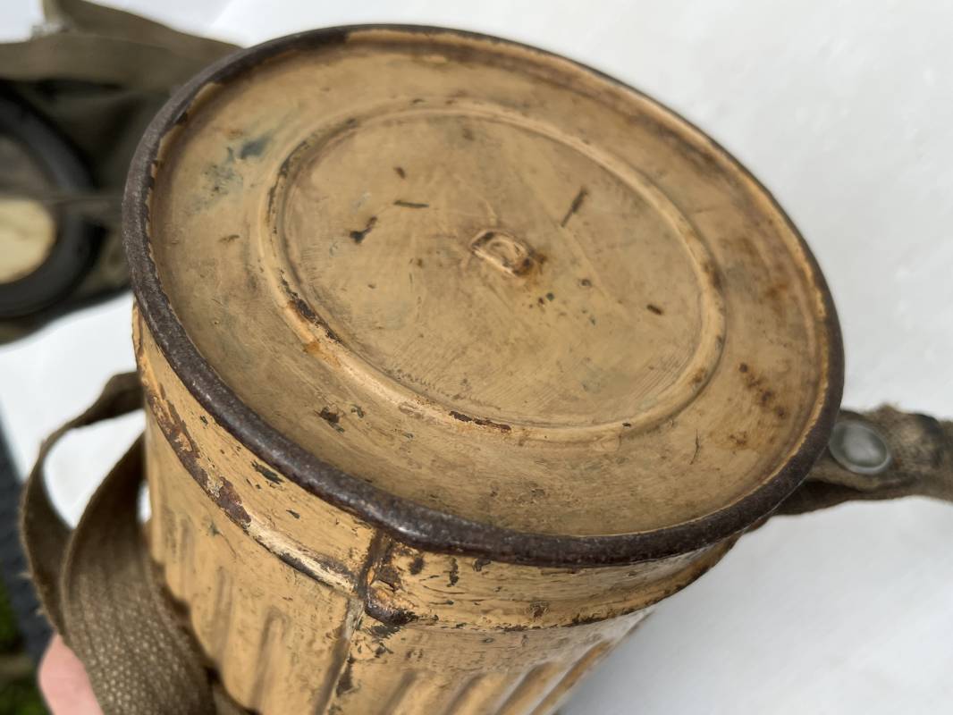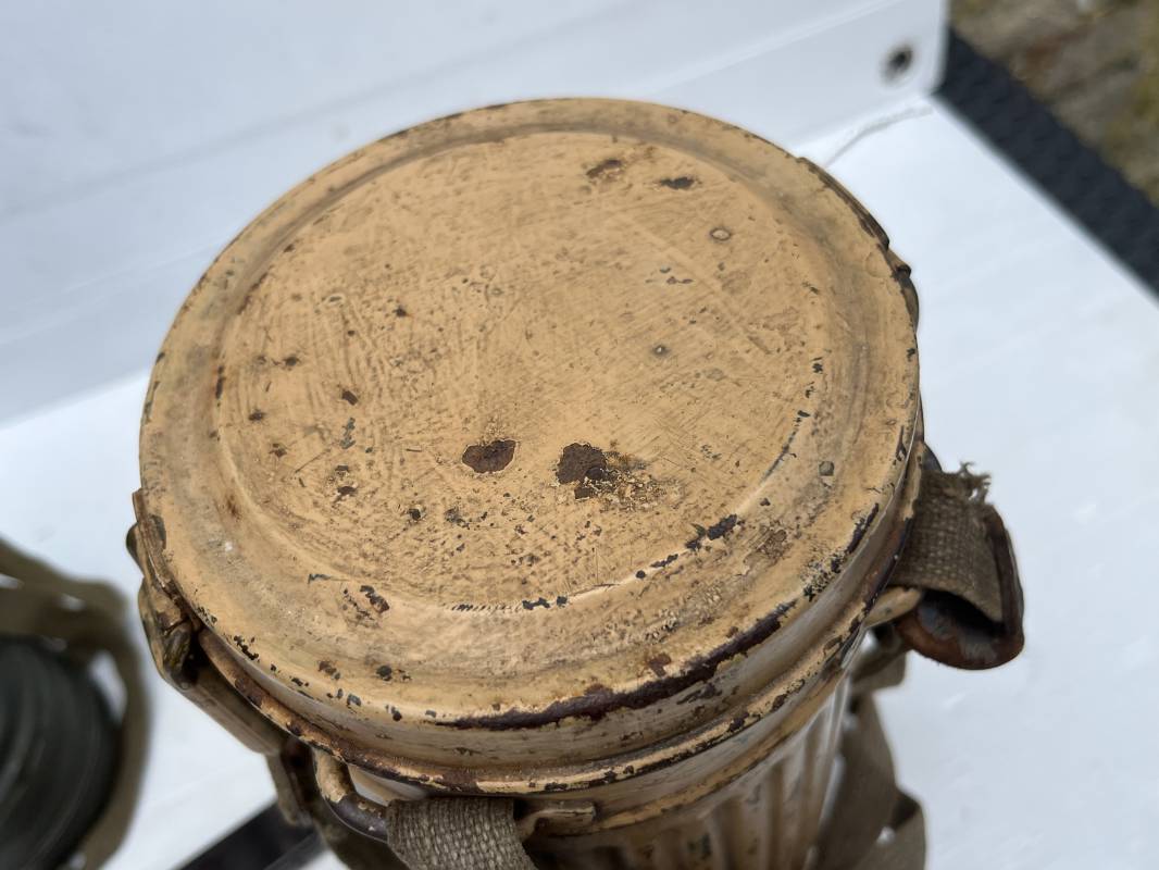 Très beau masque de protection de la Wehrmacht modéle 1938 du modèle Tropical avec sangles . Boitier métallique modèle 1938 , 275mm de long. Peinture feldgrau recouverte d'une peinture jaune sable appliquée mains d'origine. Marquage sous couvercle fabricant FFA daté 1940 . Verres de rechange dans le boitier sous le rabat . Tirette à ressort avec lanière en toile . Masque en toile caoutchoutée feldgrau complet avec ses sangles en coton.Marquage fabricant bwz . Occulaires, filtre FE 41 fabricant bwz , tampons encre noire avec aigle et code de reception . Petit rectagle en bakélite marron foncé de décontamination . Ressort métallique en fond de boitier et chiffon en laine blanche de dotation . Sangles longue et courte d'origines. Boucles et rivets en alu peints en vert. Très bel ensemble intouché 100% nature 1940/42.Rare Ref 21920