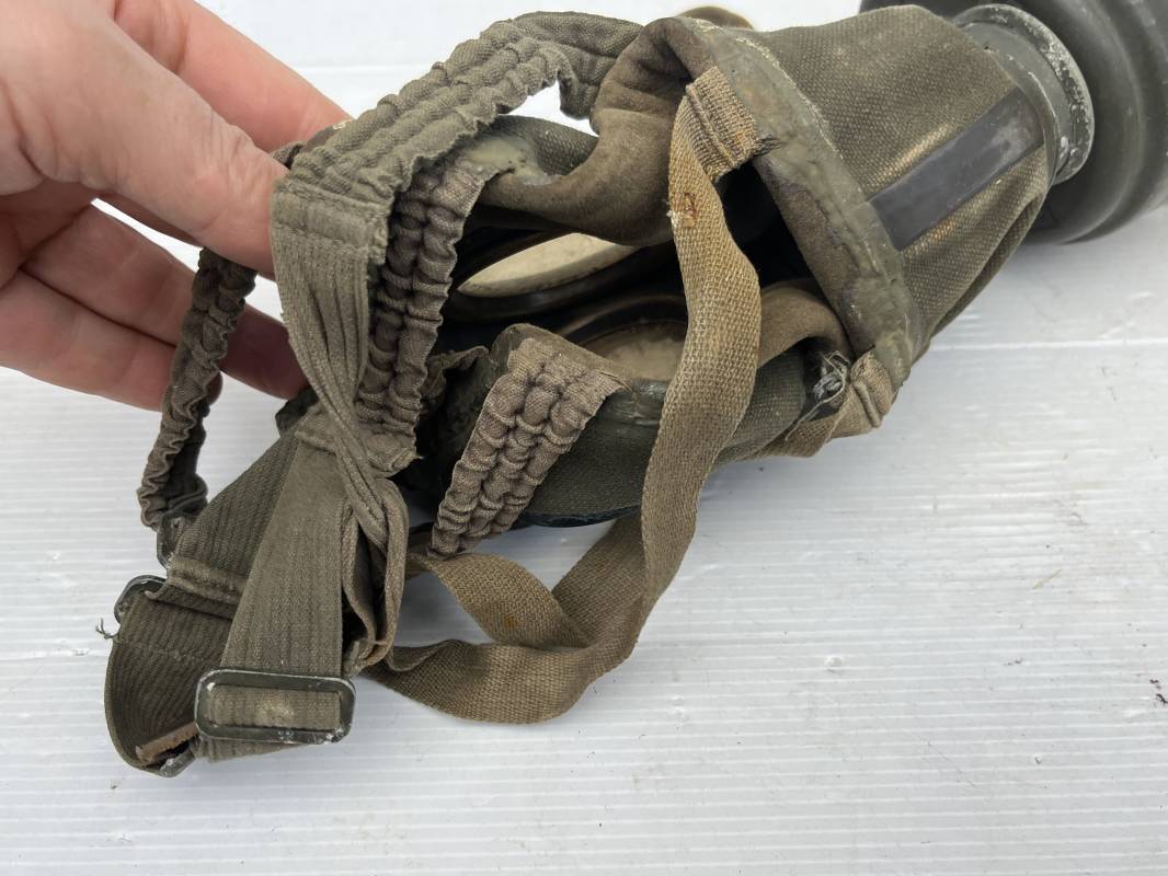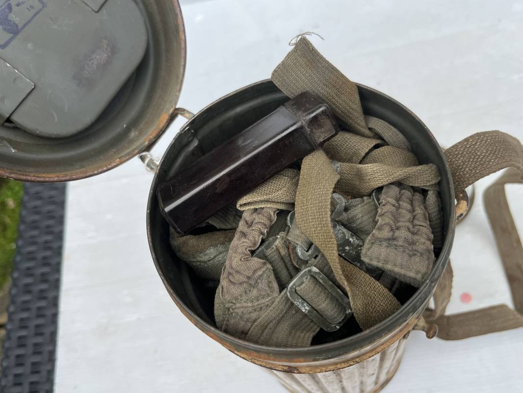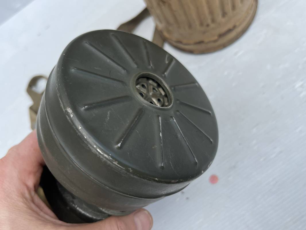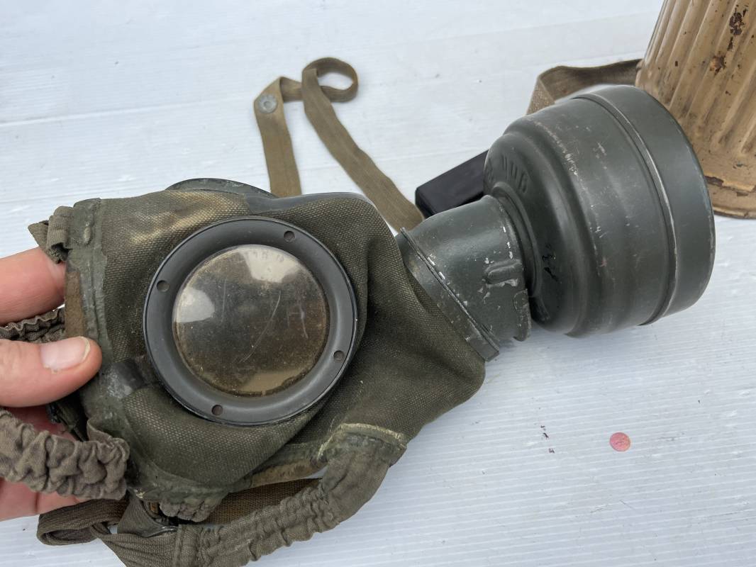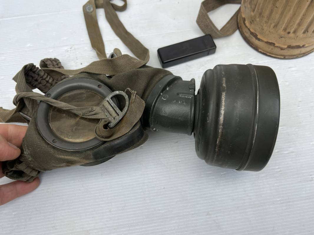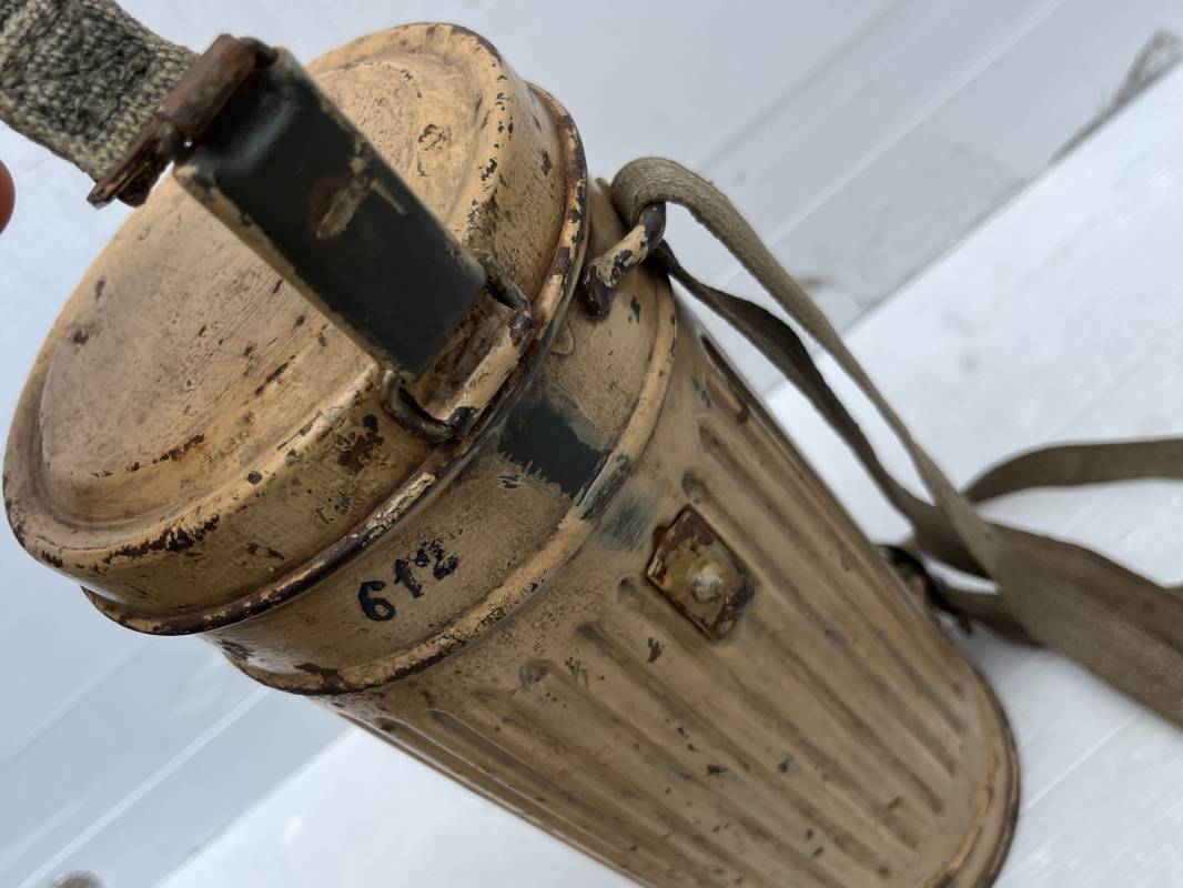 Très beau masque de protection de la Wehrmacht modéle 1938 du modèle Tropical avec sangles . Boitier métallique modèle 1938 , 275mm de long. Peinture feldgrau recouverte d'une peinture jaune sable appliquée mains d'origine. Marquage sous couvercle fabricant FFA daté 1940 . Verres de rechange dans le boitier sous le rabat . Tirette à ressort avec lanière en toile . Masque en toile caoutchoutée feldgrau complet avec ses sangles en coton.Marquage fabricant bwz . Occulaires, filtre FE 41 fabricant bwz , tampons encre noire avec aigle et code de reception . Petit rectagle en bakélite marron foncé de décontamination . Ressort métallique en fond de boitier et chiffon en laine blanche de dotation . Sangles longue et courte d'origines. Boucles et rivets en alu peints en vert. Très bel ensemble intouché 100% nature 1940/42.Rare Ref 21920