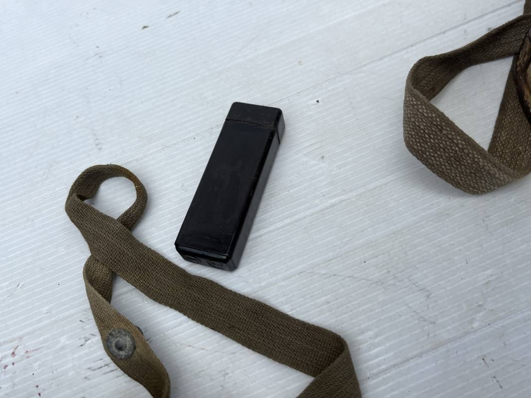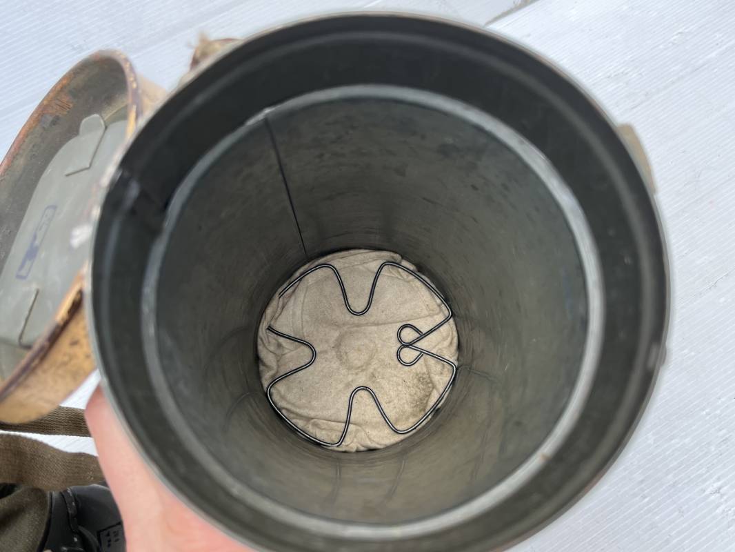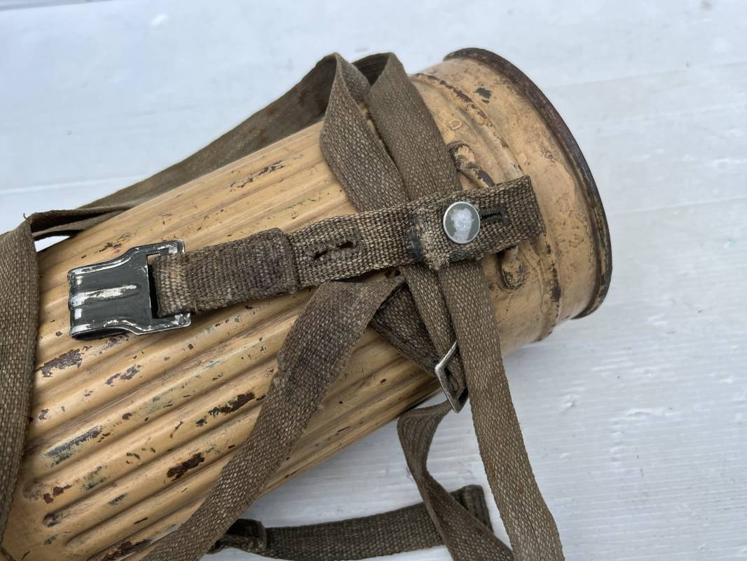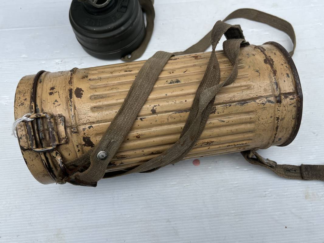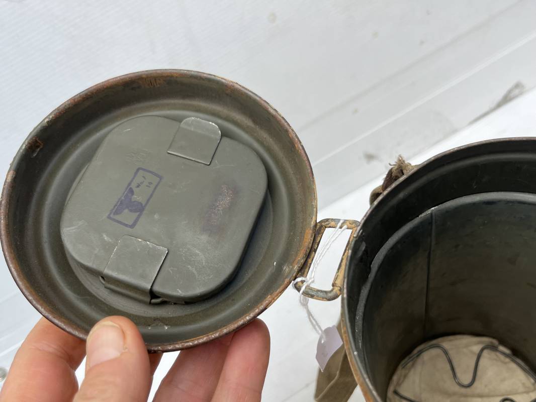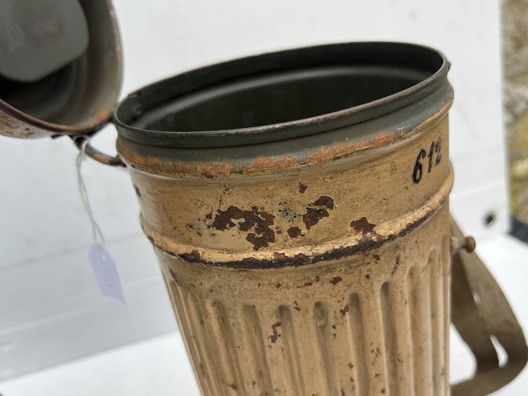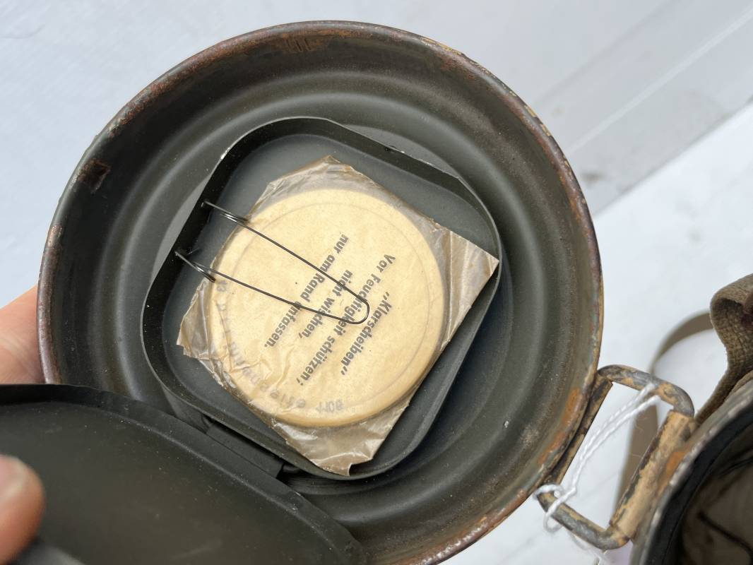 Très beau masque de protection de la Wehrmacht modéle 1938 du modèle Tropical avec sangles . Boitier métallique modèle 1938 , 275mm de long. Peinture feldgrau recouverte d'une peinture jaune sable appliquée mains d'origine. Marquage sous couvercle fabricant FFA daté 1940 . Verres de rechange dans le boitier sous le rabat . Tirette à ressort avec lanière en toile . Masque en toile caoutchoutée feldgrau complet avec ses sangles en coton.Marquage fabricant bwz . Occulaires, filtre FE 41 fabricant bwz , tampons encre noire avec aigle et code de reception . Petit rectagle en bakélite marron foncé de décontamination . Ressort métallique en fond de boitier et chiffon en laine blanche de dotation . Sangles longue et courte d'origines. Boucles et rivets en alu peints en vert. Très bel ensemble intouché 100% nature 1940/42.Rare Ref 21920