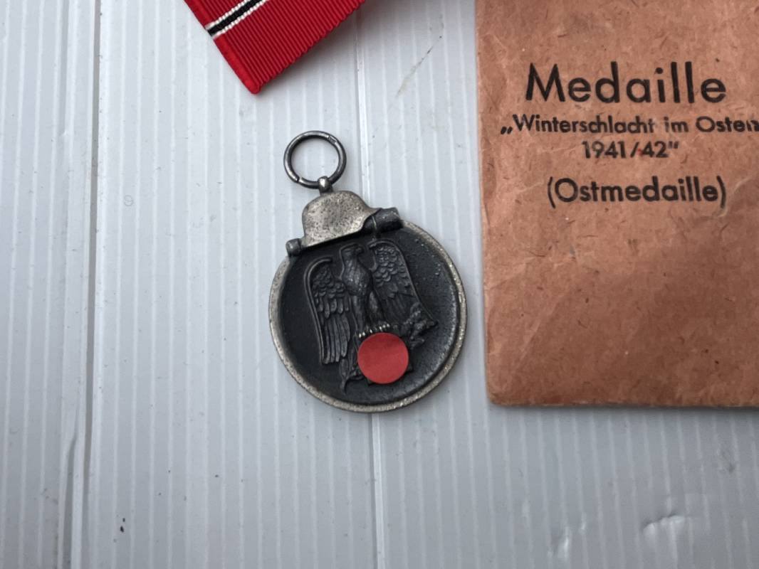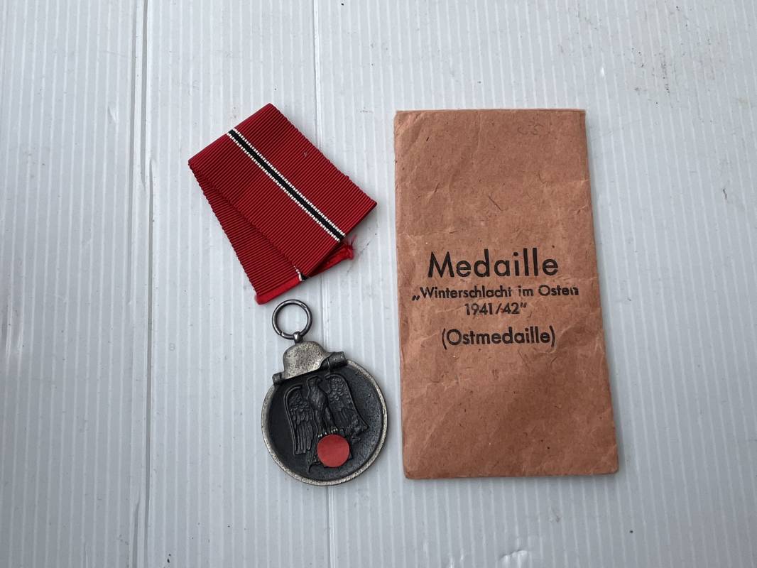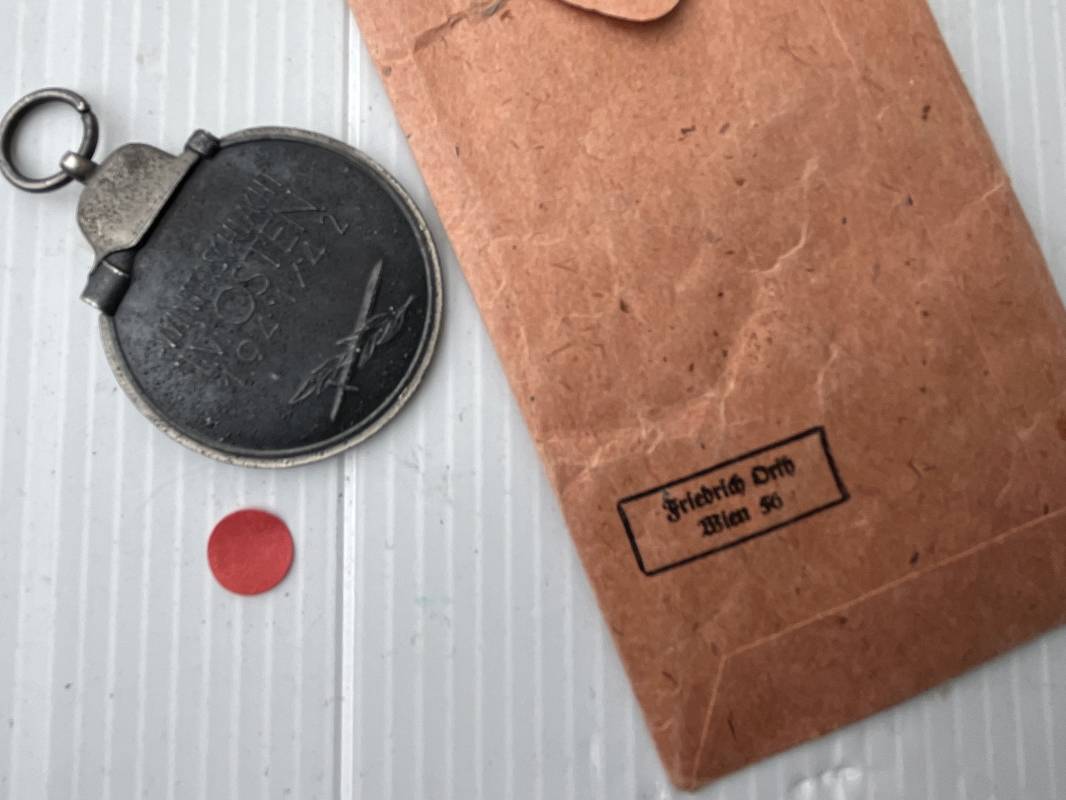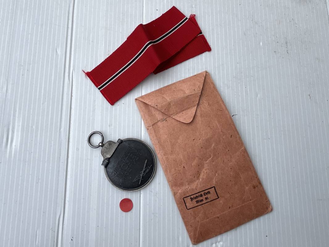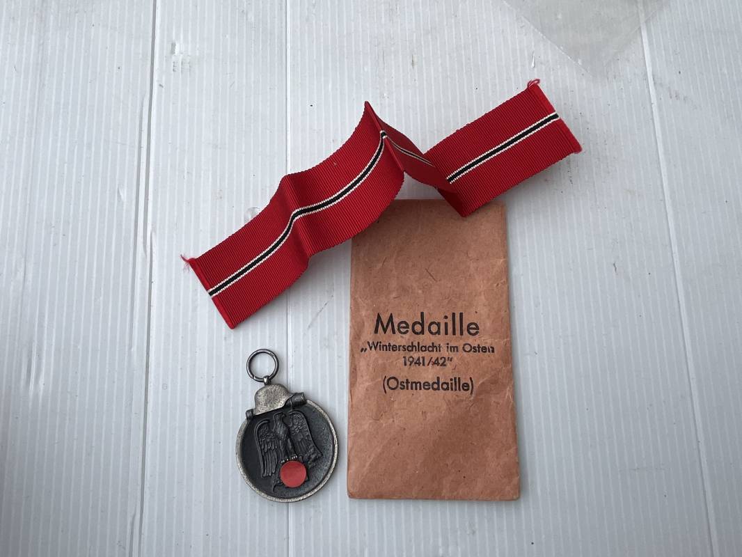 Médaille de l'Est Hiver 1941/42 avec son sachet papier . Medaille en zinc double faces . Hiver 41/42 , anneau , ruban d'origine . Sachet en papier d'origine avec marquage fabricant Friedrich Orth Wien 56 . Bel ensemble 100 % intouché trouvé en Allemagne Ref 20041