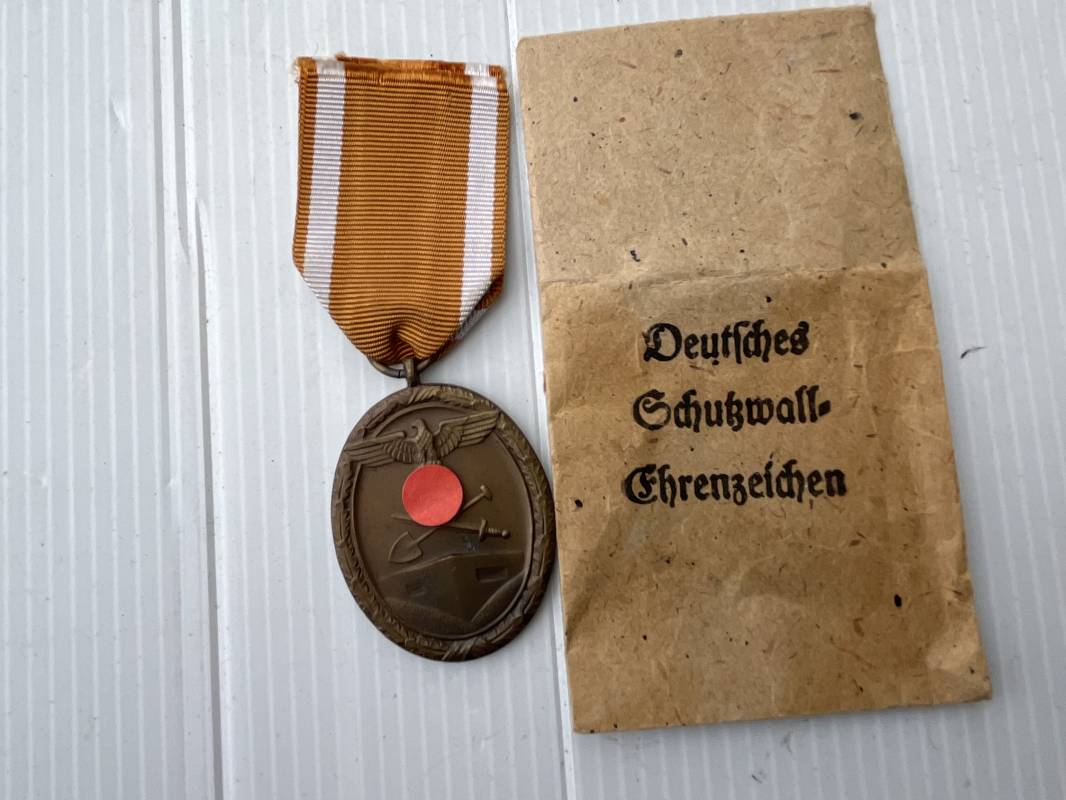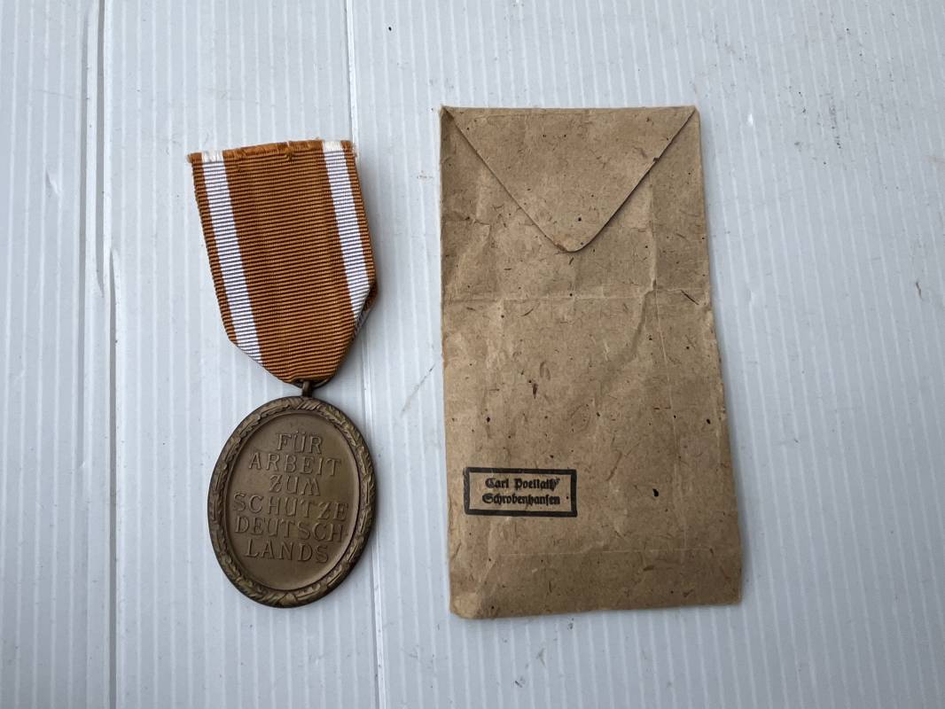 Trés belle médaille des fortifications ( Deutsches Schutzewall Ehrenzeichen )et son sachet papier . Médaille bronze double faces . Anneau et ruban d'origine . Sachet d'origine en papier , marquage fabricant Carl Poetlath . Eta quasi neuf Ref 17810
