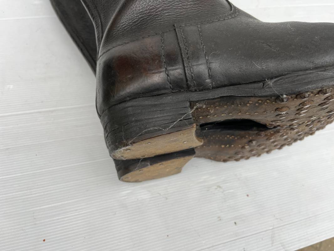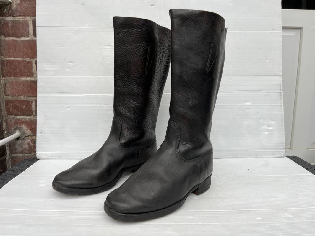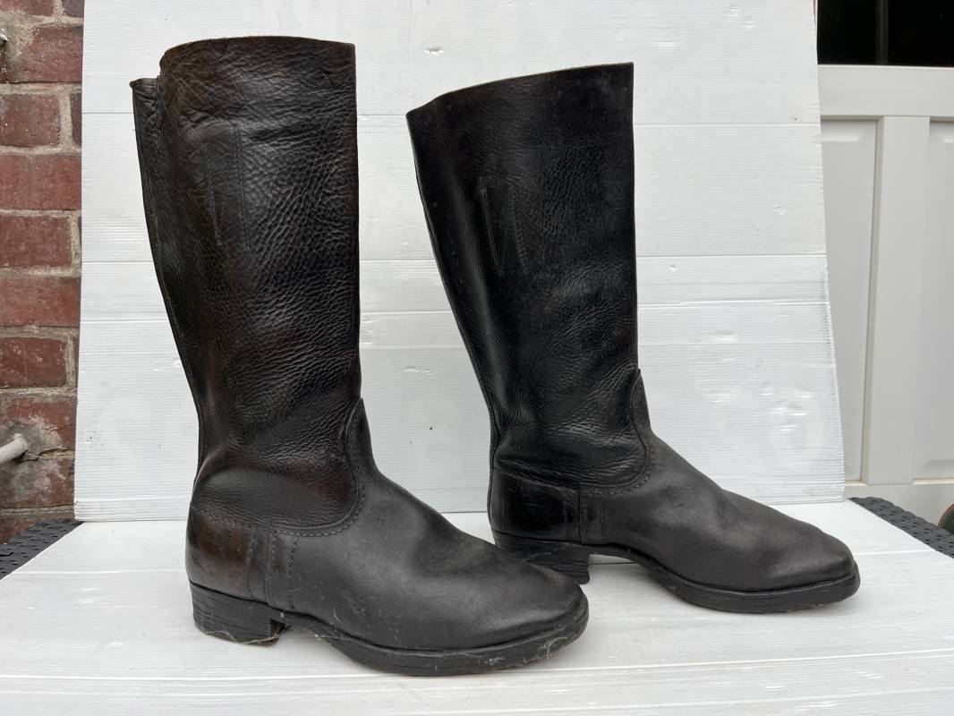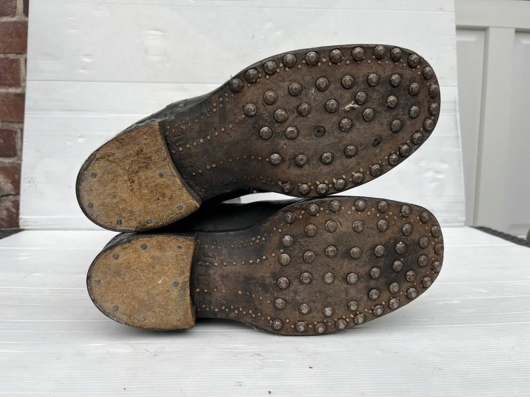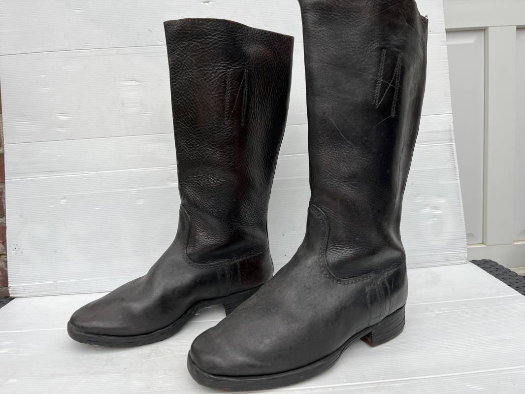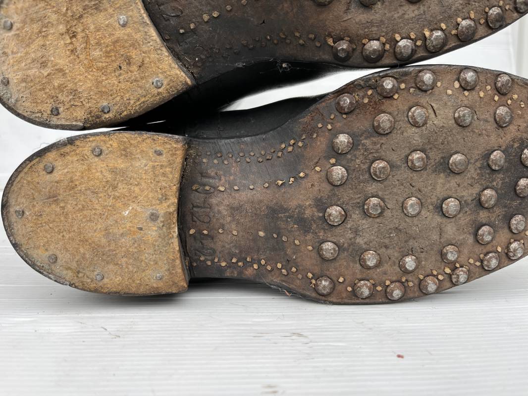 Paire de bottes troupe cloutées de la Wehrmacht . Cuir noir , tiges hautes ( Knobelbecher ) Hauteur bottes 39 cm . Tirettes en coton blanc intérieures . Marquages intérieurs sur chaque tiges 10 12 42 . Semelles cloutées d'origine et dans un tres bel état , chevillage bois , marquages sous semelles cuir 10 12 42 . Talons fer en U Longueur semelle 29 1/2 pointure 44 environ . Paire légèrement portée en trés bel état . Trés belle paire de bottes pour combattant de la WH 1939/45 Ref 19380