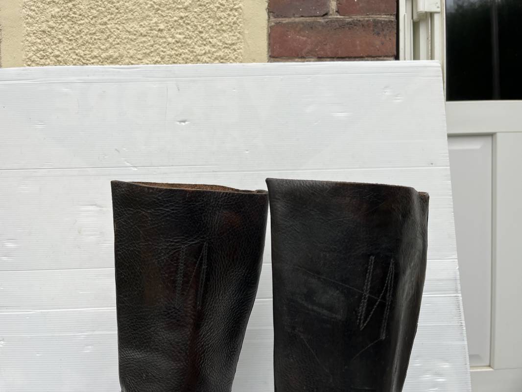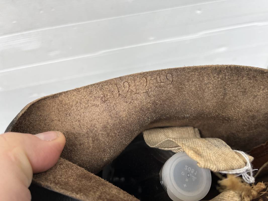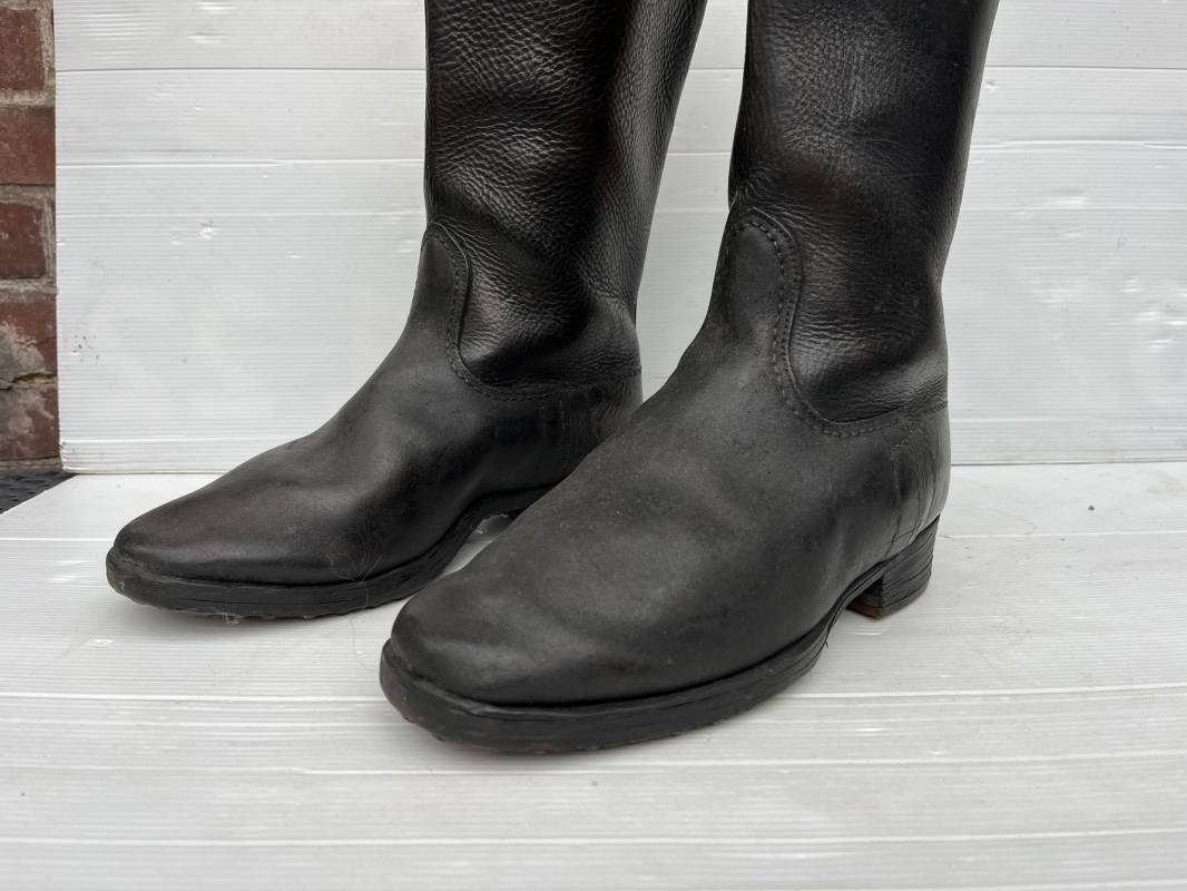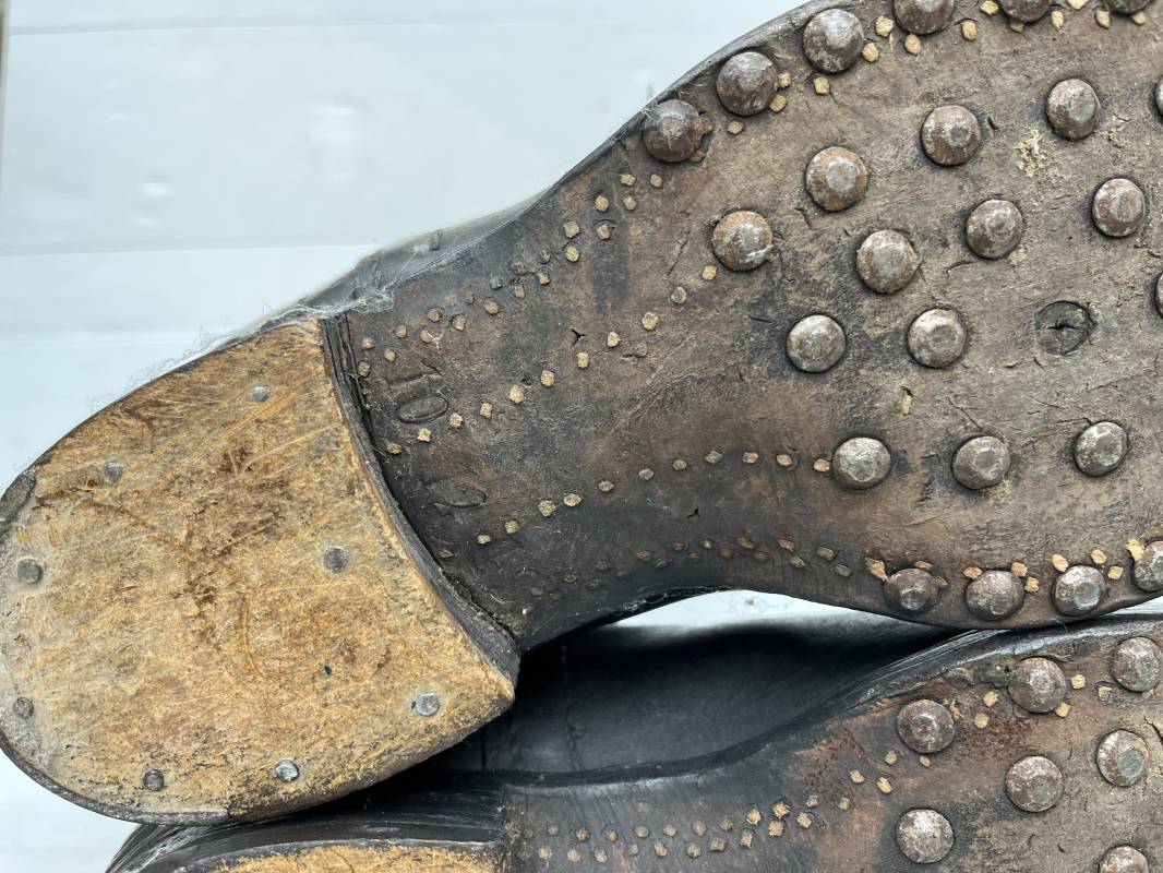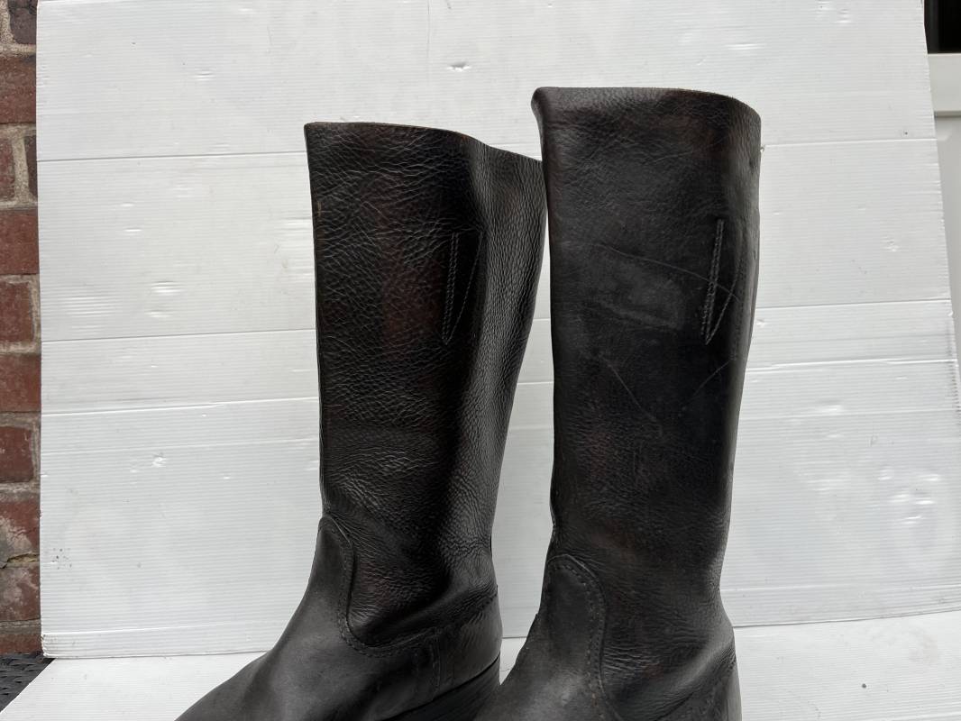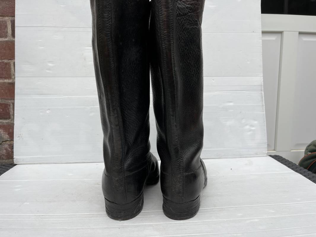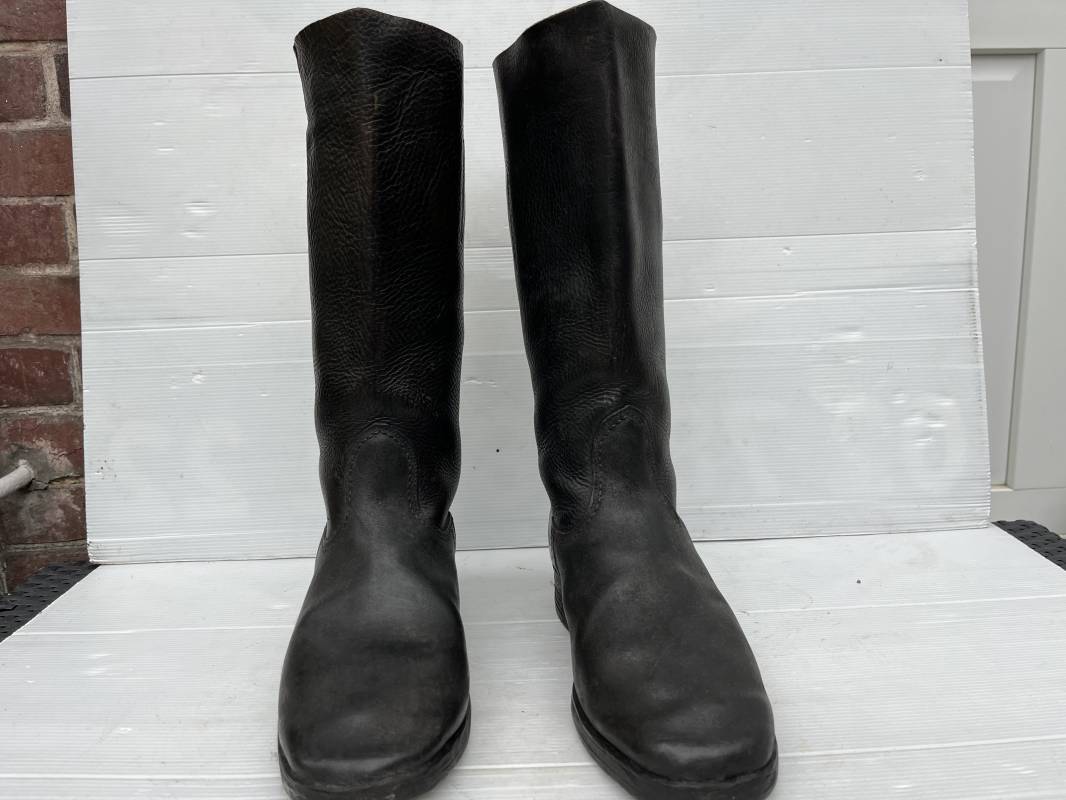 Paire de bottes troupe cloutées de la Wehrmacht . Cuir noir , tiges hautes ( Knobelbecher ) Hauteur bottes 39 cm . Tirettes en coton blanc intérieures . Marquages intérieurs sur chaque tiges 10 12 42 . Semelles cloutées d'origine et dans un tres bel état , chevillage bois , marquages sous semelles cuir 10 12 42 . Talons fer en U Longueur semelle 29 1/2 pointure 44 environ . Paire légèrement portée en trés bel état . Trés belle paire de bottes pour combattant de la WH 1939/45 Ref 19380