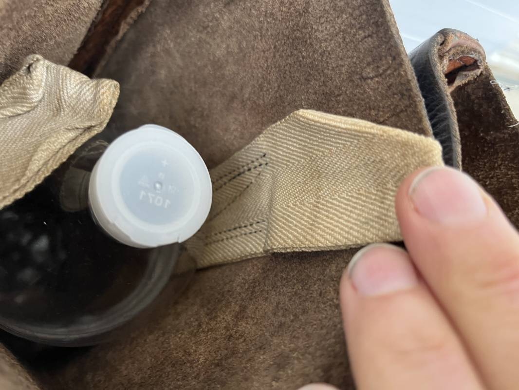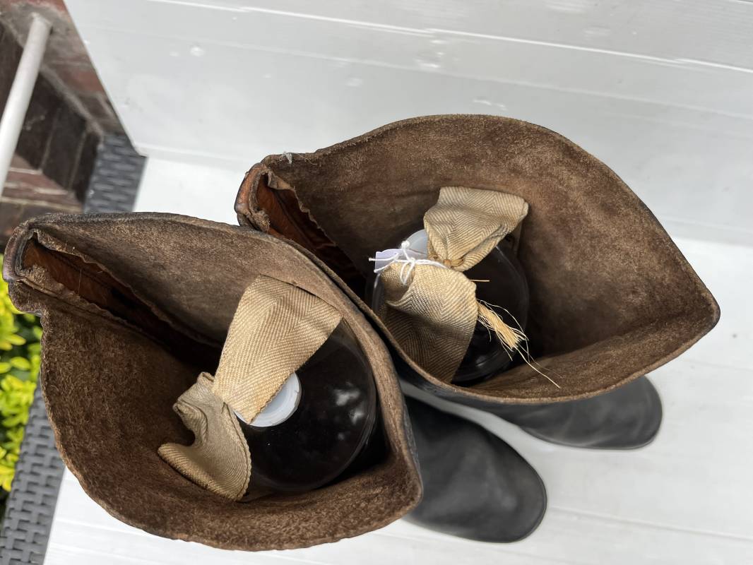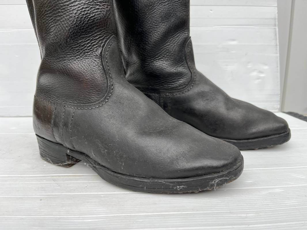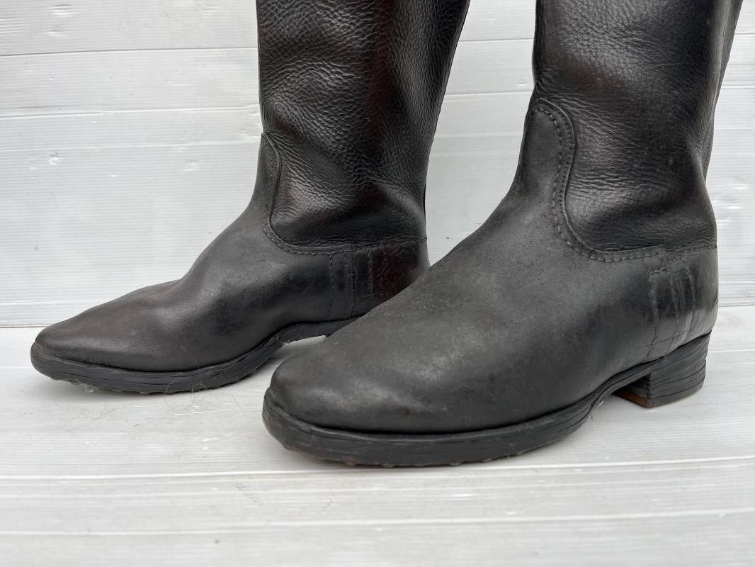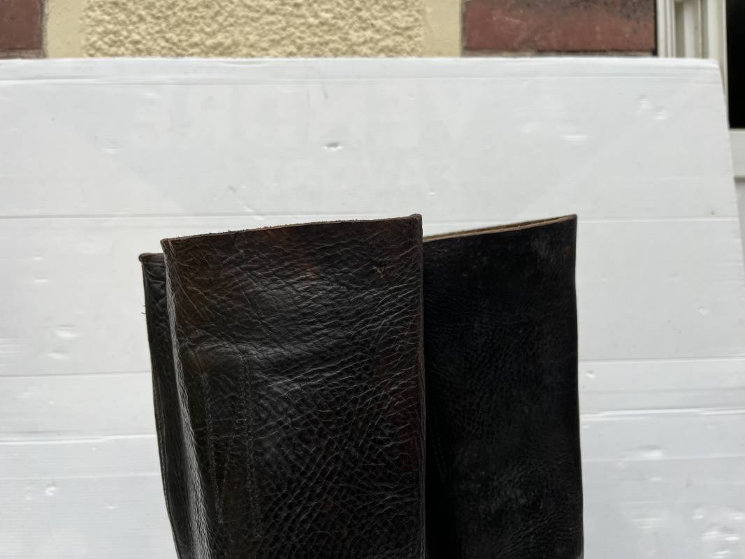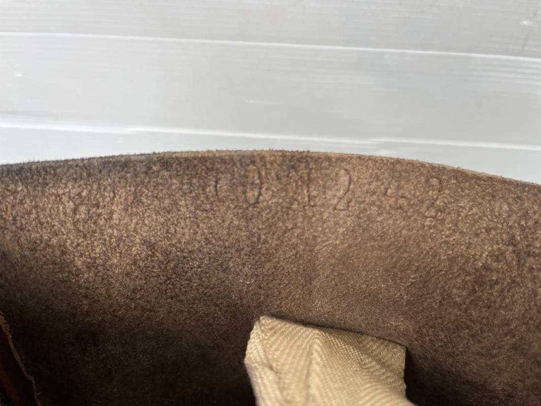 Paire de bottes troupe cloutées de la Wehrmacht . Cuir noir , tiges hautes ( Knobelbecher ) Hauteur bottes 39 cm . Tirettes en coton blanc intérieures . Marquages intérieurs sur chaque tiges 10 12 42 . Semelles cloutées d'origine et dans un tres bel état , chevillage bois , marquages sous semelles cuir 10 12 42 . Talons fer en U Longueur semelle 29 1/2 pointure 44 environ . Paire légèrement portée en trés bel état . Trés belle paire de bottes pour combattant de la WH 1939/45 Ref 19380