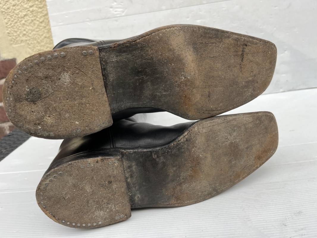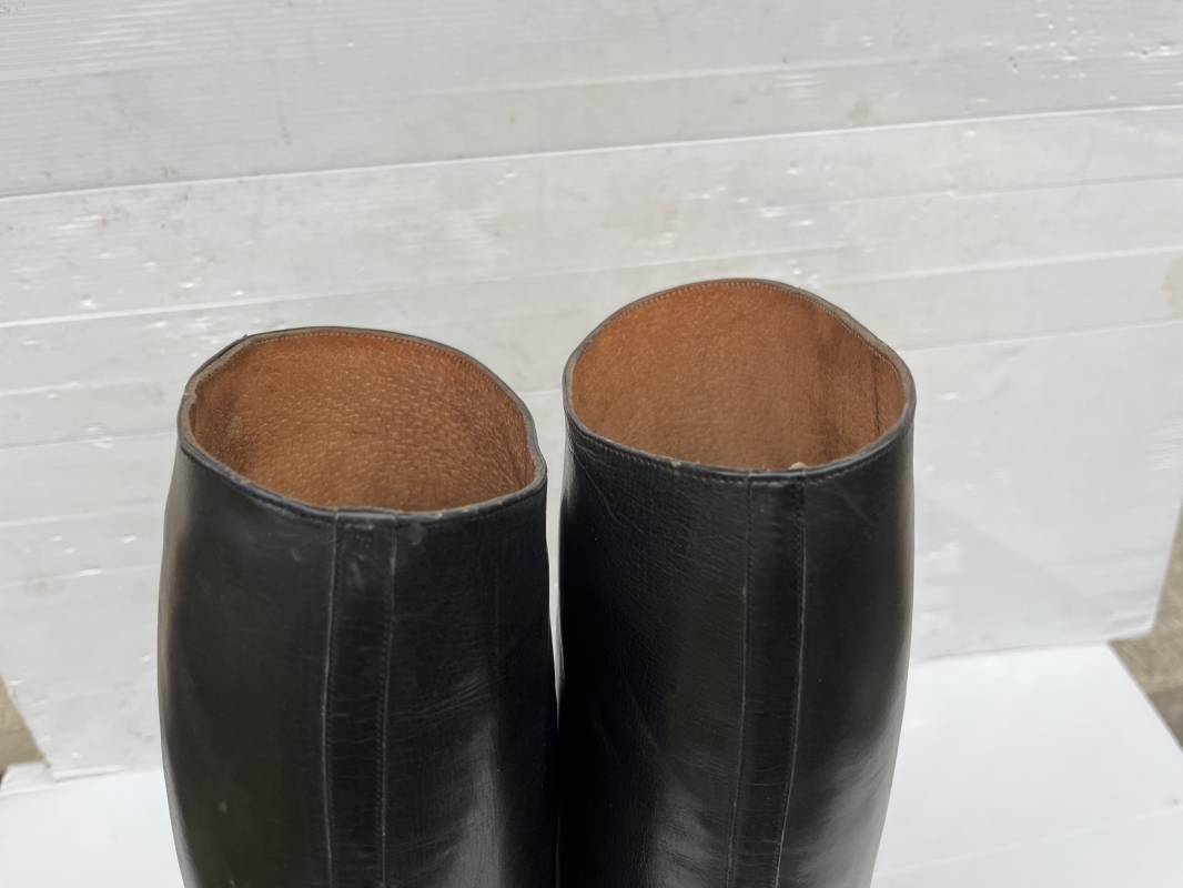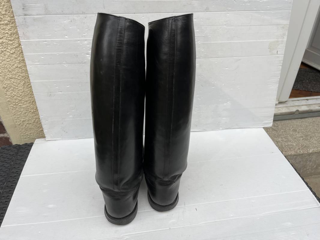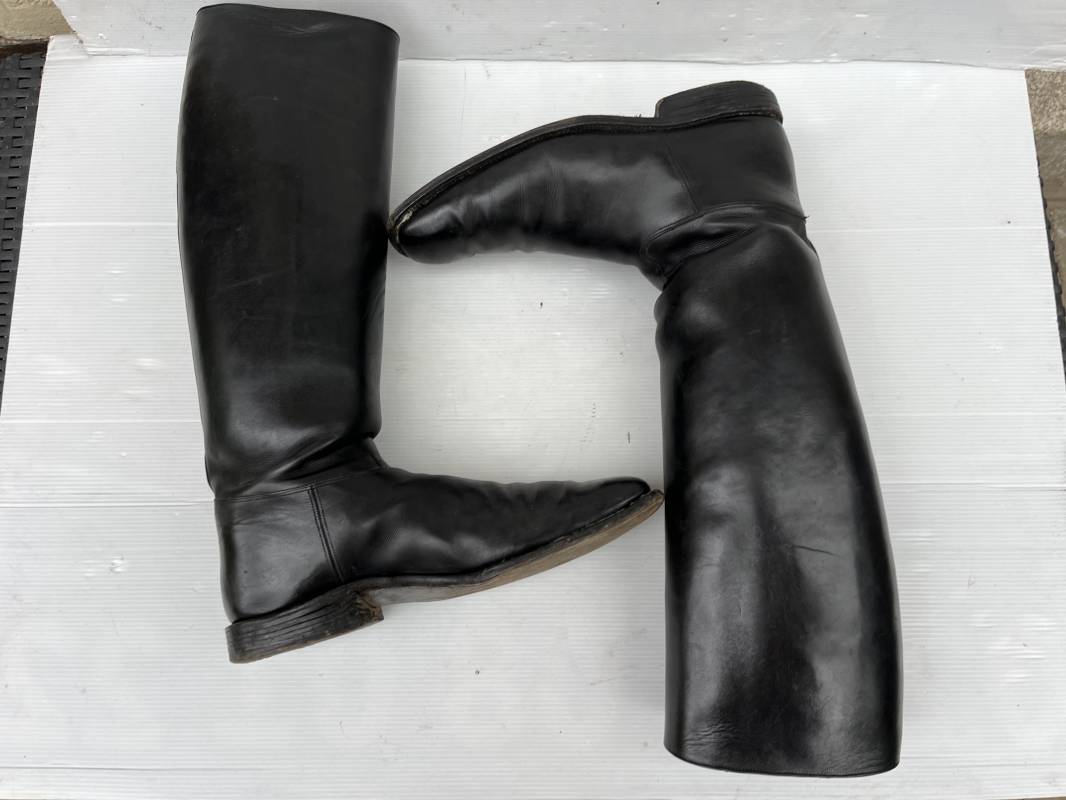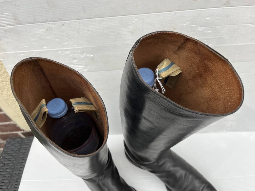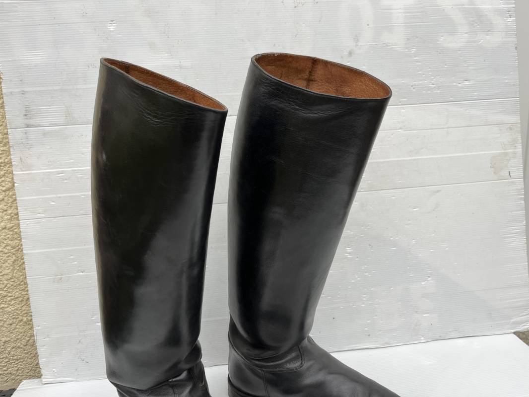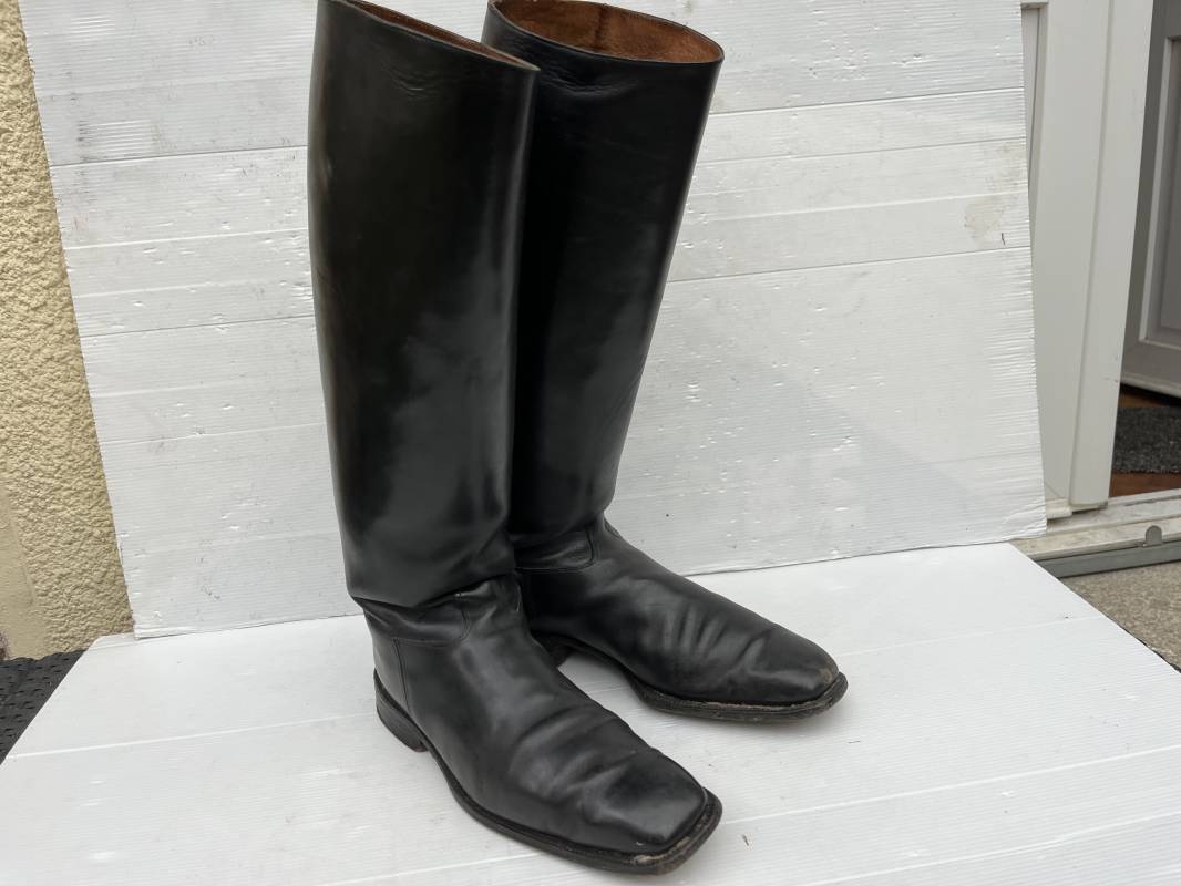 Trés belle paire de bottes d'un officier de la Wehrmacht Tiges dures . Tirettes en toile de coton blanc rayé bleu . Semelles et talons en cuir d'origines . Semelles cousues et talon cloutés . Longueur semelle 30,50 cm . Taille 43/44 environ hauteur botte 44 cm . Cuir souple . Trés belle de bottes légérement portée en trés bel état . 1935/45 Ref 21493