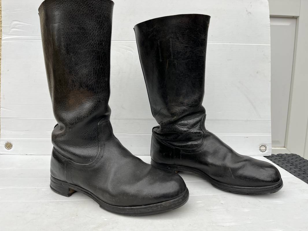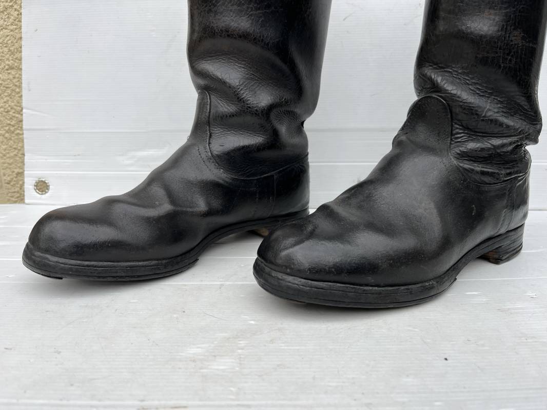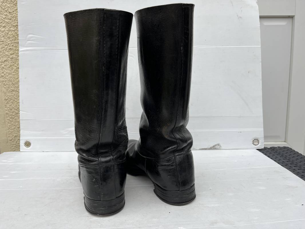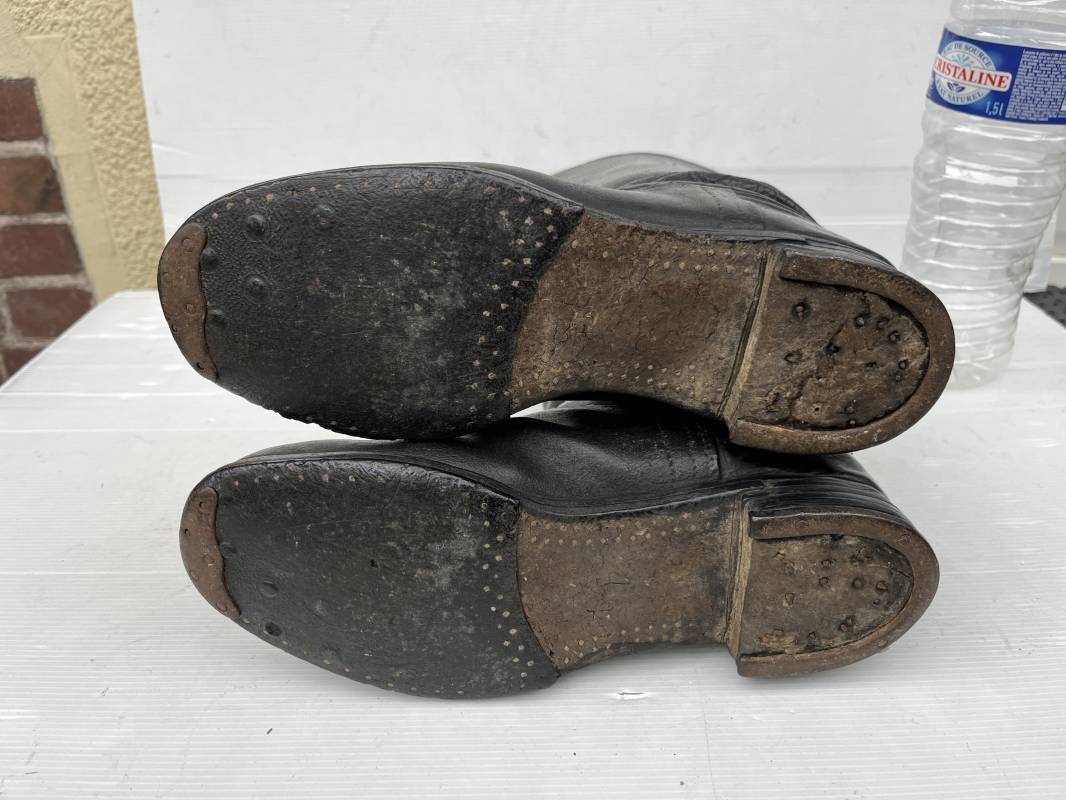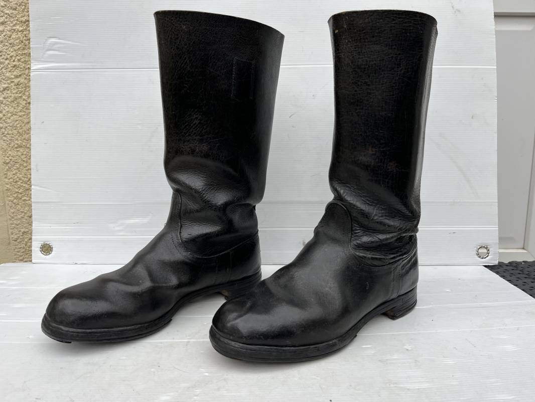 Trés belle paire de bottes troupe non cloutées ( pilote engin , conducteur , tankiste ) en cuir noir . Paire de bottes de marche réglementaires. Tiges en cuir lisse , hauteur 35,5cm Tiges courtes ( knobelbecher) . Empeigne en cuir retourné. Tirettes en toile de coton Semelles caouttchouc d origine chevillé bois et talons fer en U d'origine. Longueur 30cm (pointure 43). Semelles chevillée bois. Marquages encre en hauts des tiges intérieurs illisibles . Cuir souple. Bottes portées en bel état . Ref 21414