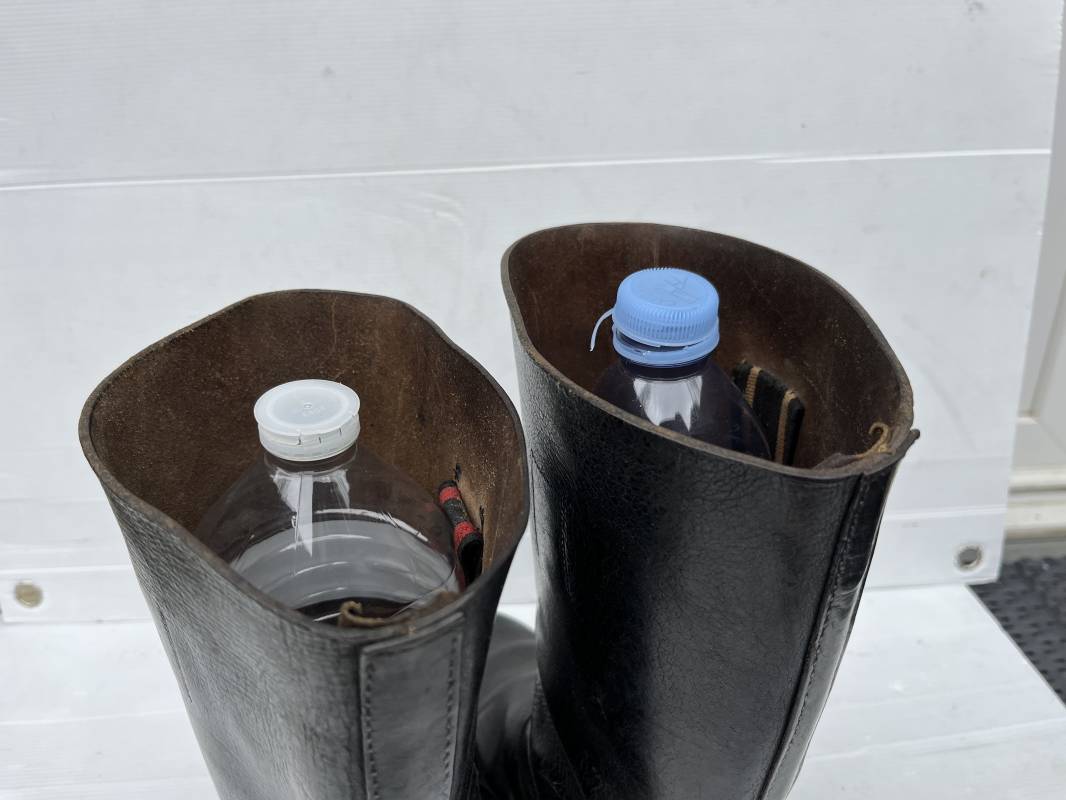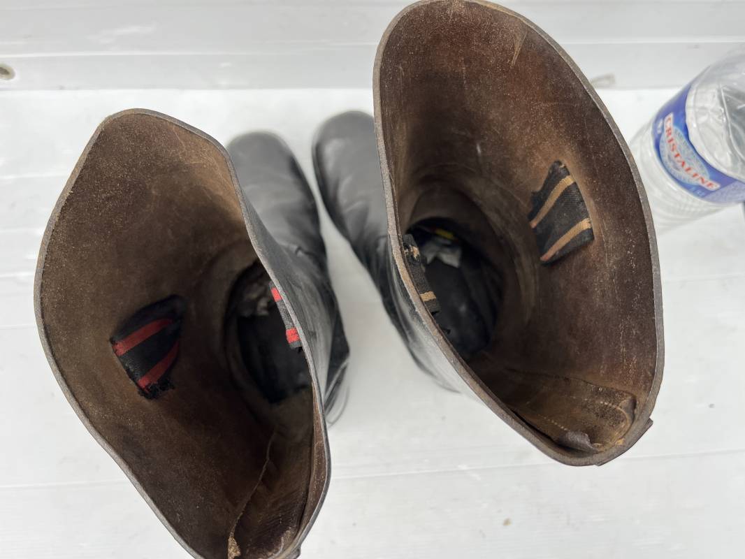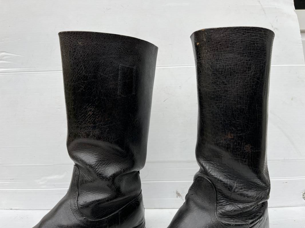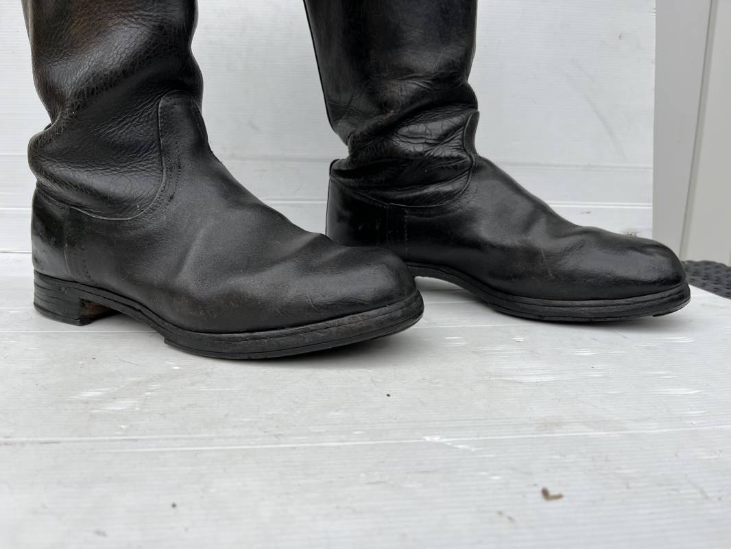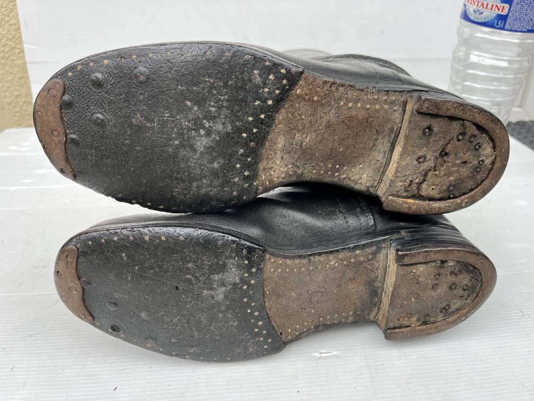 Trés belle paire de bottes troupe non cloutées ( pilote engin , conducteur , tankiste ) en cuir noir . Paire de bottes de marche réglementaires. Tiges en cuir lisse , hauteur 35,5cm Tiges courtes ( knobelbecher) . Empeigne en cuir retourné. Tirettes en toile de coton Semelles caouttchouc d origine chevillé bois et talons fer en U d'origine. Longueur 30cm (pointure 43). Semelles chevillée bois. Marquages encre en hauts des tiges intérieurs illisibles . Cuir souple. Bottes portées en bel état . Ref 21414