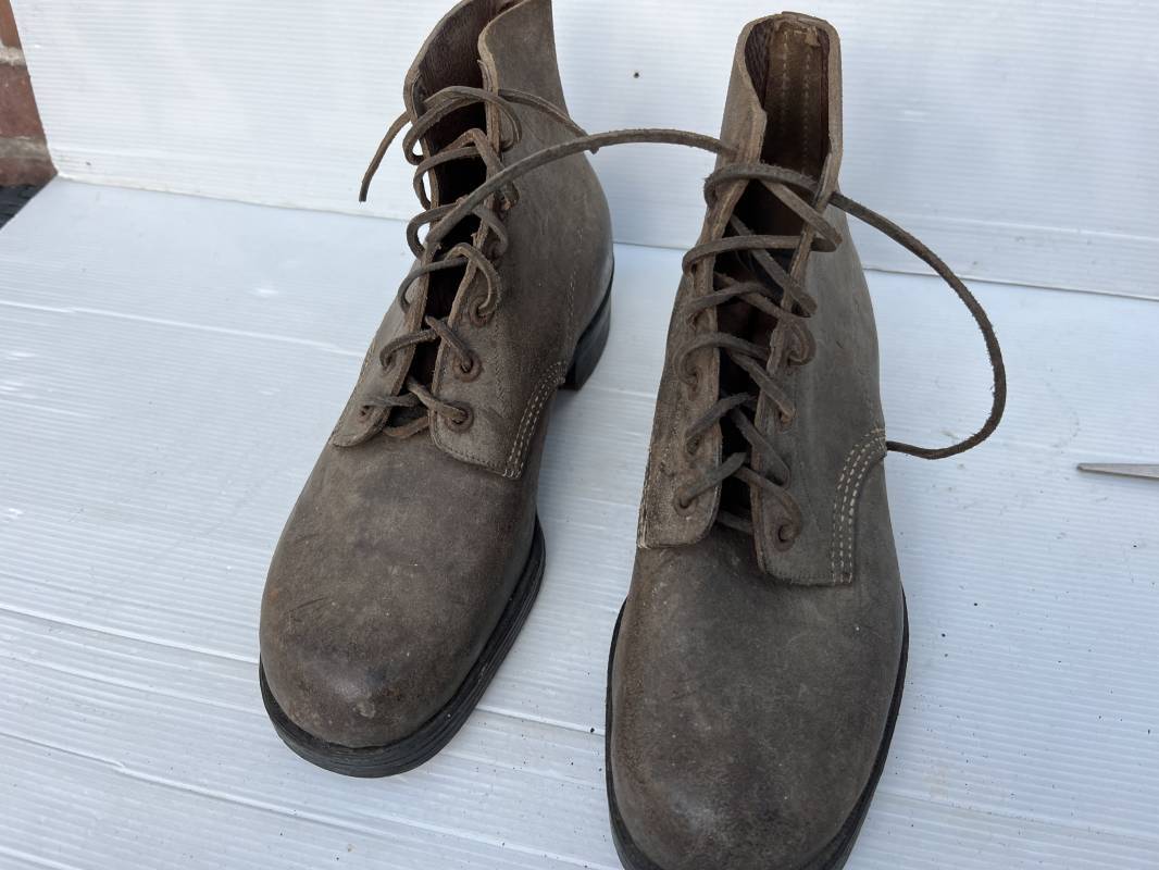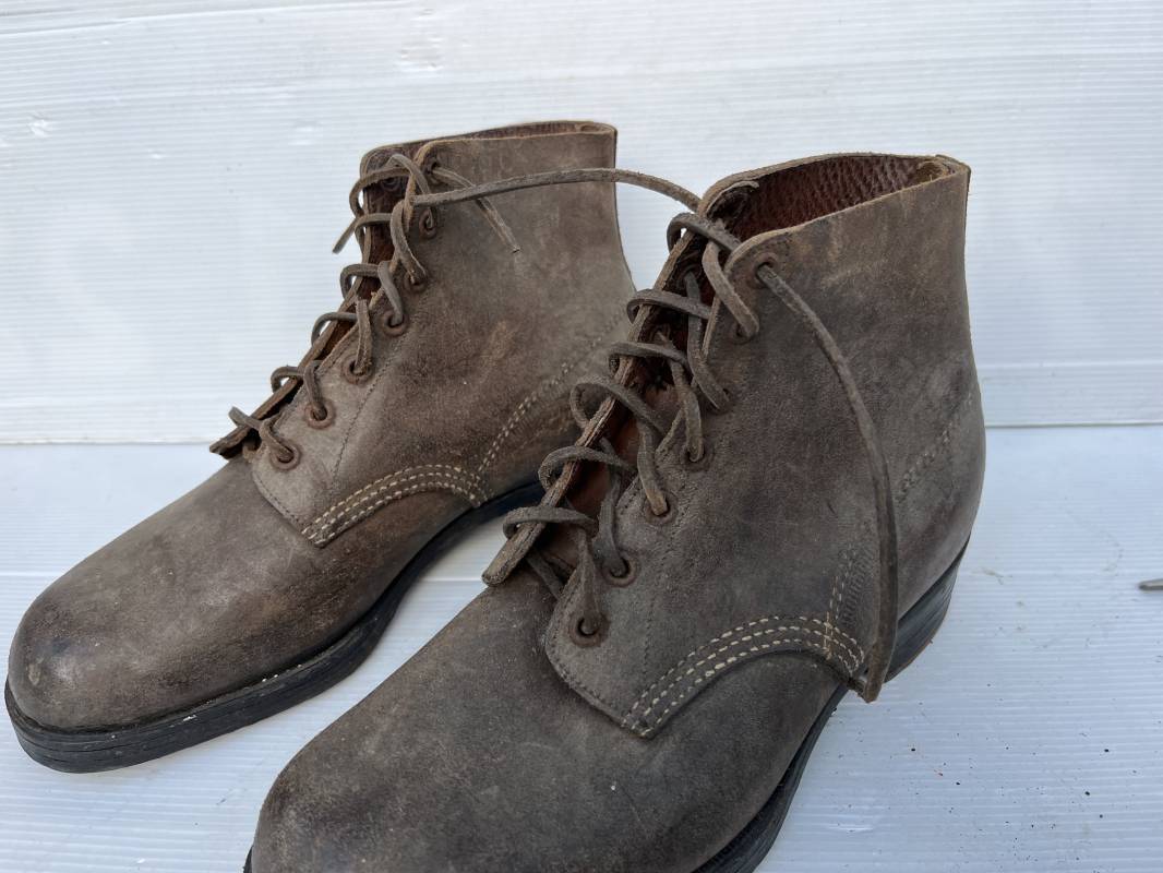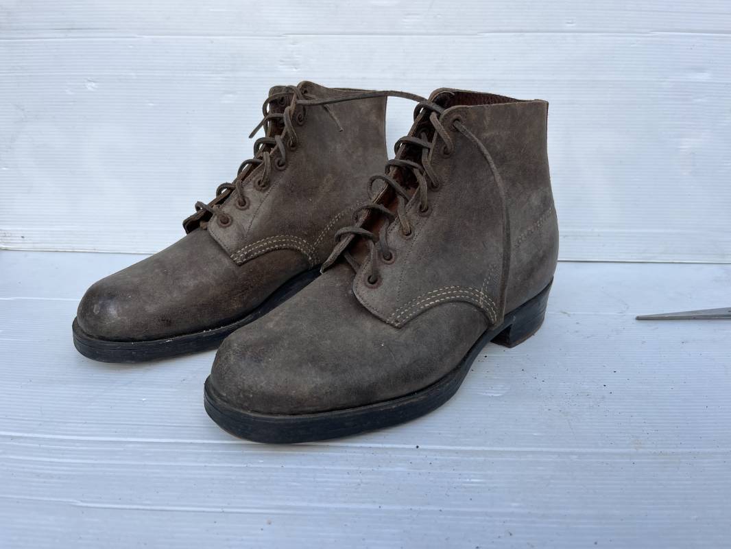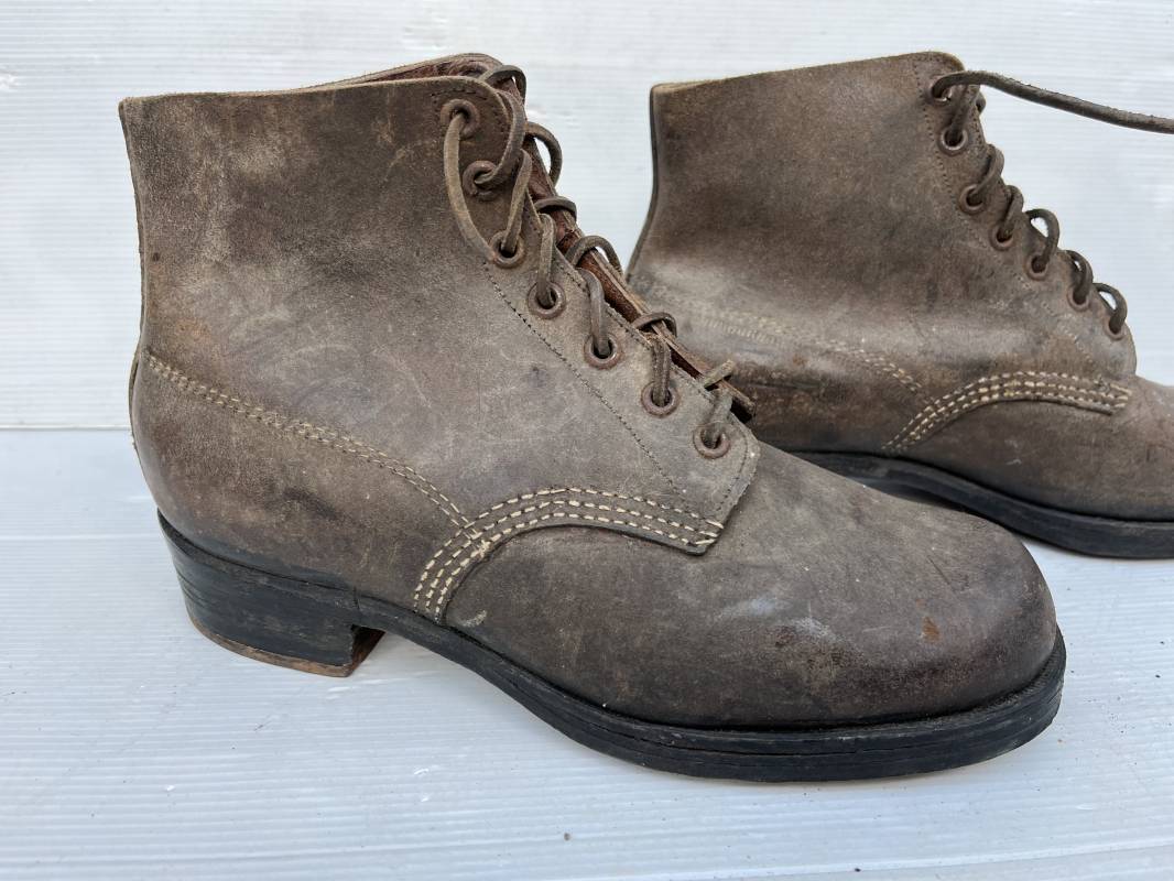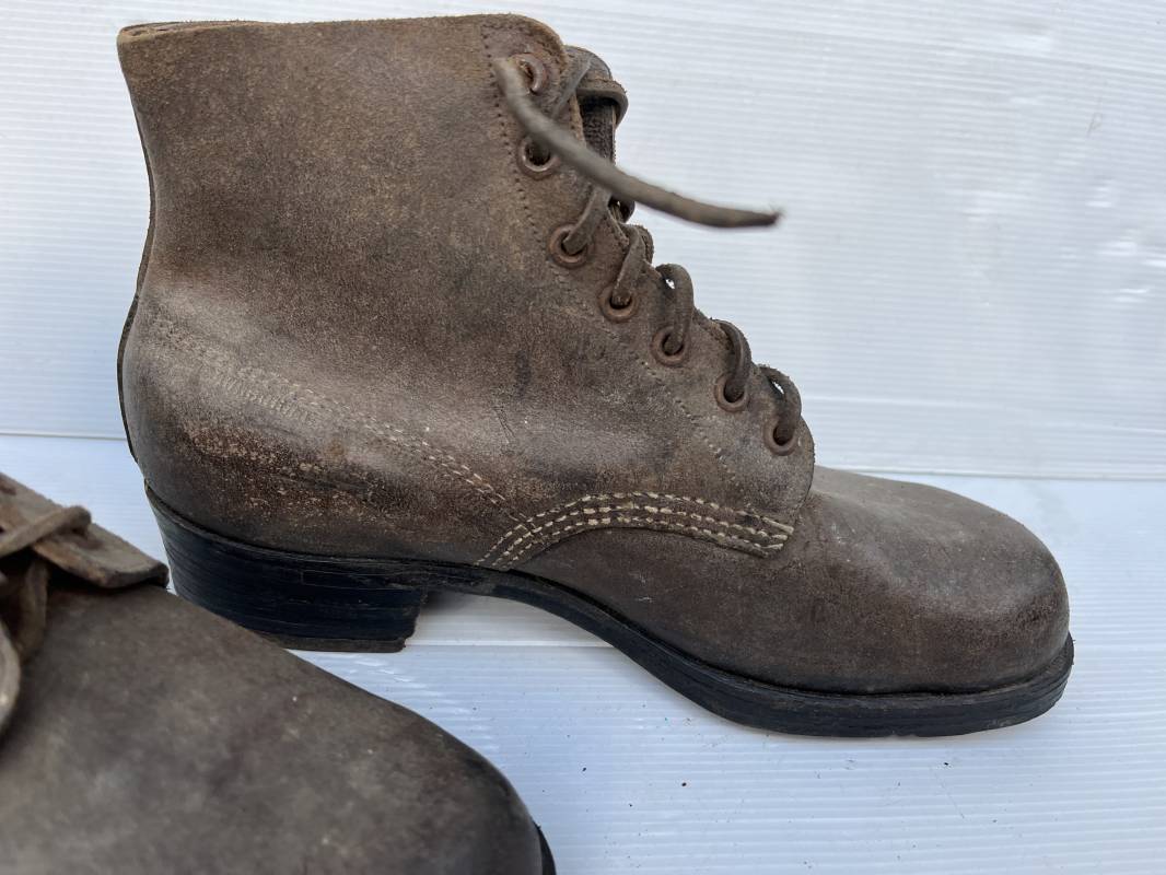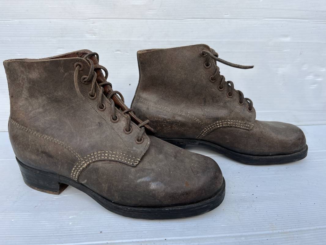 Trés belle paire d ebrodequins cloutés de la Wehrmacht en cuir retourné marron . Sept oeillets métalliques , lacets en cuir cuir d 'origine trouvé avec les brodequins ( a noté un lacet est cassé) . Marquages a l'intérieur de chaque haut de tiges 41 81/2 3690 1 . Hauteur tige 16 cm . Semelles et talons d 'origine en cuir chevillé bois , cloutage d 'origine renforts avant en métal , talons avec fer en U Matquage sous semelles 41 81/2 690 . Logueur semelle 28 cm Pointure 41 . Cuir souple . Paire dans un état quasi neuf , jamais ciré . . Tres belle paire de brodequins de dotation dans un état de conservation exceptionnel 1941/45 Ref 22313