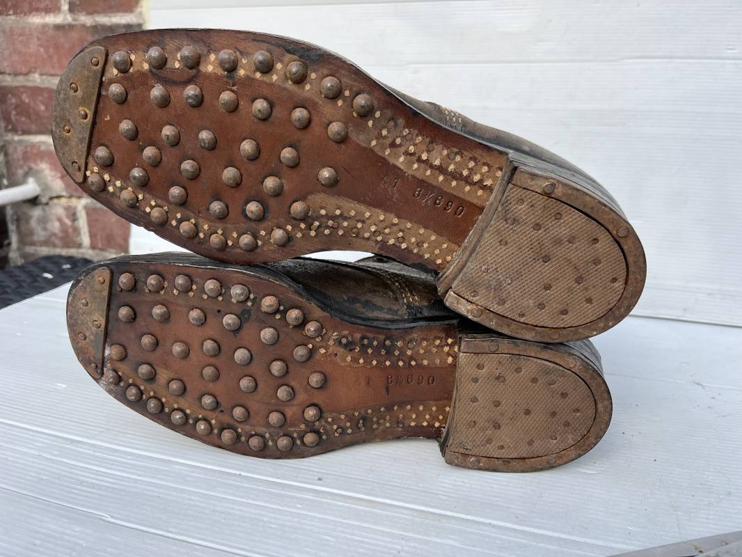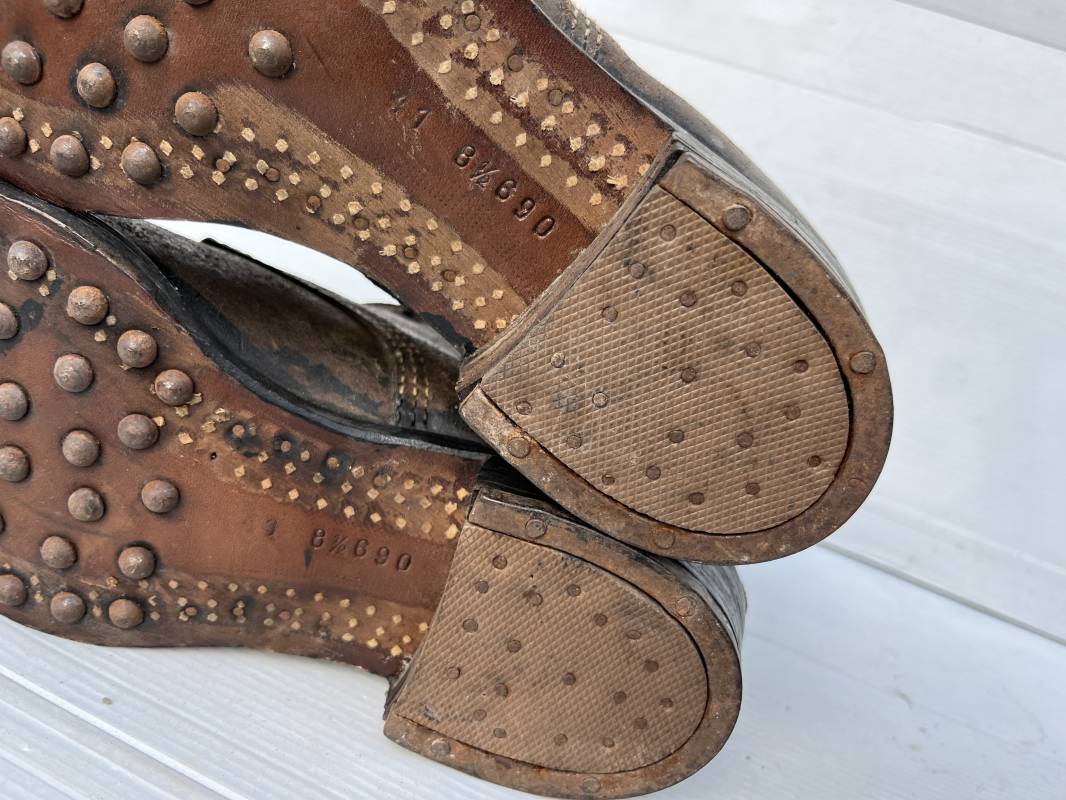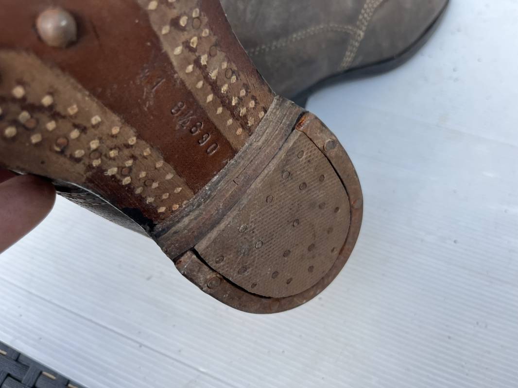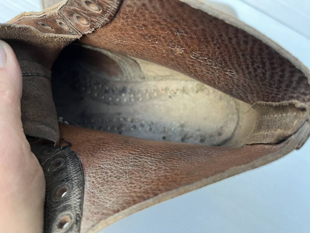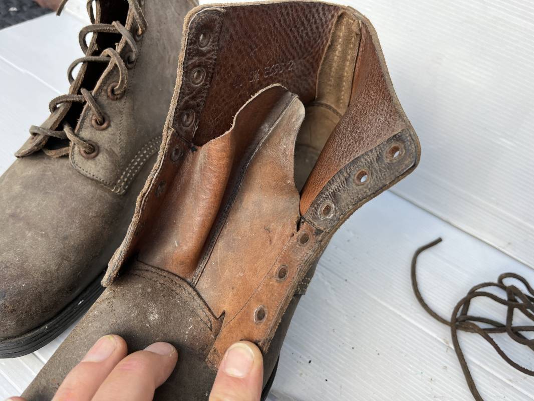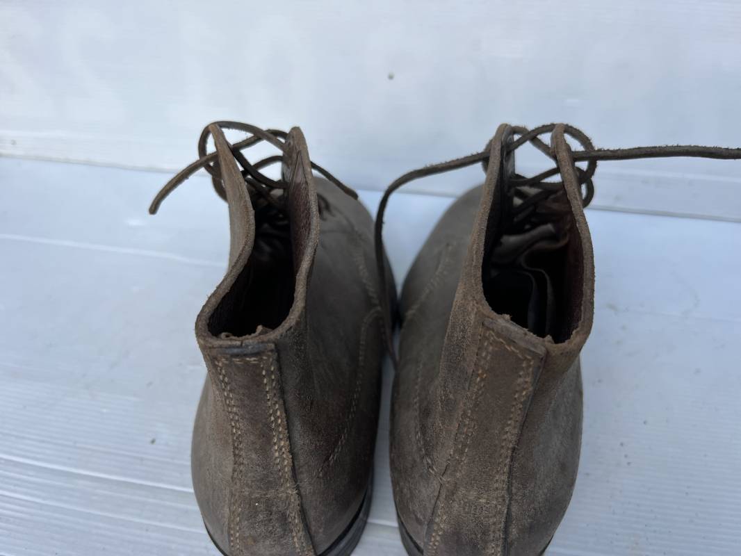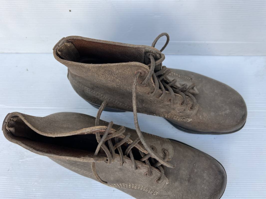 Trés belle paire d ebrodequins cloutés de la Wehrmacht en cuir retourné marron . Sept oeillets métalliques , lacets en cuir cuir d 'origine trouvé avec les brodequins ( a noté un lacet est cassé) . Marquages a l'intérieur de chaque haut de tiges 41 81/2 3690 1 . Hauteur tige 16 cm . Semelles et talons d 'origine en cuir chevillé bois , cloutage d 'origine renforts avant en métal , talons avec fer en U Matquage sous semelles 41 81/2 690 . Logueur semelle 28 cm Pointure 41 . Cuir souple . Paire dans un état quasi neuf , jamais ciré . . Tres belle paire de brodequins de dotation dans un état de conservation exceptionnel 1941/45 Ref 22313