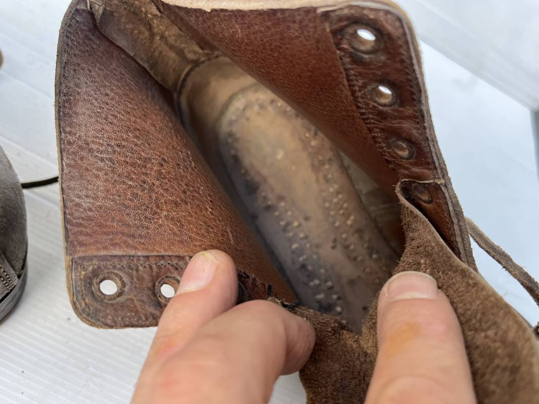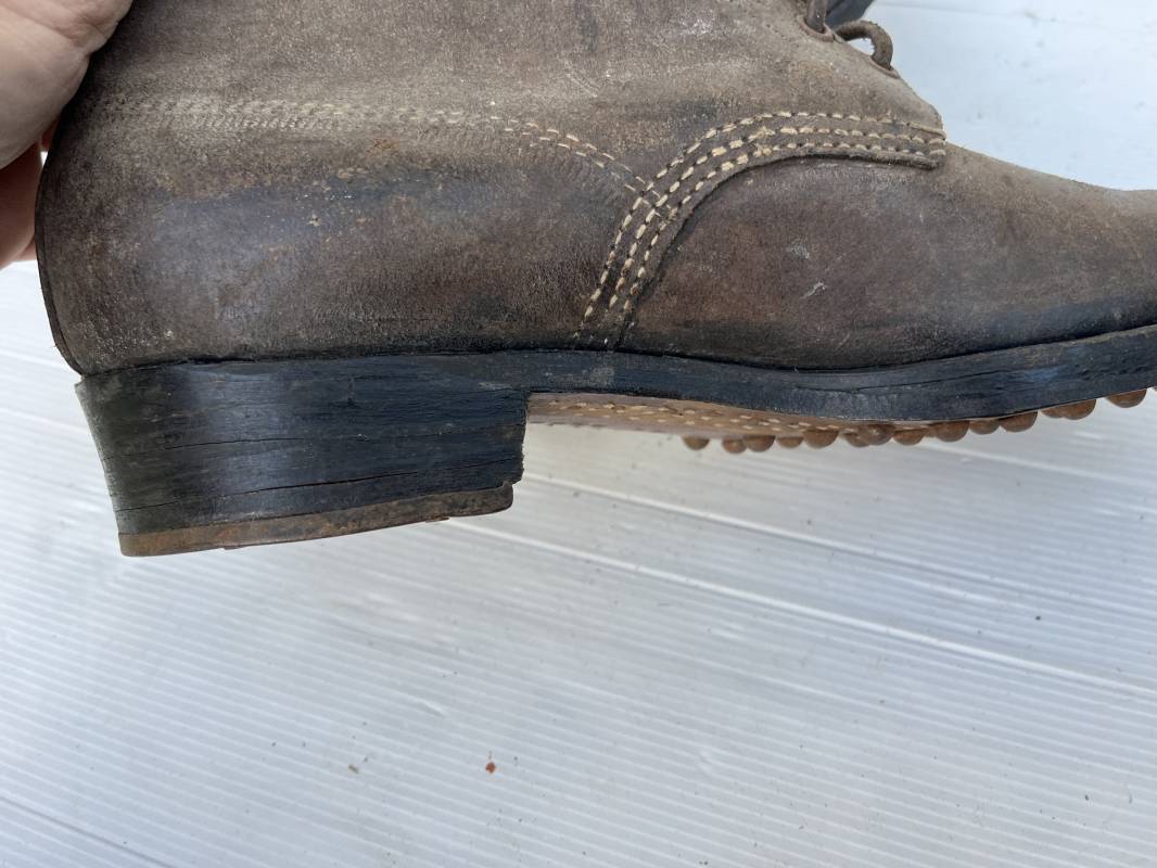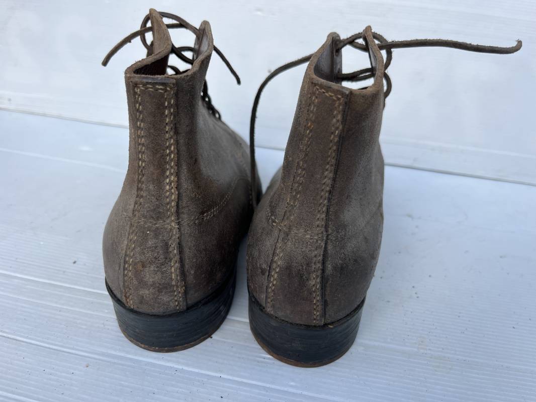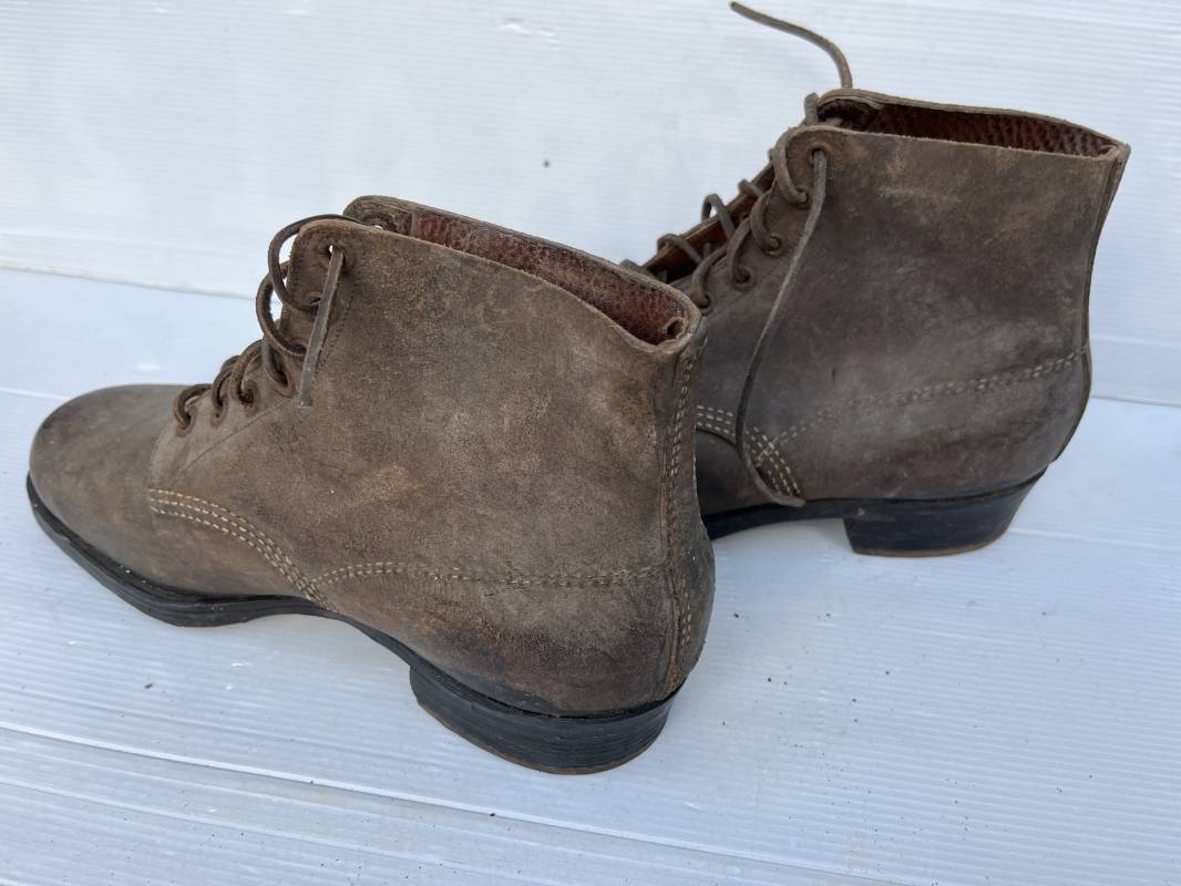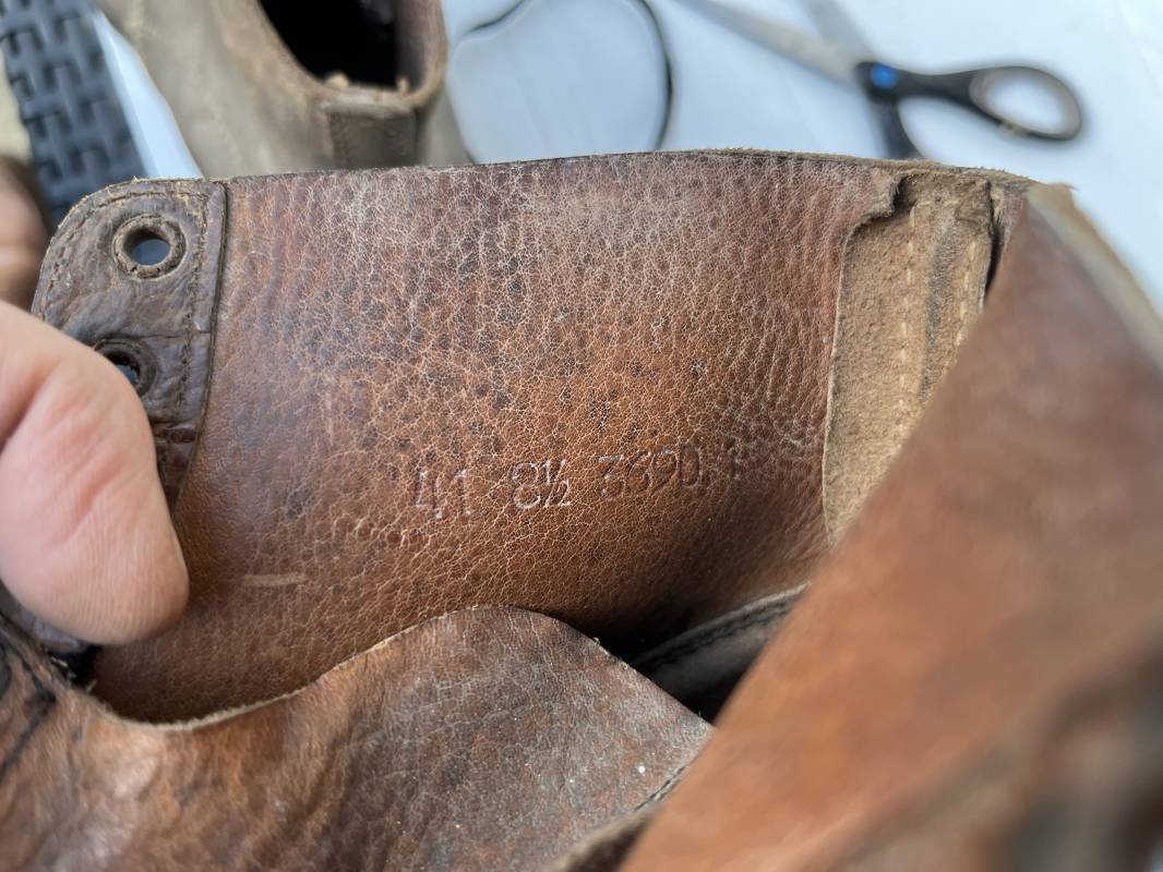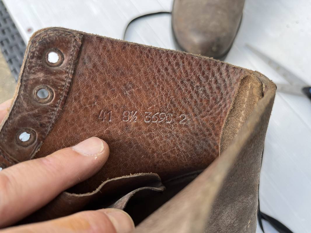 Trés belle paire d ebrodequins cloutés de la Wehrmacht en cuir retourné marron . Sept oeillets métalliques , lacets en cuir cuir d 'origine trouvé avec les brodequins ( a noté un lacet est cassé) . Marquages a l'intérieur de chaque haut de tiges 41 81/2 3690 1 . Hauteur tige 16 cm . Semelles et talons d 'origine en cuir chevillé bois , cloutage d 'origine renforts avant en métal , talons avec fer en U Matquage sous semelles 41 81/2 690 . Logueur semelle 28 cm Pointure 41 . Cuir souple . Paire dans un état quasi neuf , jamais ciré . . Tres belle paire de brodequins de dotation dans un état de conservation exceptionnel 1941/45 Ref 22313