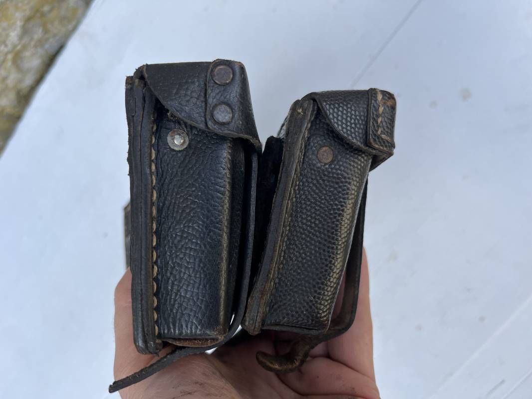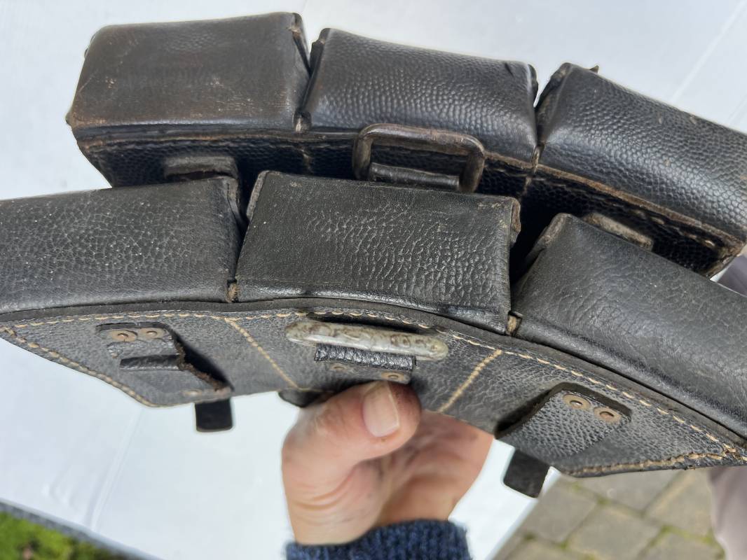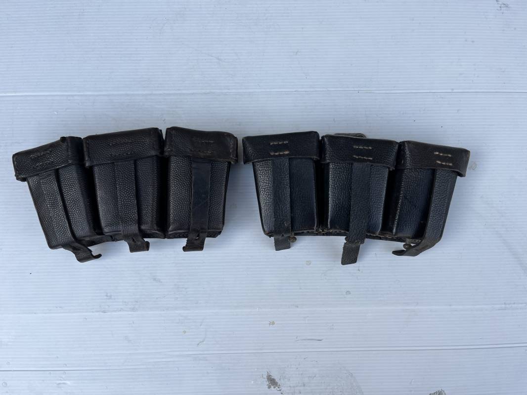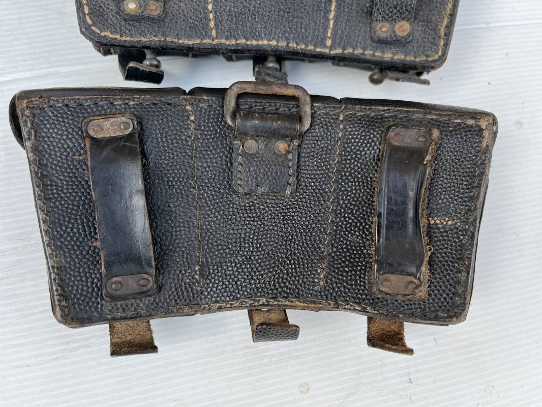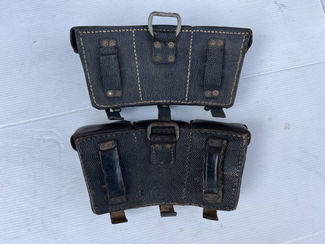 Trés belle paire de cartouchières 98 K en cuir noir grenelé . fabrication milieau de guerre cousue et rivetée . Passants cuir de ceinturon , passant métallique de fixation des bretelles . Rivets métalliques . Pas de marquage . Séparations intérieures présentes . Tres belle paire homogéne légérement portée en parfait état 1941/43 Ref 19814