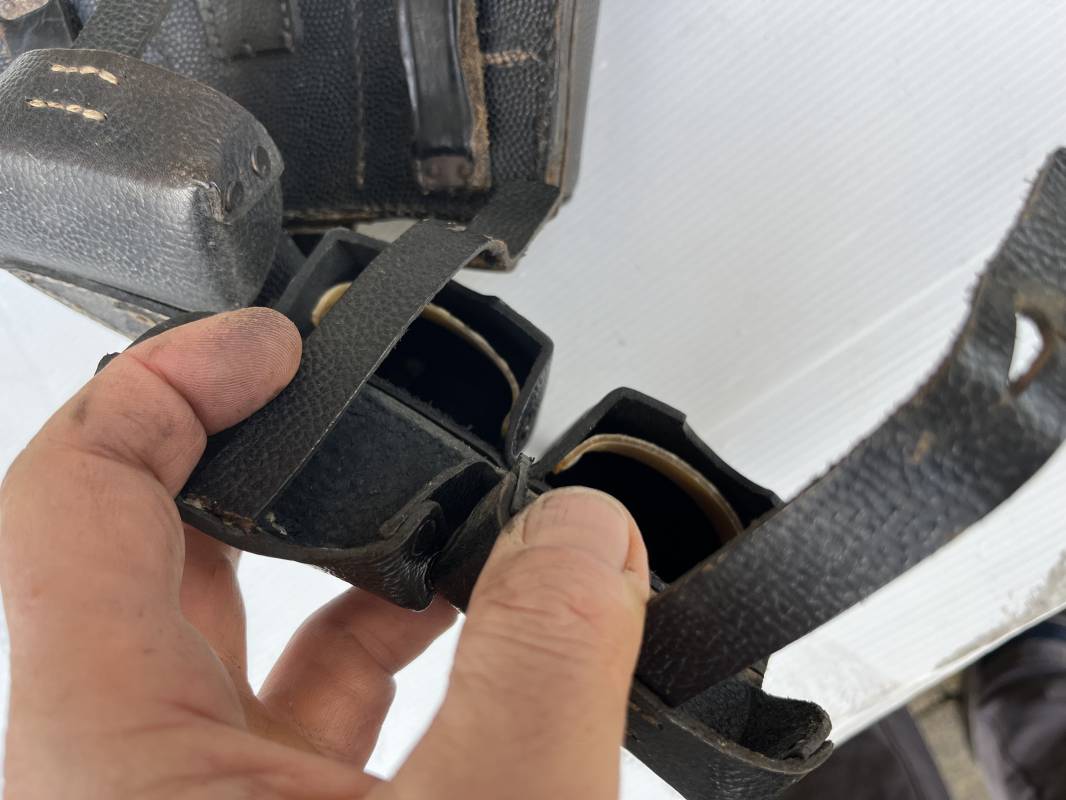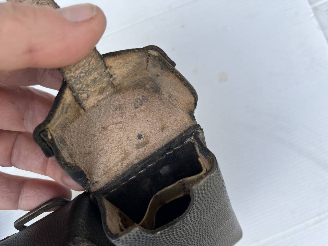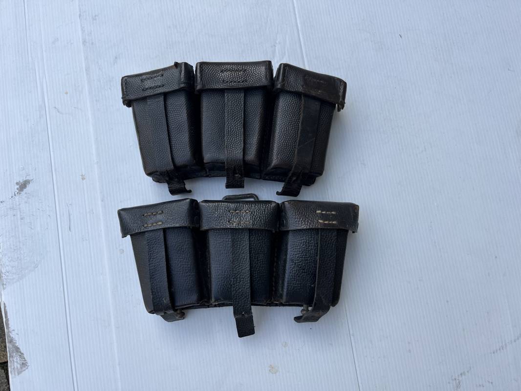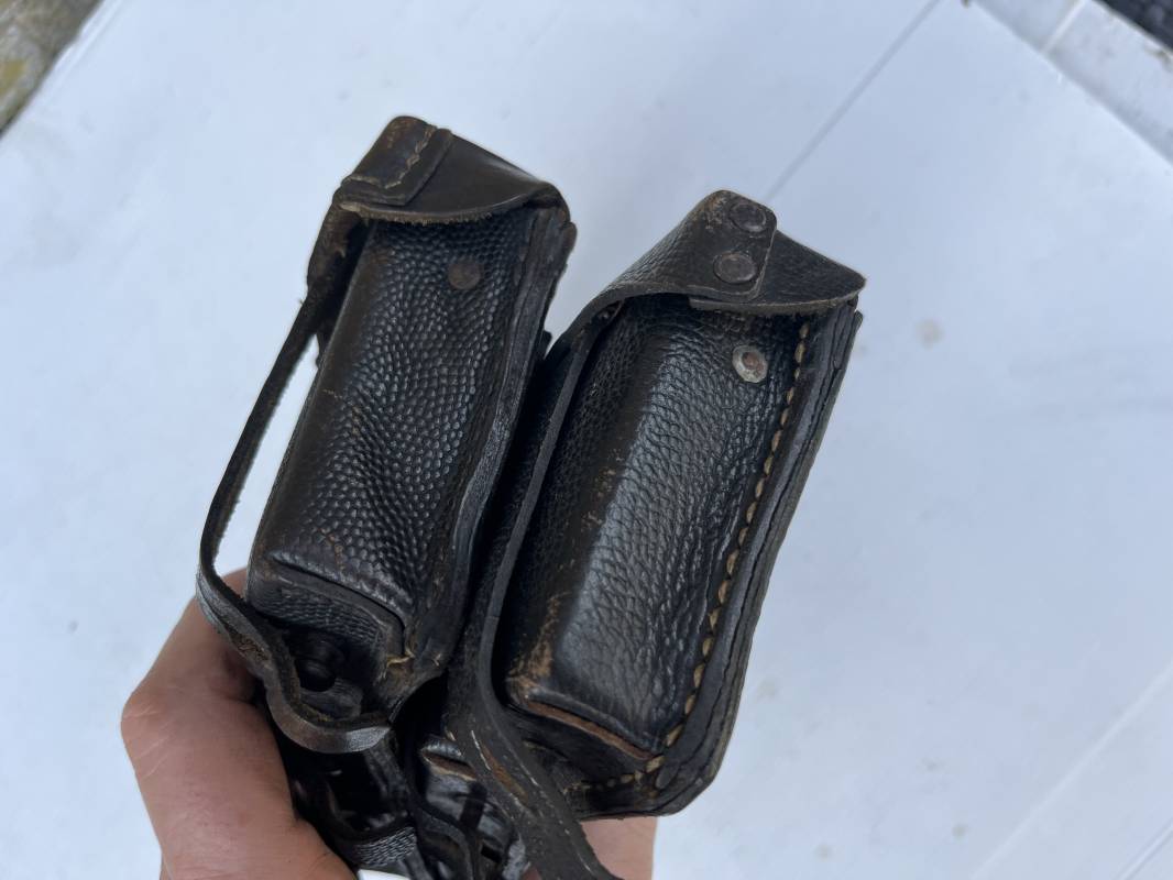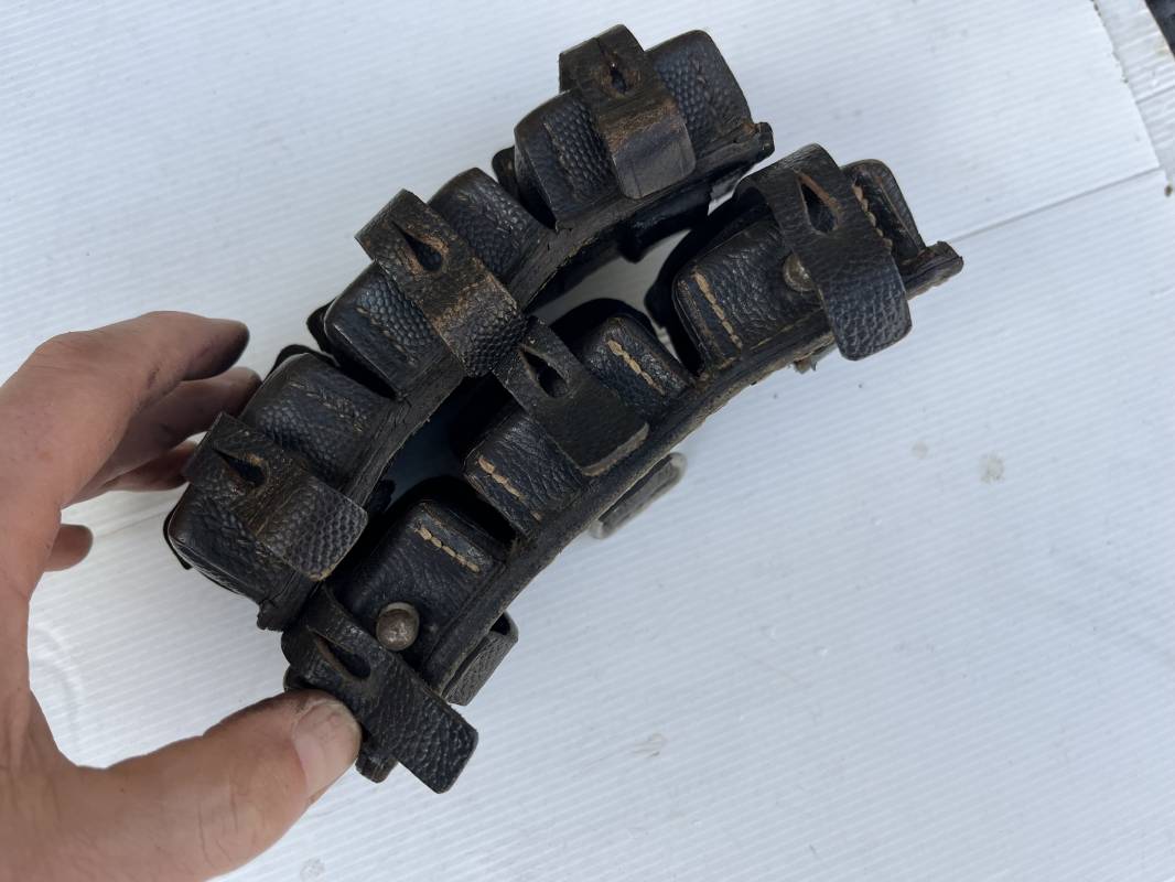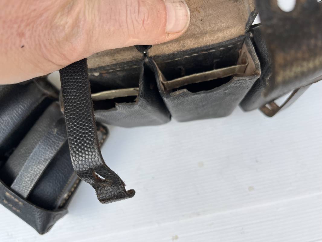 Trés belle paire de cartouchières 98 K en cuir noir grenelé . fabrication milieau de guerre cousue et rivetée . Passants cuir de ceinturon , passant métallique de fixation des bretelles . Rivets métalliques . Pas de marquage . Séparations intérieures présentes . Tres belle paire homogéne légérement portée en parfait état 1941/43 Ref 19814