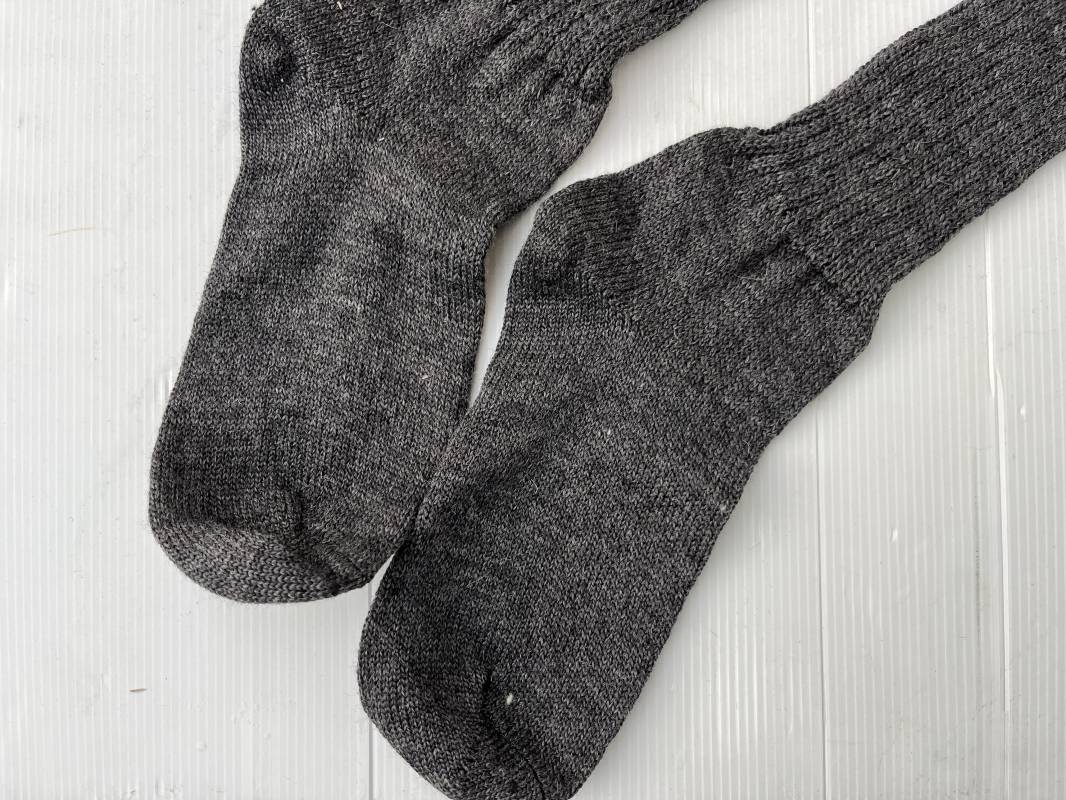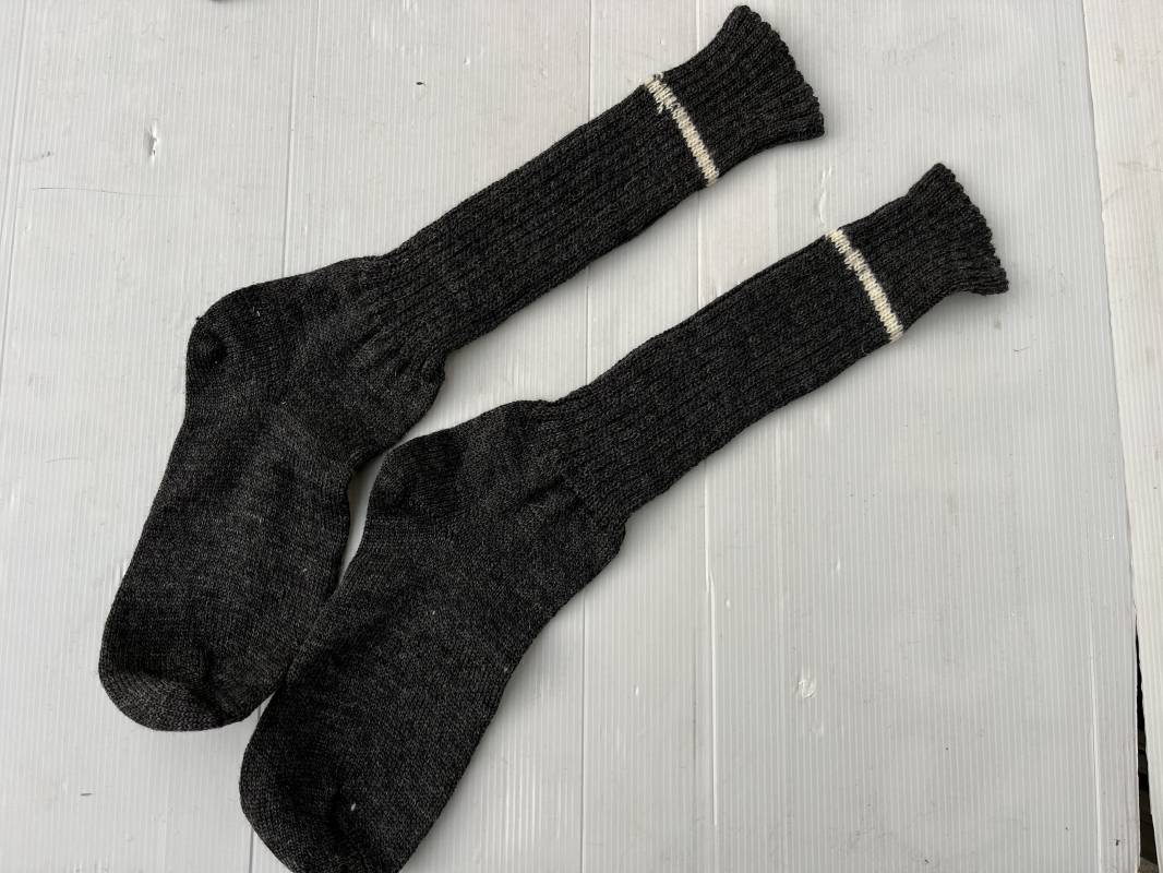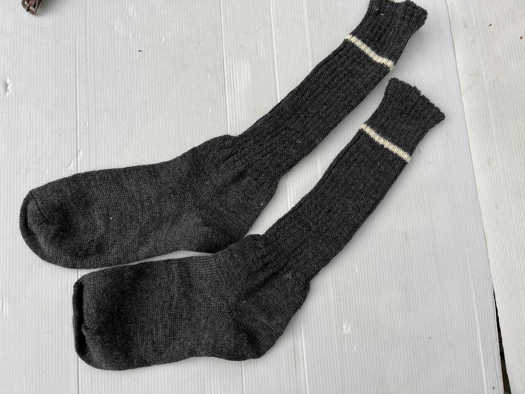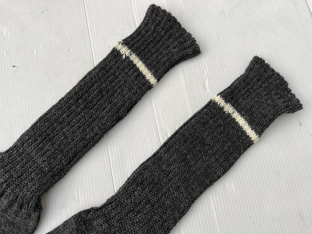 Trés belle paire de chaussettes de dotation de la Wehrmacht . Paire de chaussettes en laine grise . Bande de taille I en laine blanche . Pointure 40/42 . Trés légèrement porté en parfait état 1940/45 Ref 21413