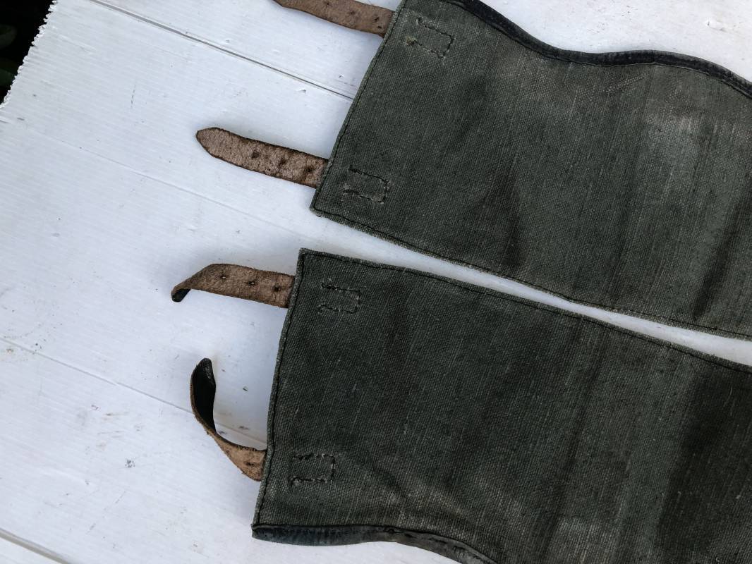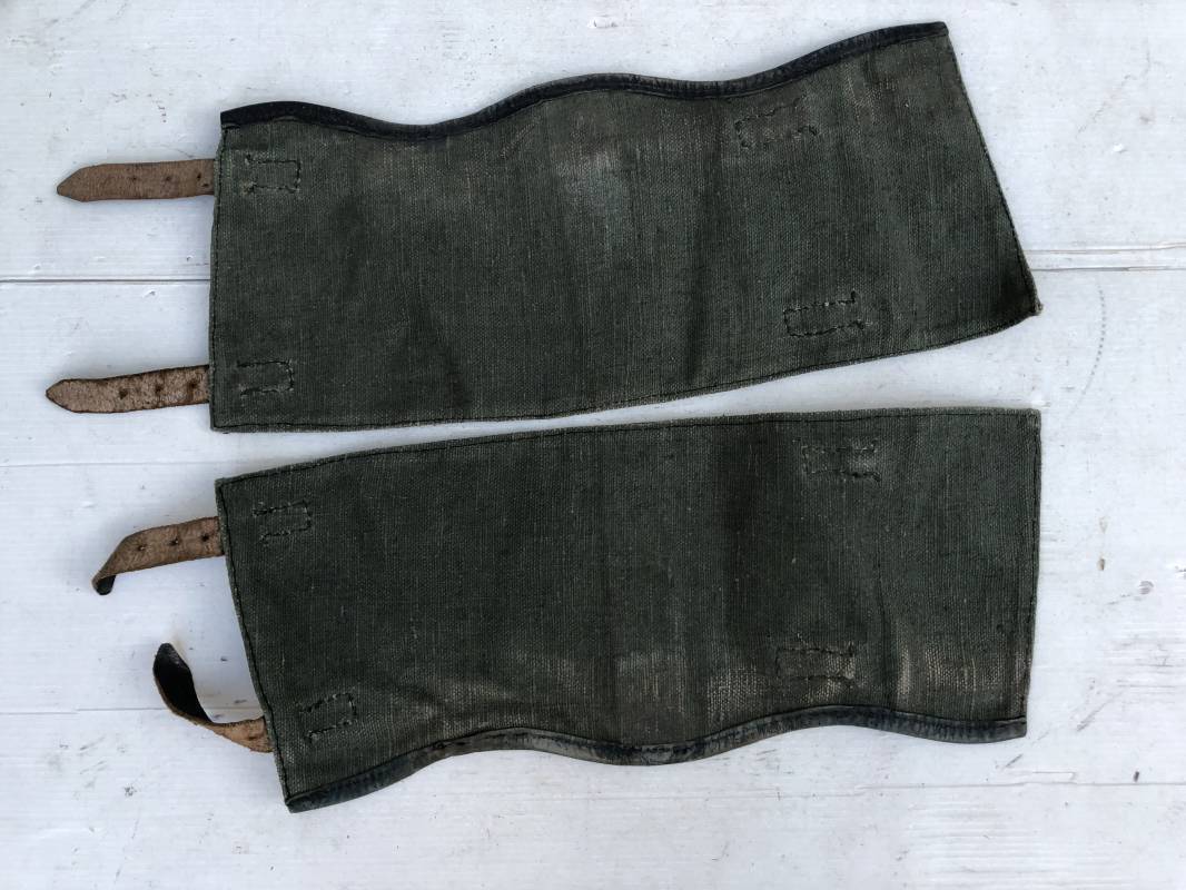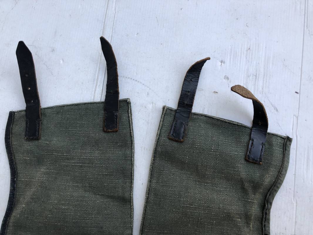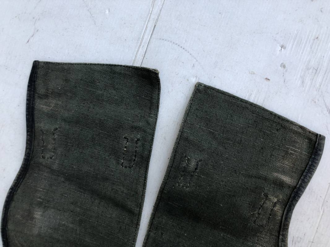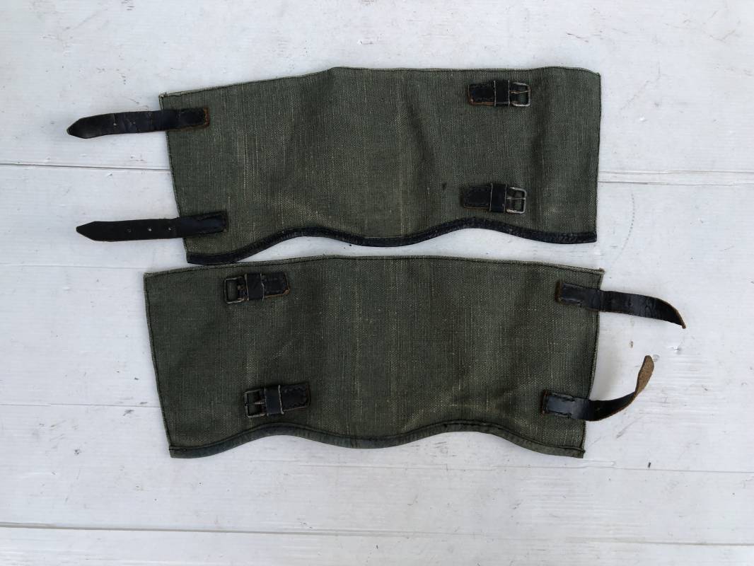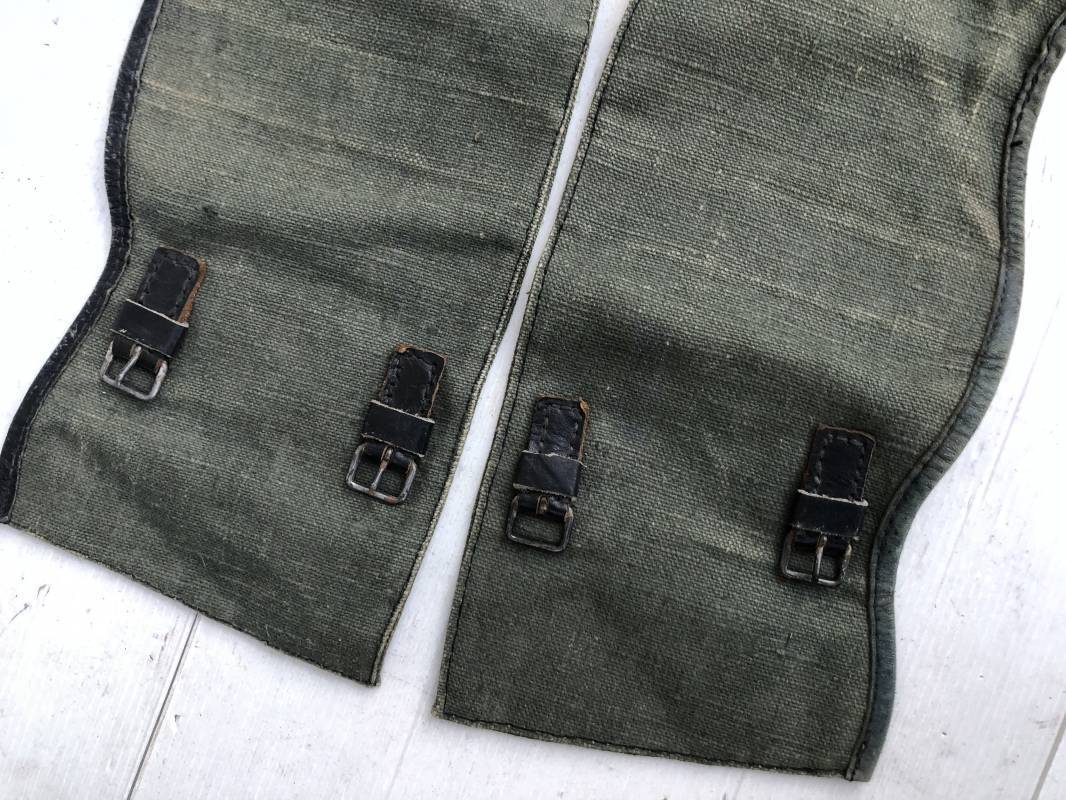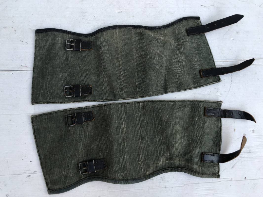 Belle paire de guètres en toile verte de la Wehrmacht . Guètres réglementaires avec renforts et lanières en cuir noir . Boucles métalliques a un ardillon . Paire homogéne du méme fabricant , légérement portée en parfait état . Ref 15077