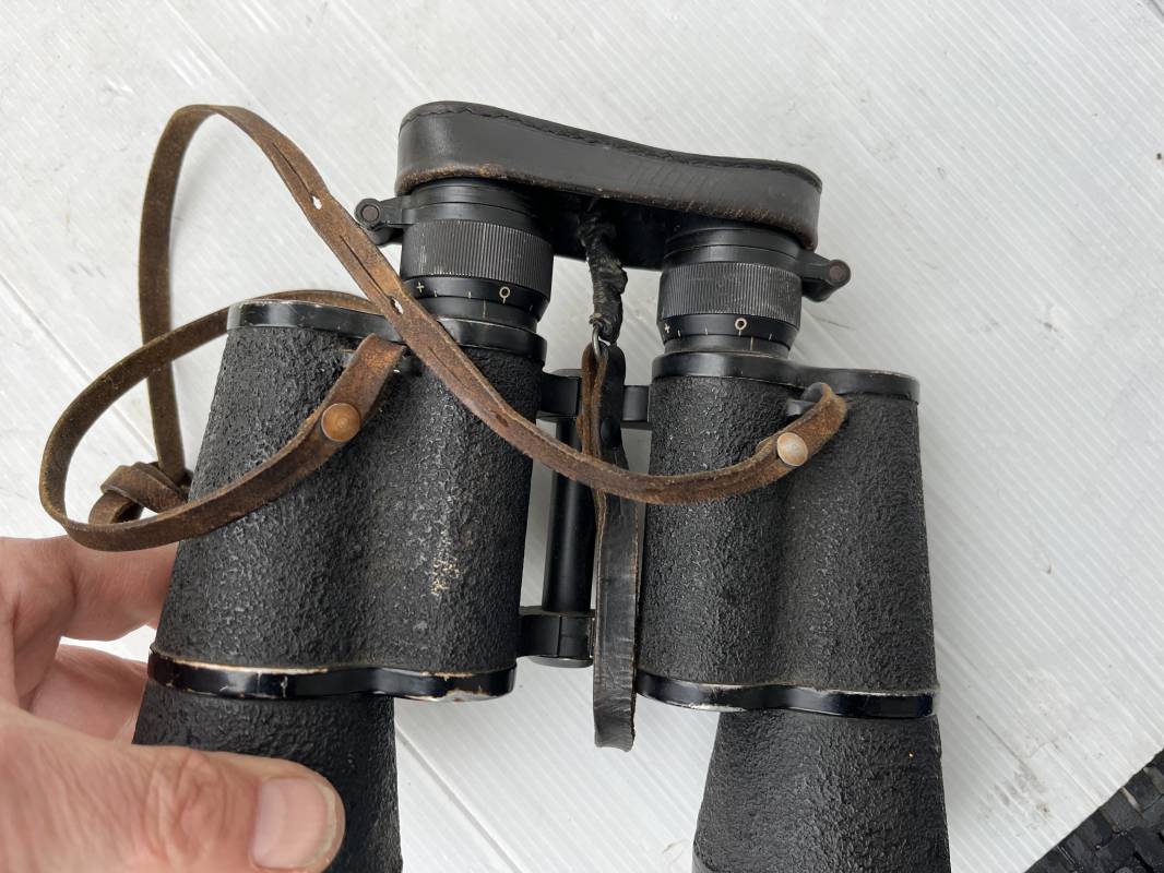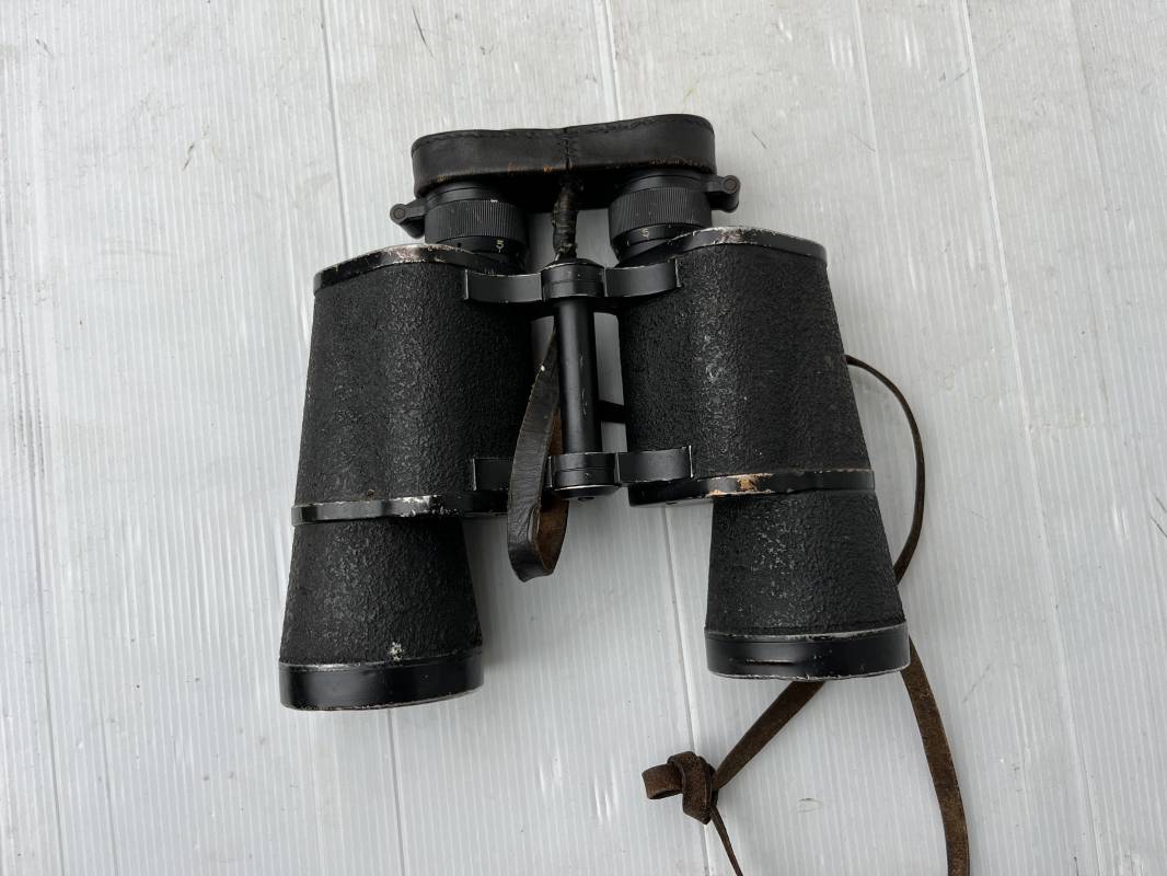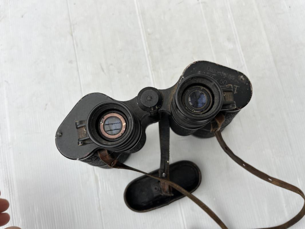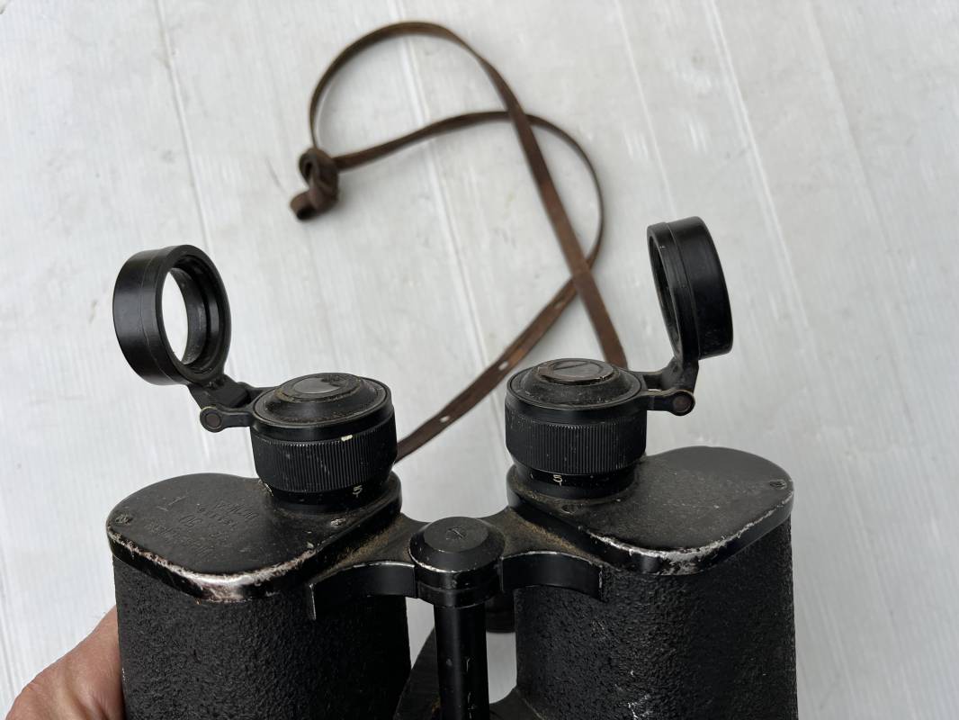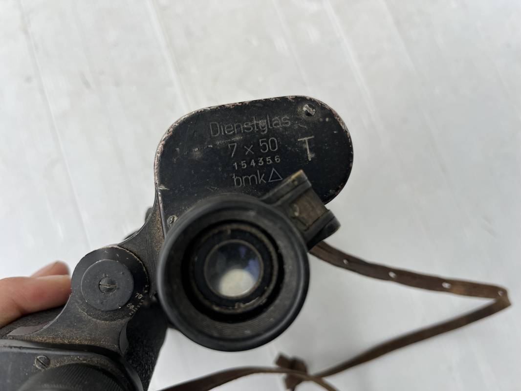 Belle paire de jumelles 7X50 de dotation Dienst glass , peinture granuleuse noire d'origine. Marquage matricule. Fabricant bmk , optiques en bon état. Réticule coté droite . Protéges optiques à bascule pour le port de filtres . Sangle cuir et rivets, Protége optique en cuir avec lanière de maintient en cuir noir . Bel ensemble homogène . Porté en bel état 1940/45. Ref 17073